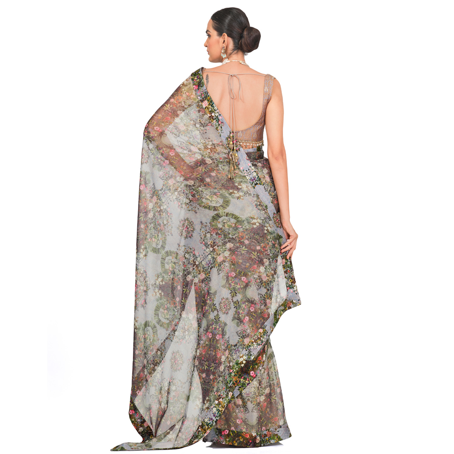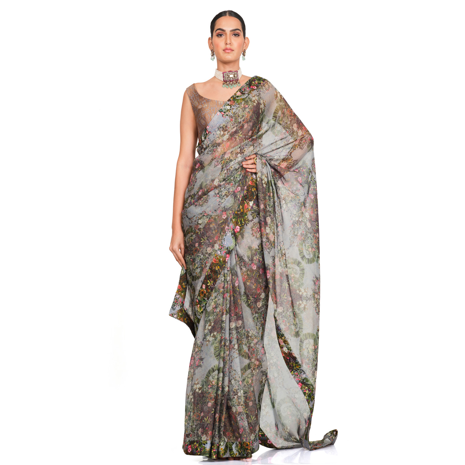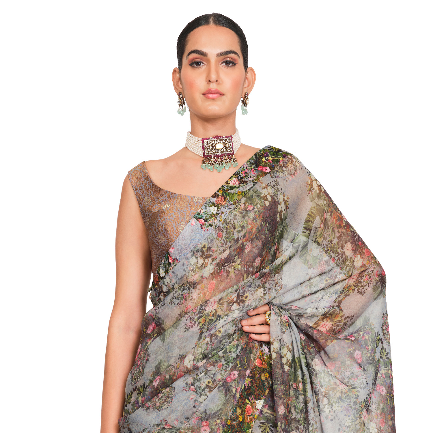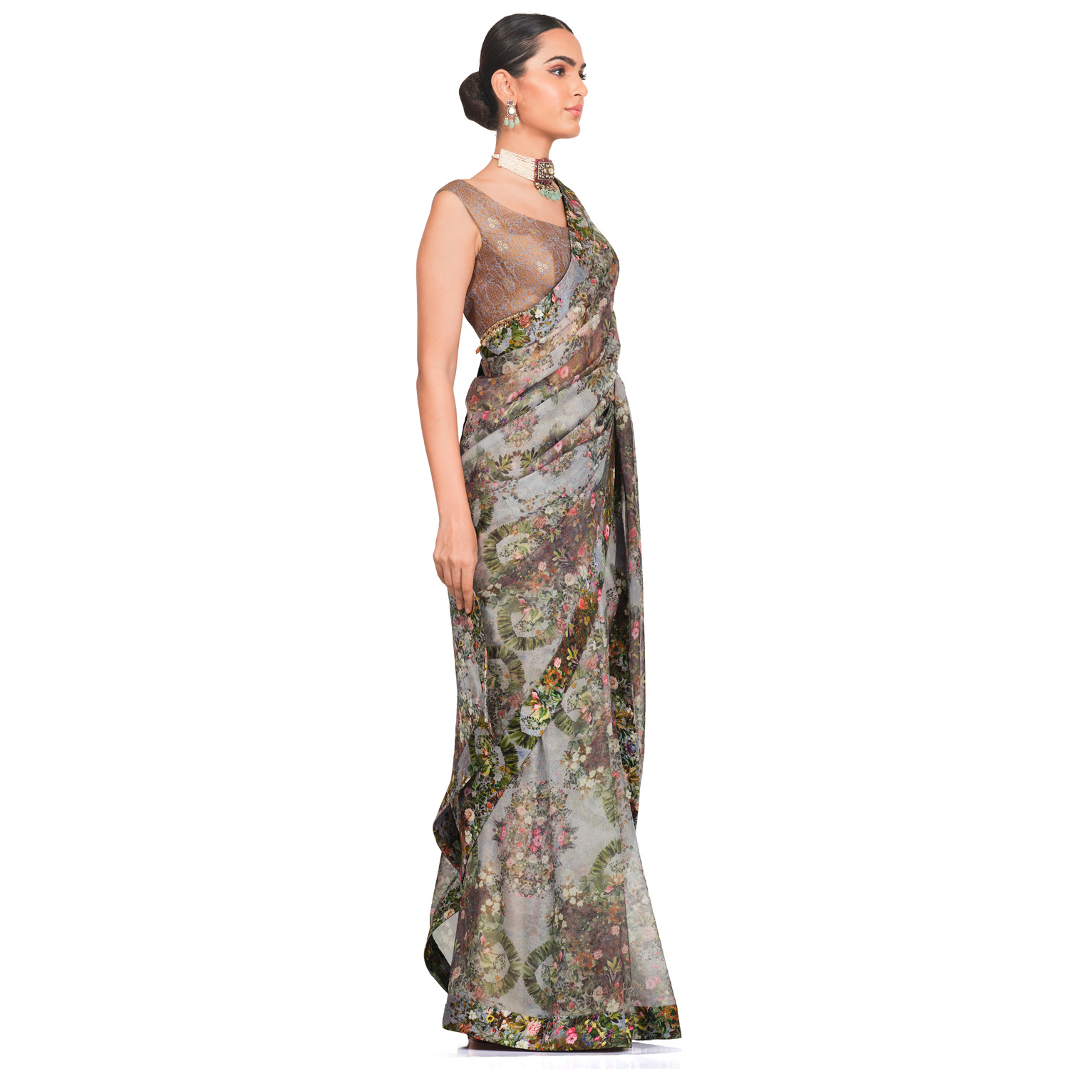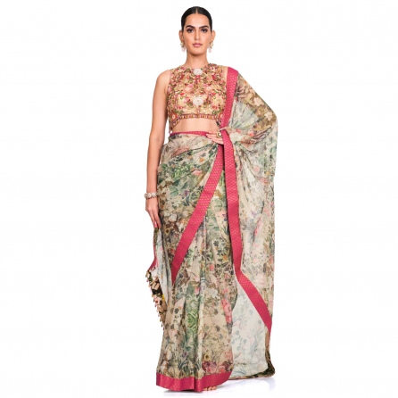 This saree is made from lightweight and sheer organza fabric with a beautiful multicolor print. The blouse is crafted from brocade fabric and is sleeveless, making it a contemporary choice. The set includes an underskirt to provide a secure base for draping the saree. Pair this saree with gold jewellery and a clutch for weddings or festivities.