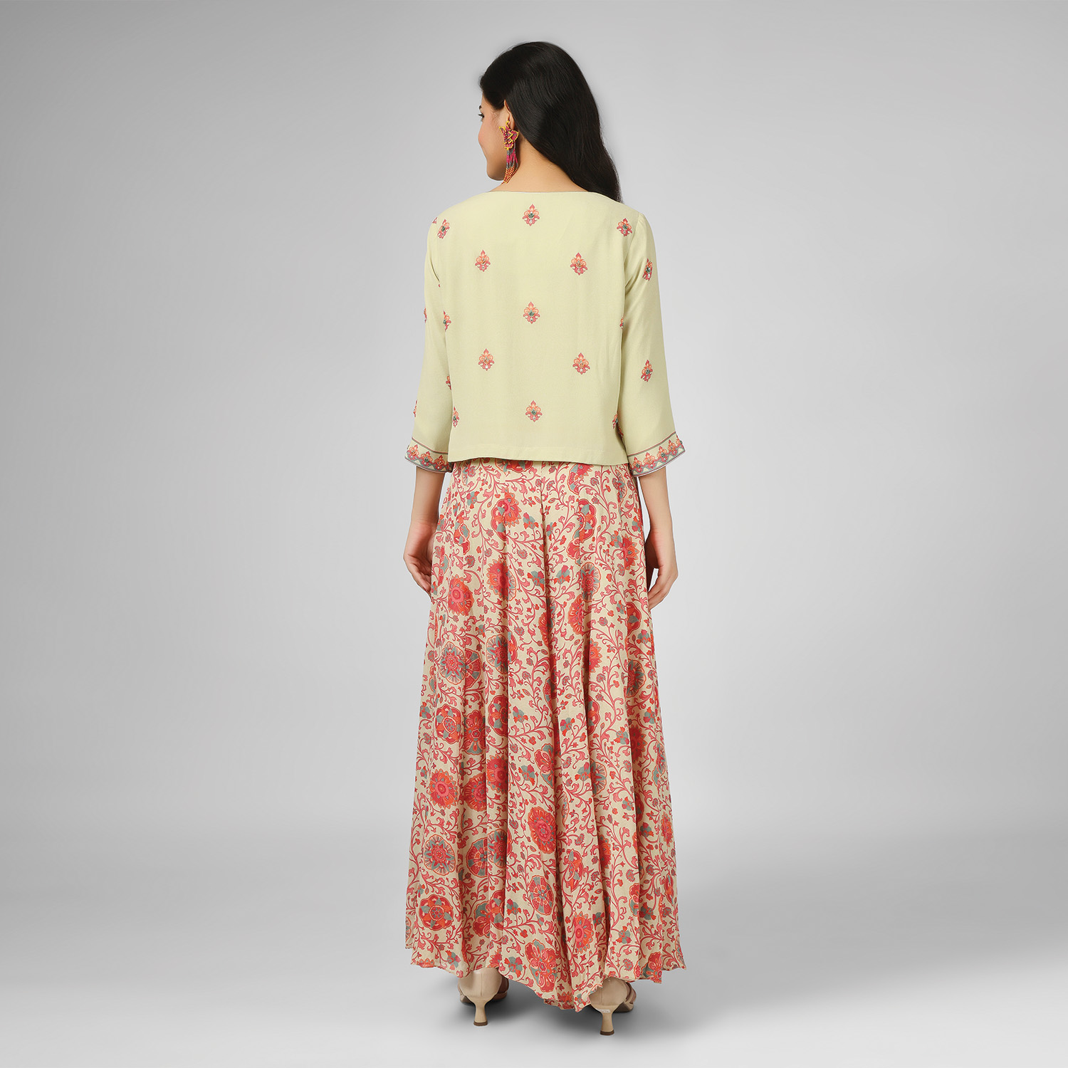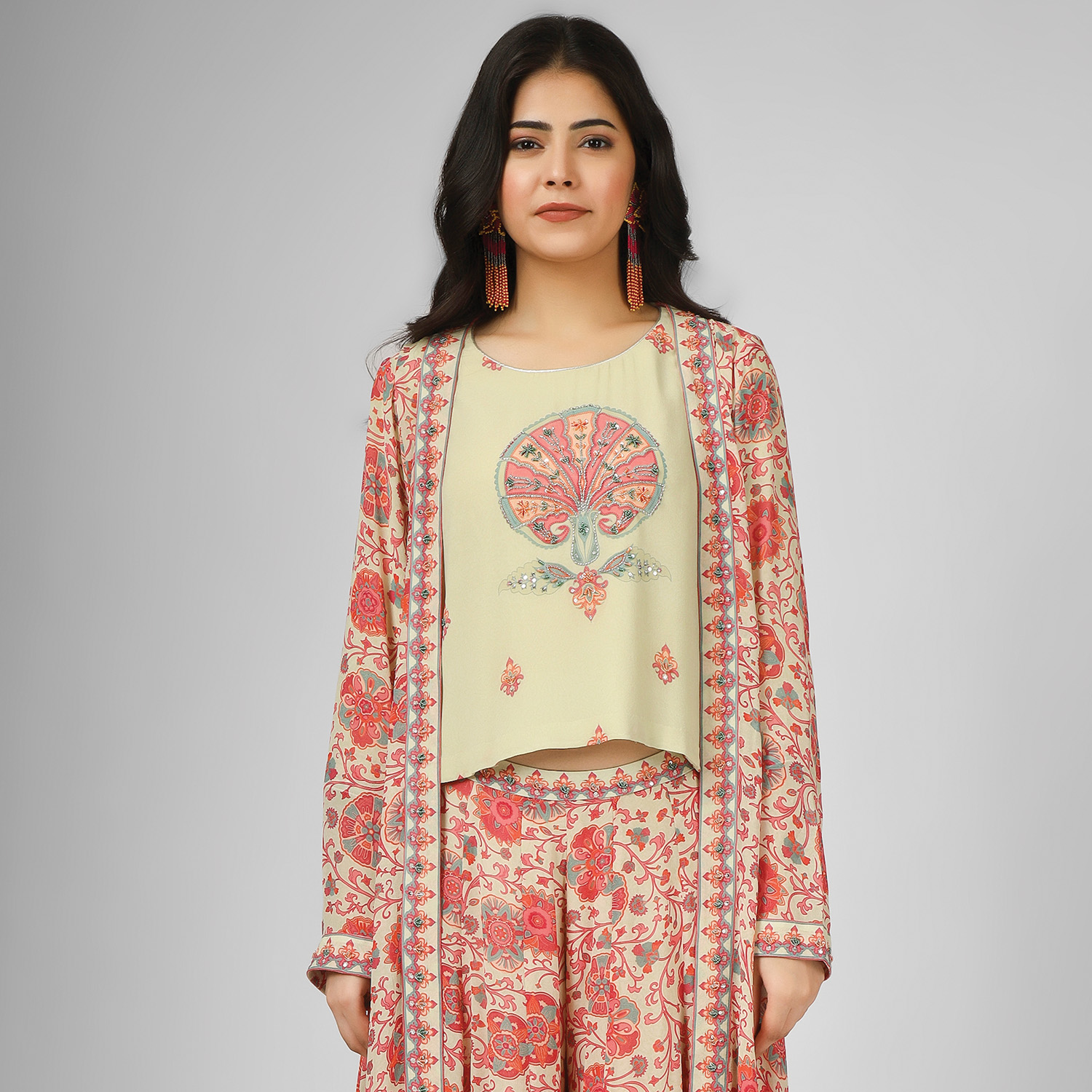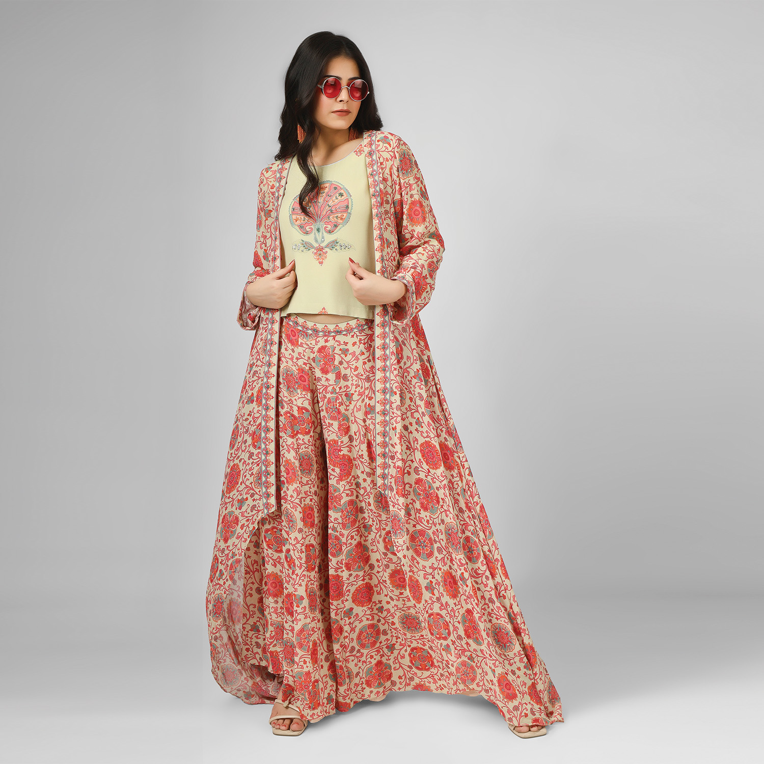 This set is crafted from high-quality silk georgette fabric. This set includes a digitally printed silk georgette jacket with a georgette top and matching printed palazzo pants, creating a coordinated and chic look. Pair it with statement earrings and heels for a dressy event.