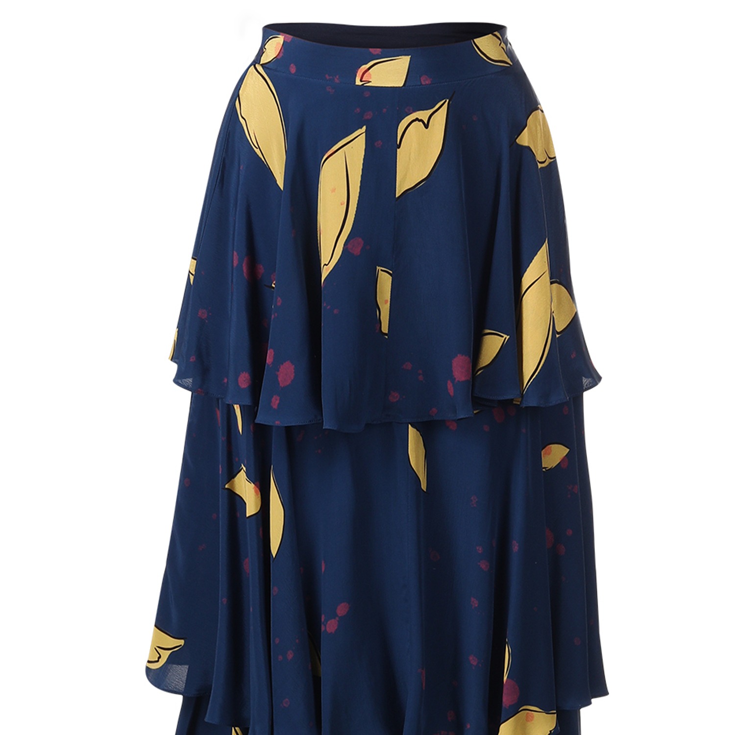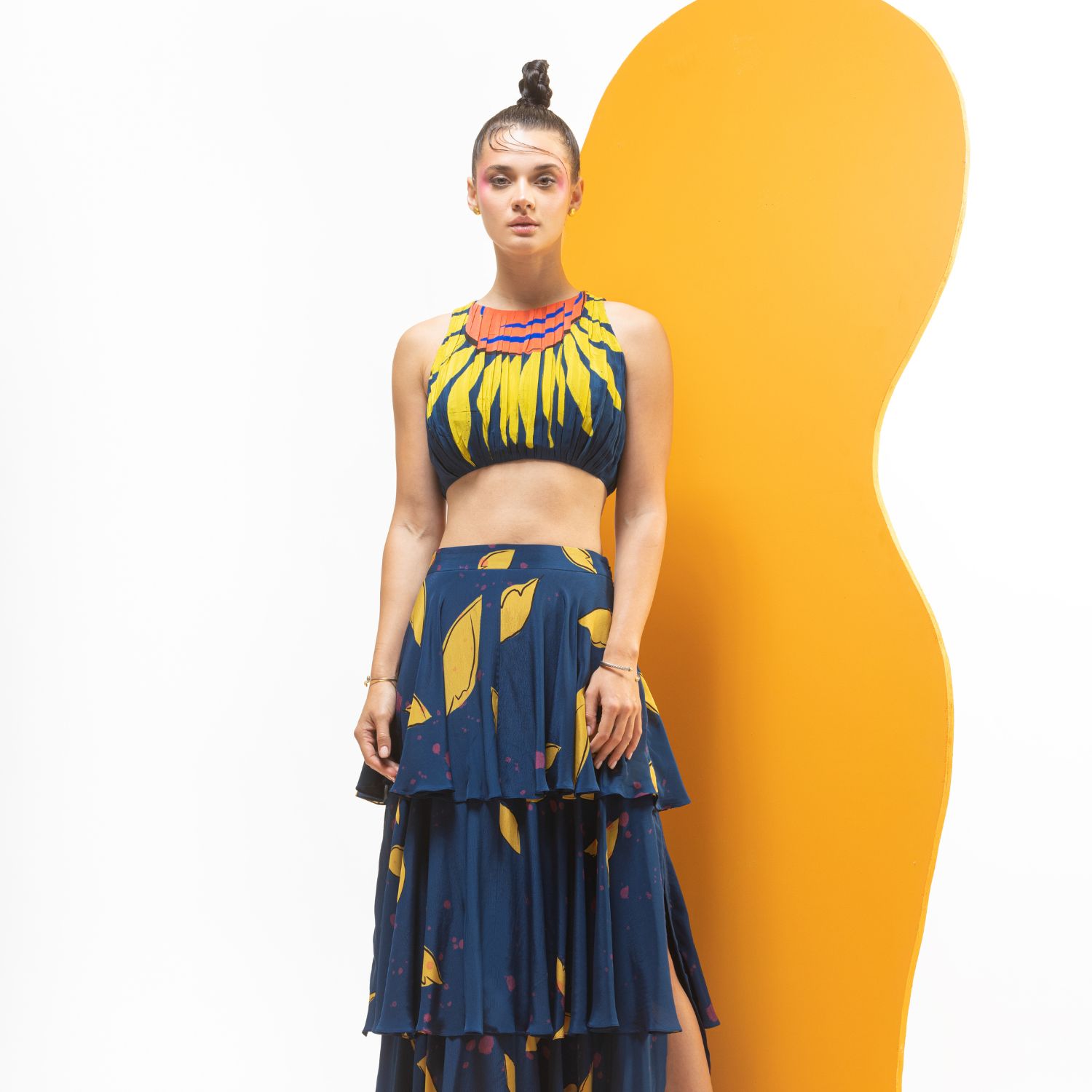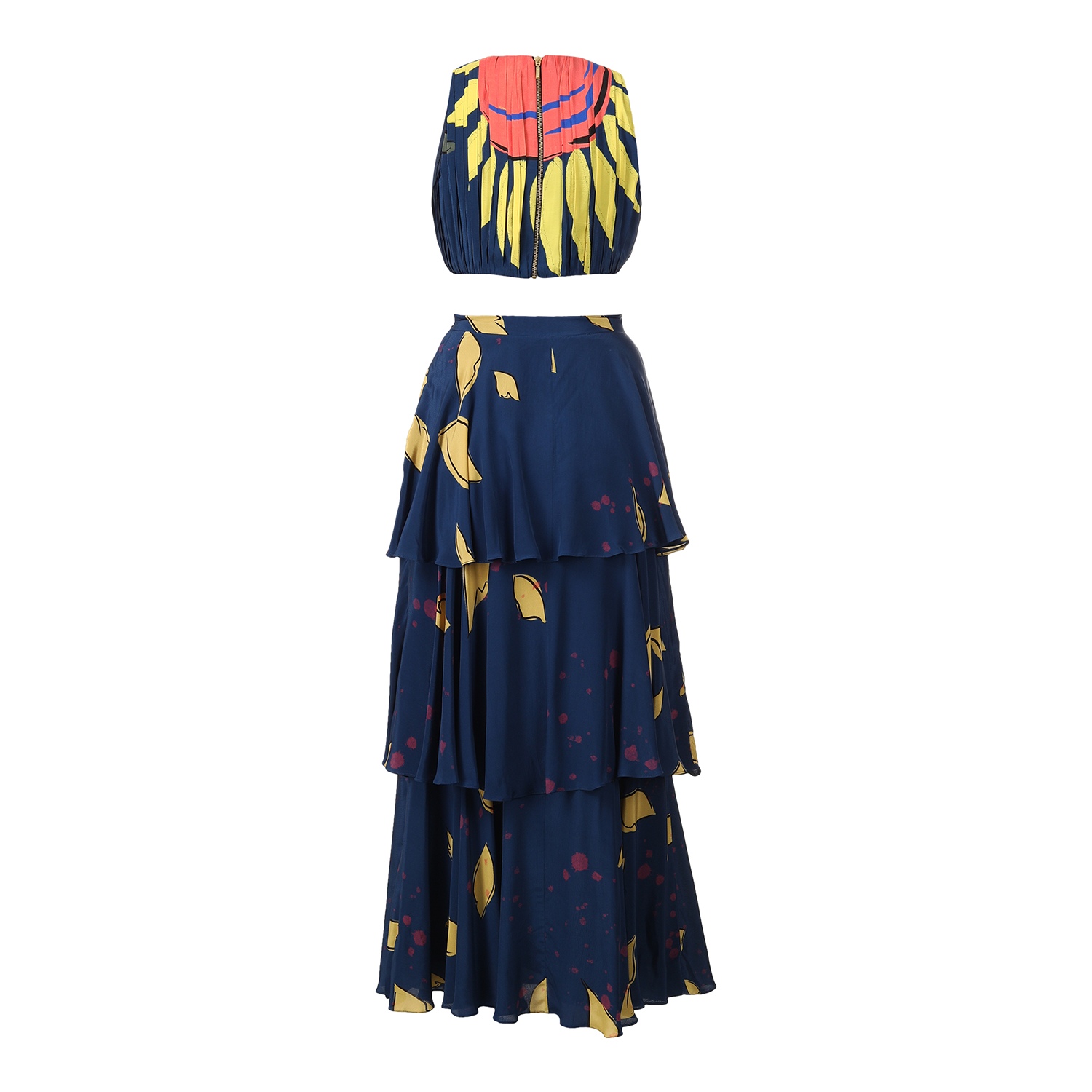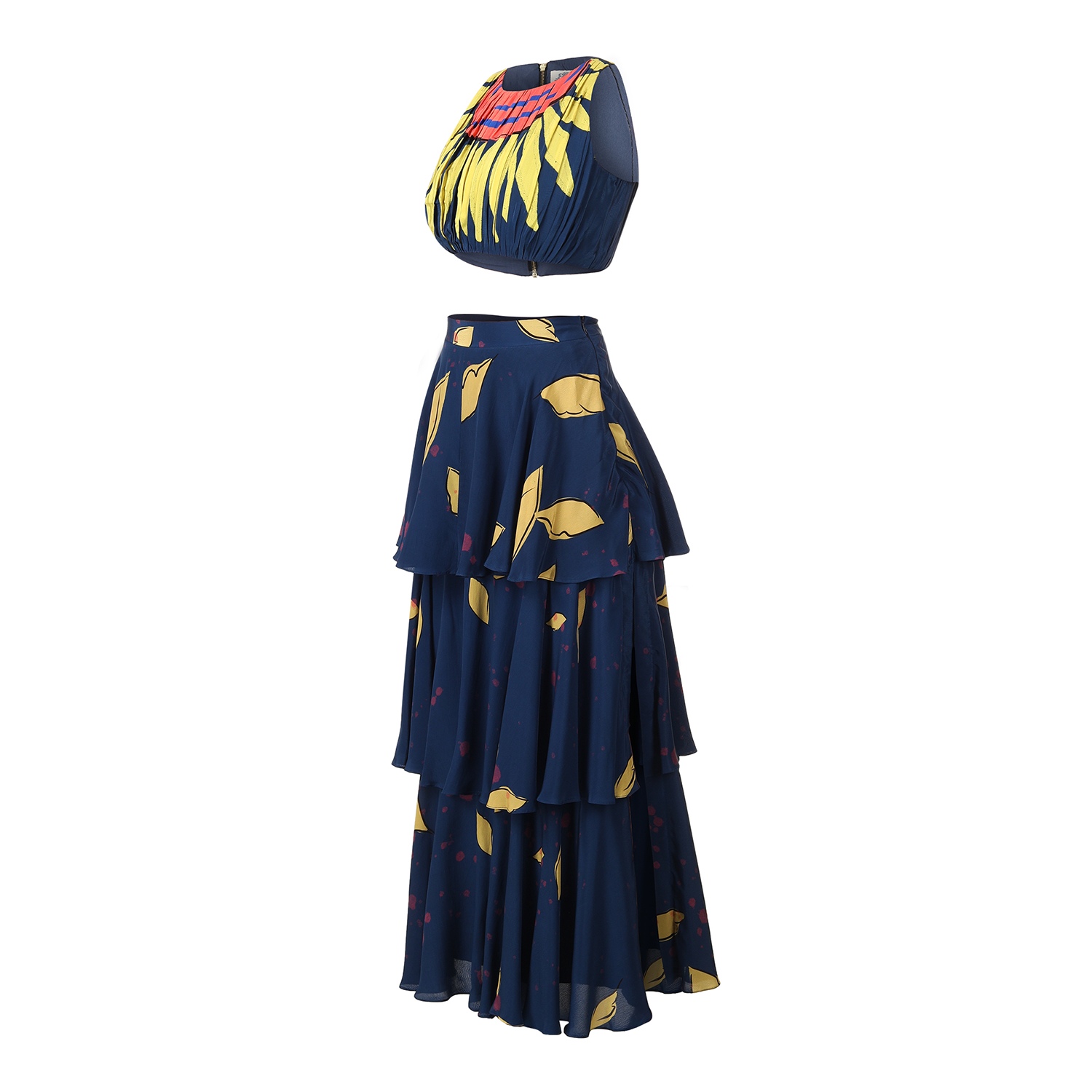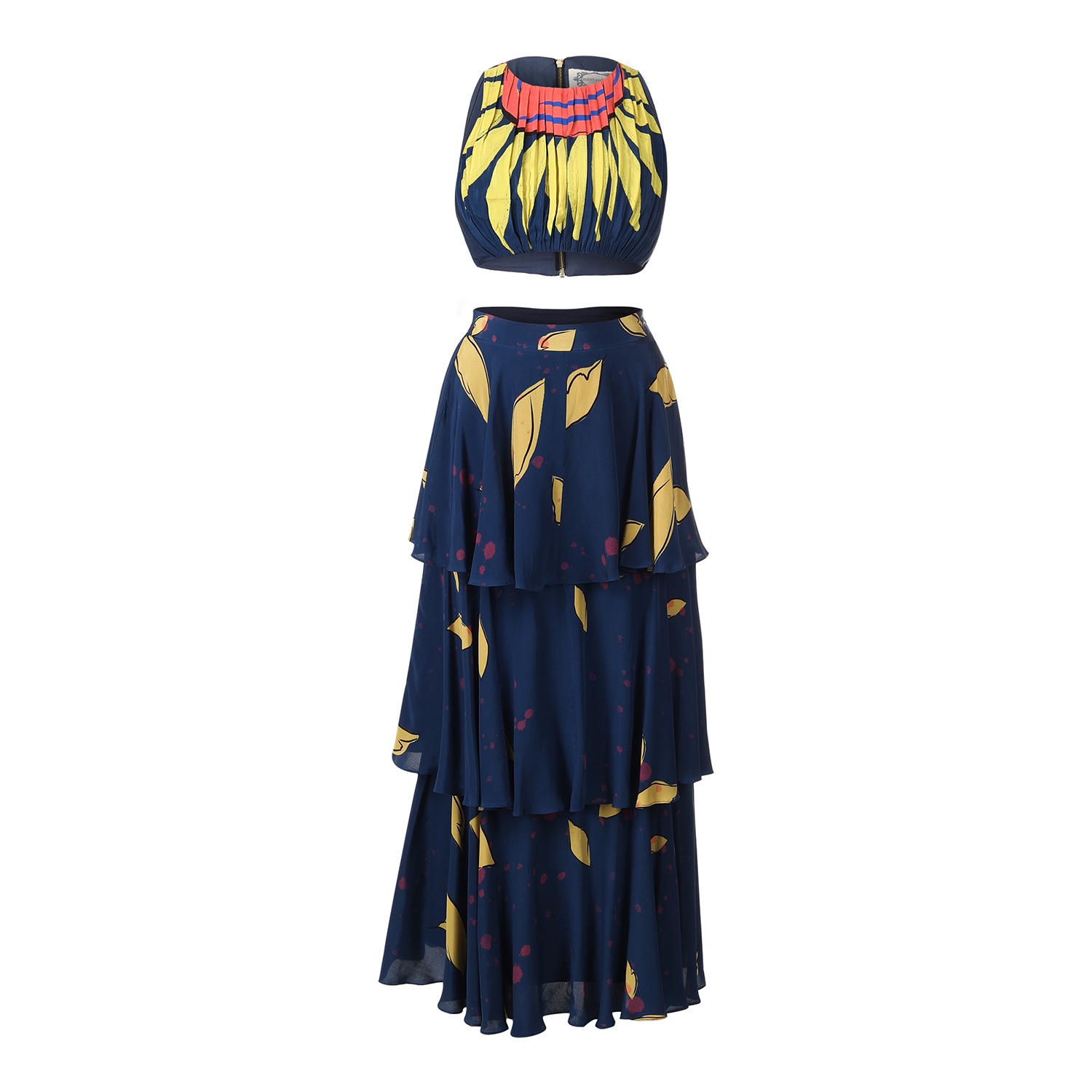 ₹ 23,800 (5% off)Elevate your style with our navy blue printed skirt & blouse set. Featuring an artistic three-tiered skirt and a comfortable top. Its mixed color palette of navy blue, yellow, and orange is perfect for any season. Made from natural crepe, it ensures a perfect fit for your body.