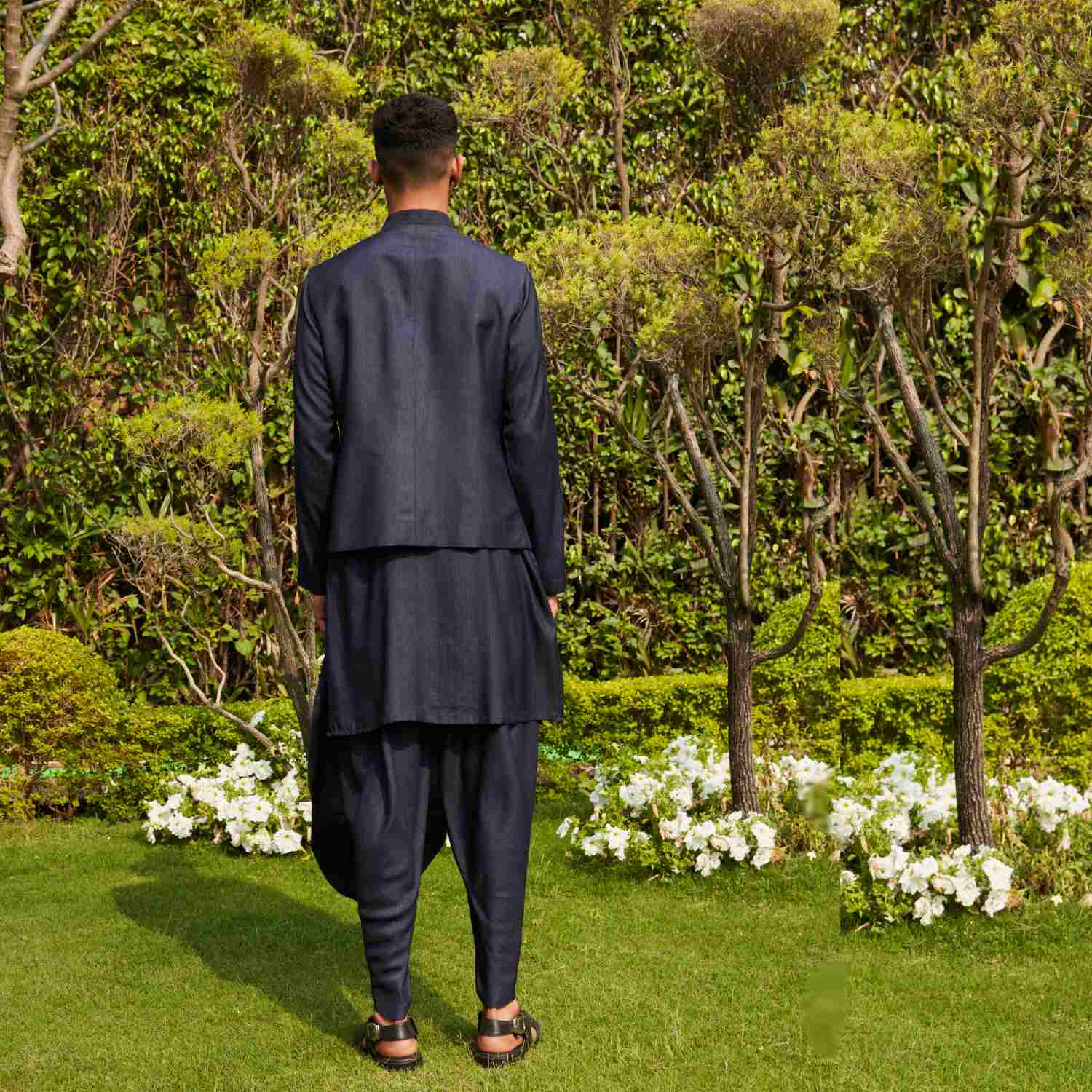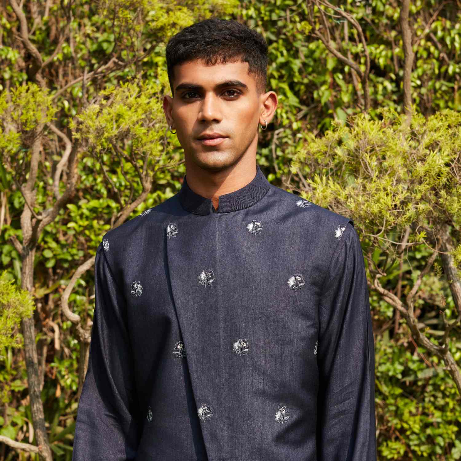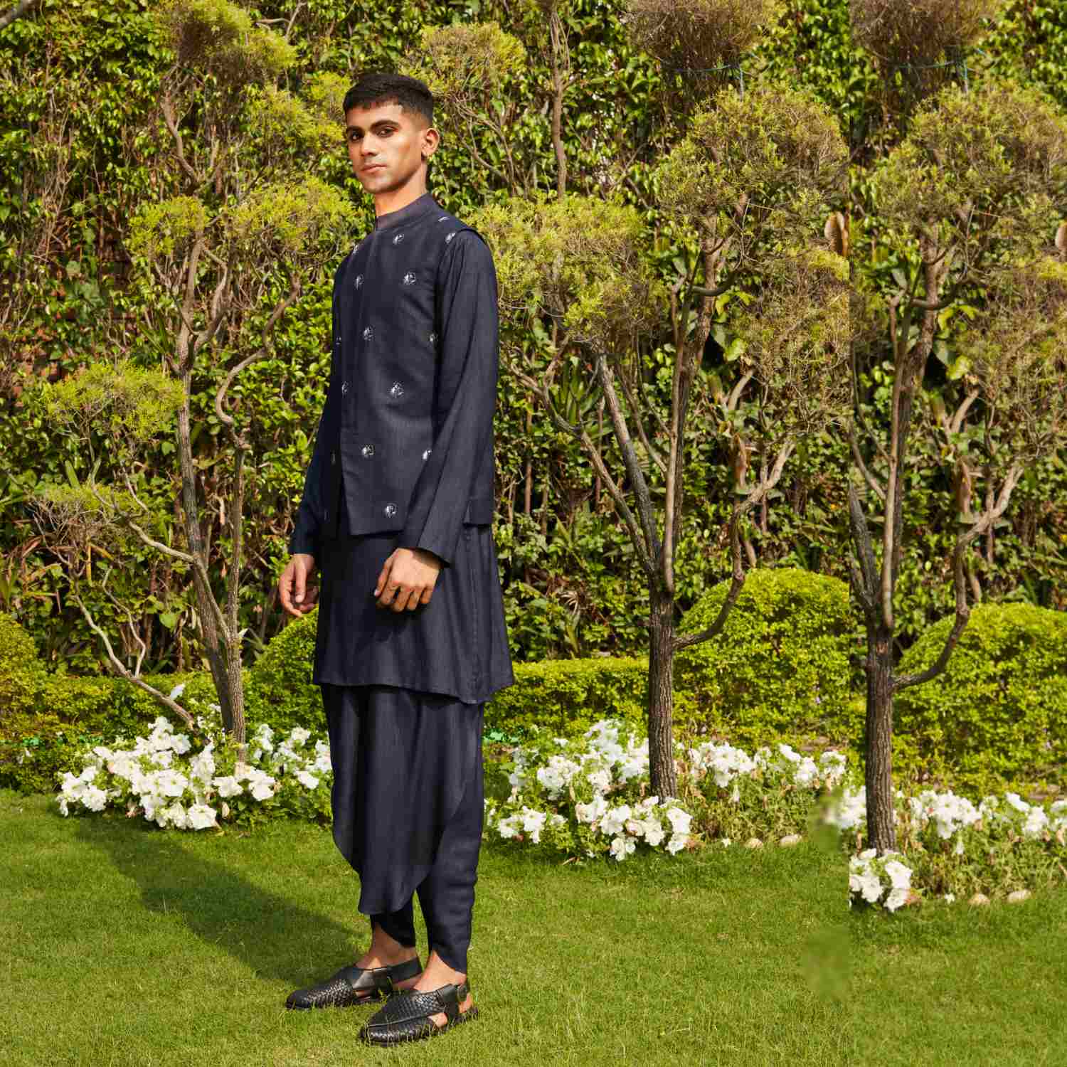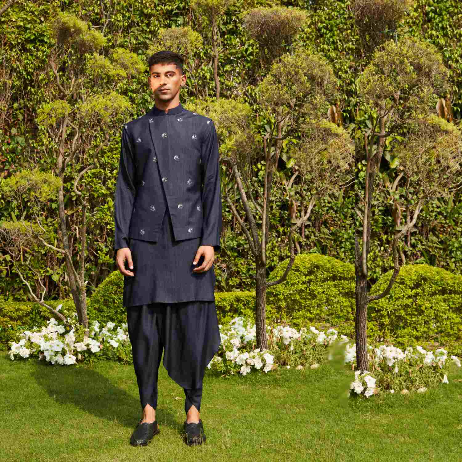 Crafted from luxurious cotton silk tussar fabric, this set features a nehru jacket, a kurta, and stylish tulip pants in deep navy blue. The jacket features a beautiful abstract embroidery, a concealed placket and a slim fit. Style it with sunglasses and formal shoes for day events.