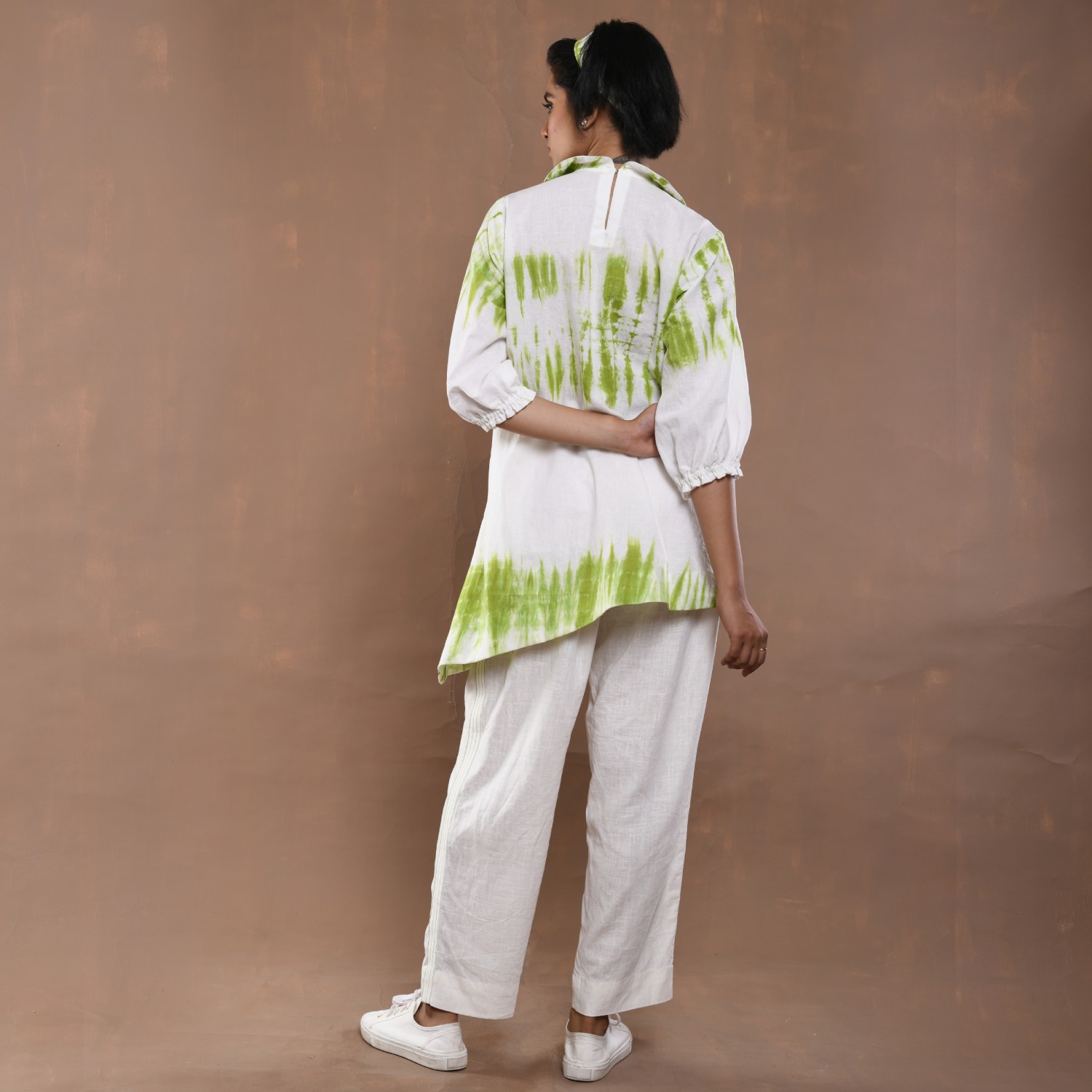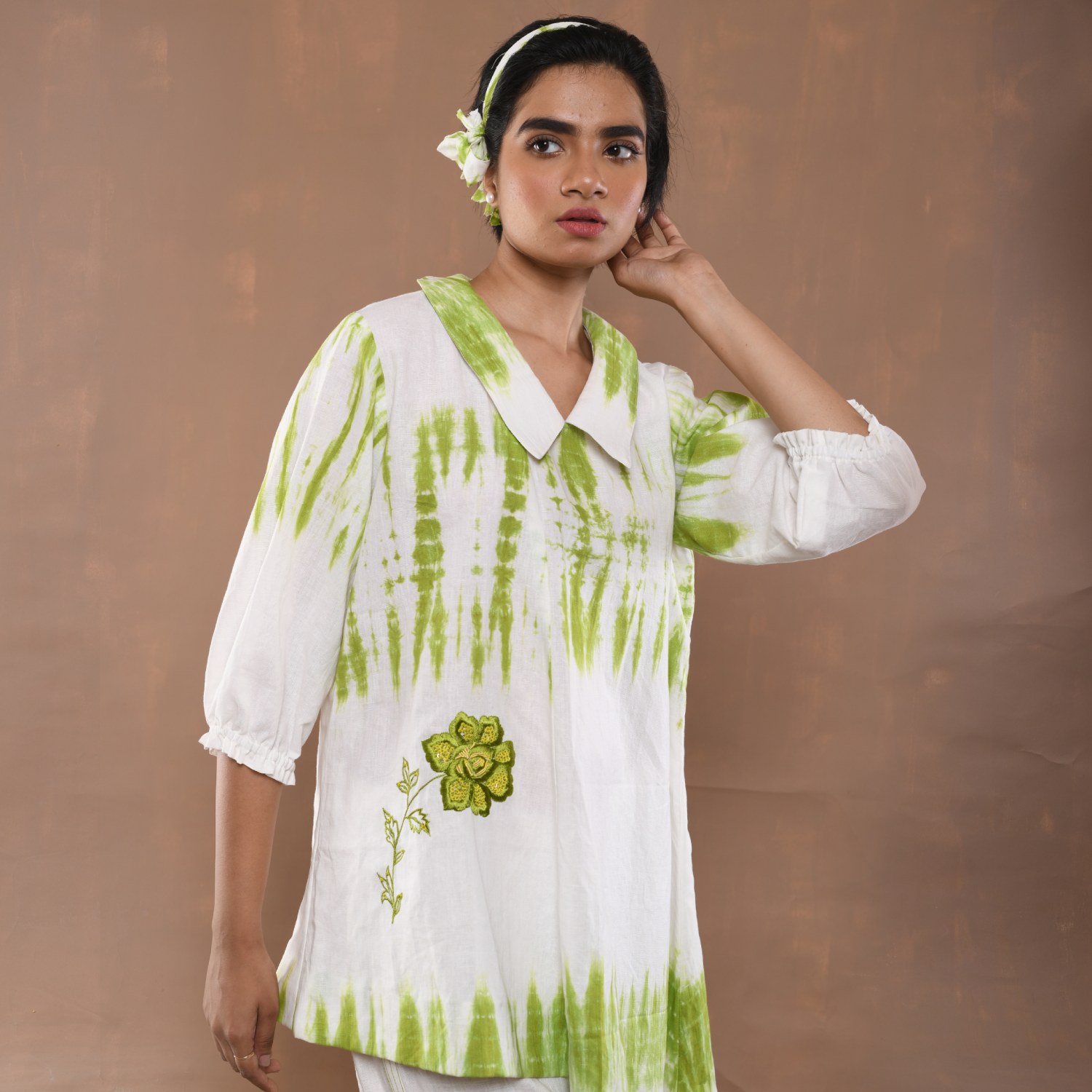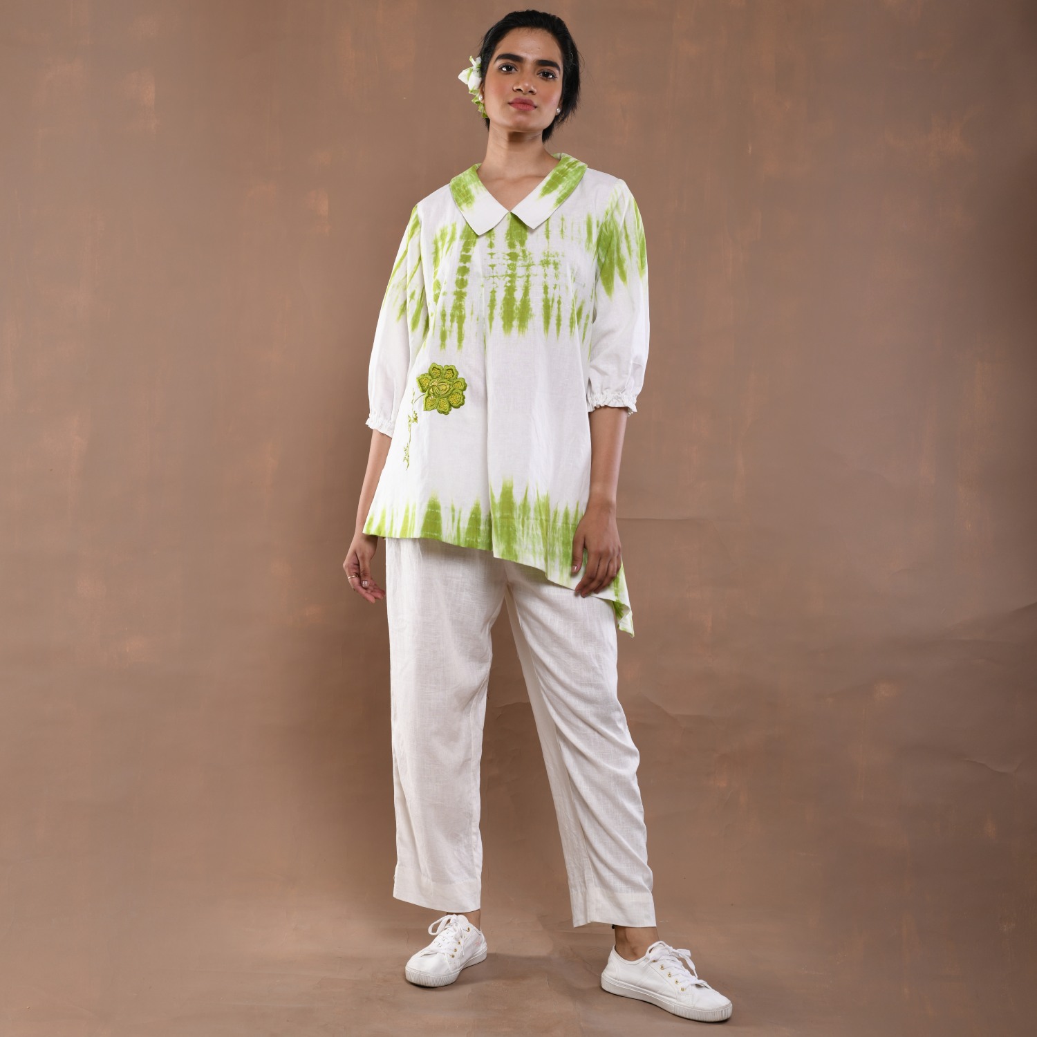 ₹ 8,599 (20% off)This tie-dye set features beautiful floral embroidery with hand-threaded details. The top is a short shirt-style piece with an abstract cut featuring stylish peter collars and gathered sleeves. The set includes white relaxed-fit pants made from comfortable linen fabric. Style it with minimal jewellery and neutral sandals for a day out with friends.