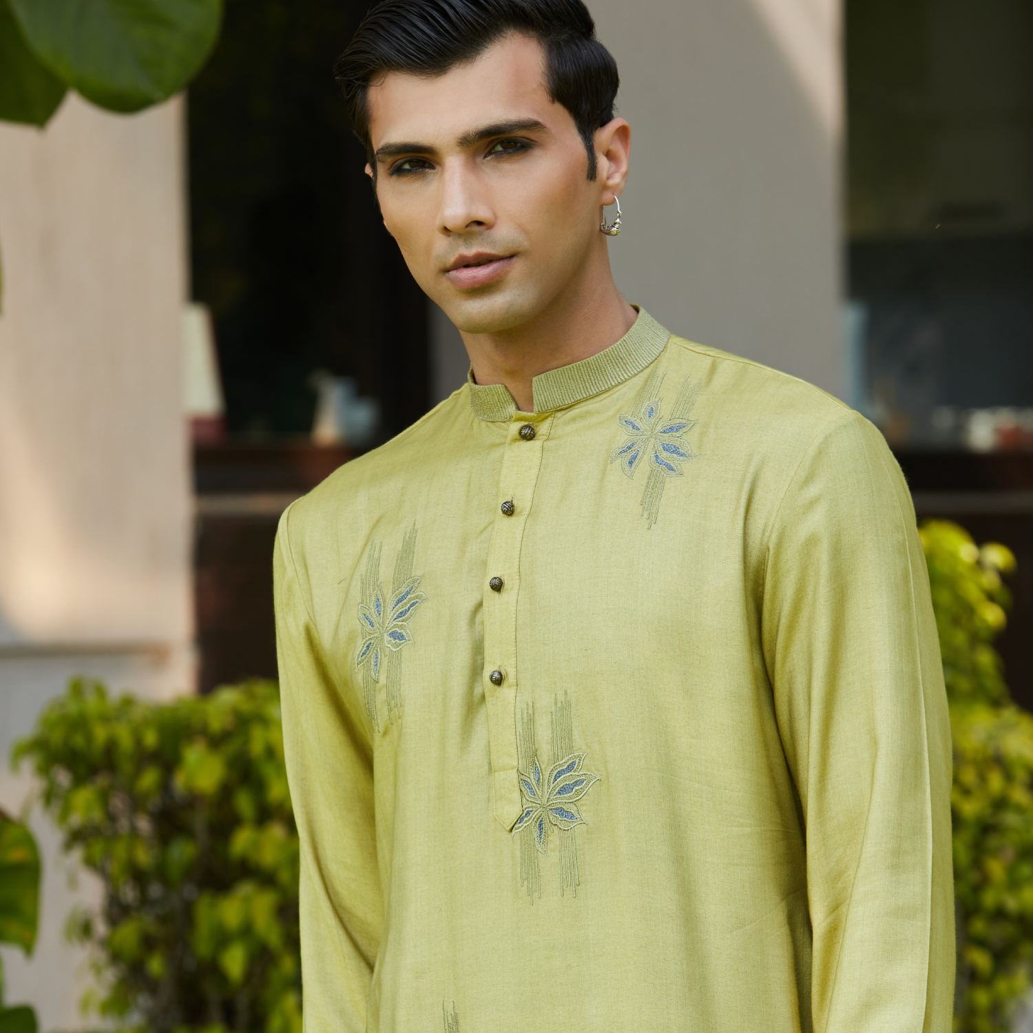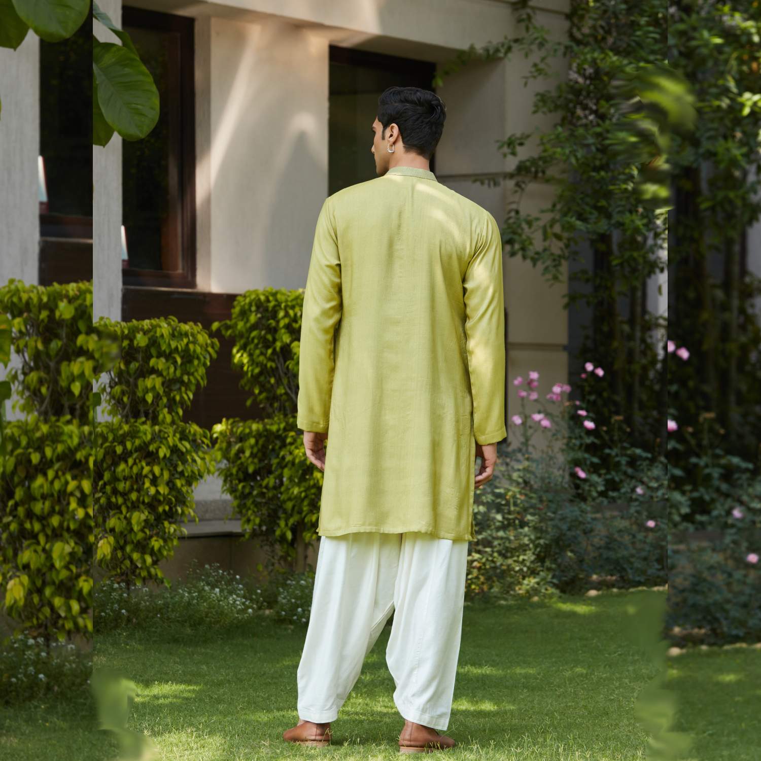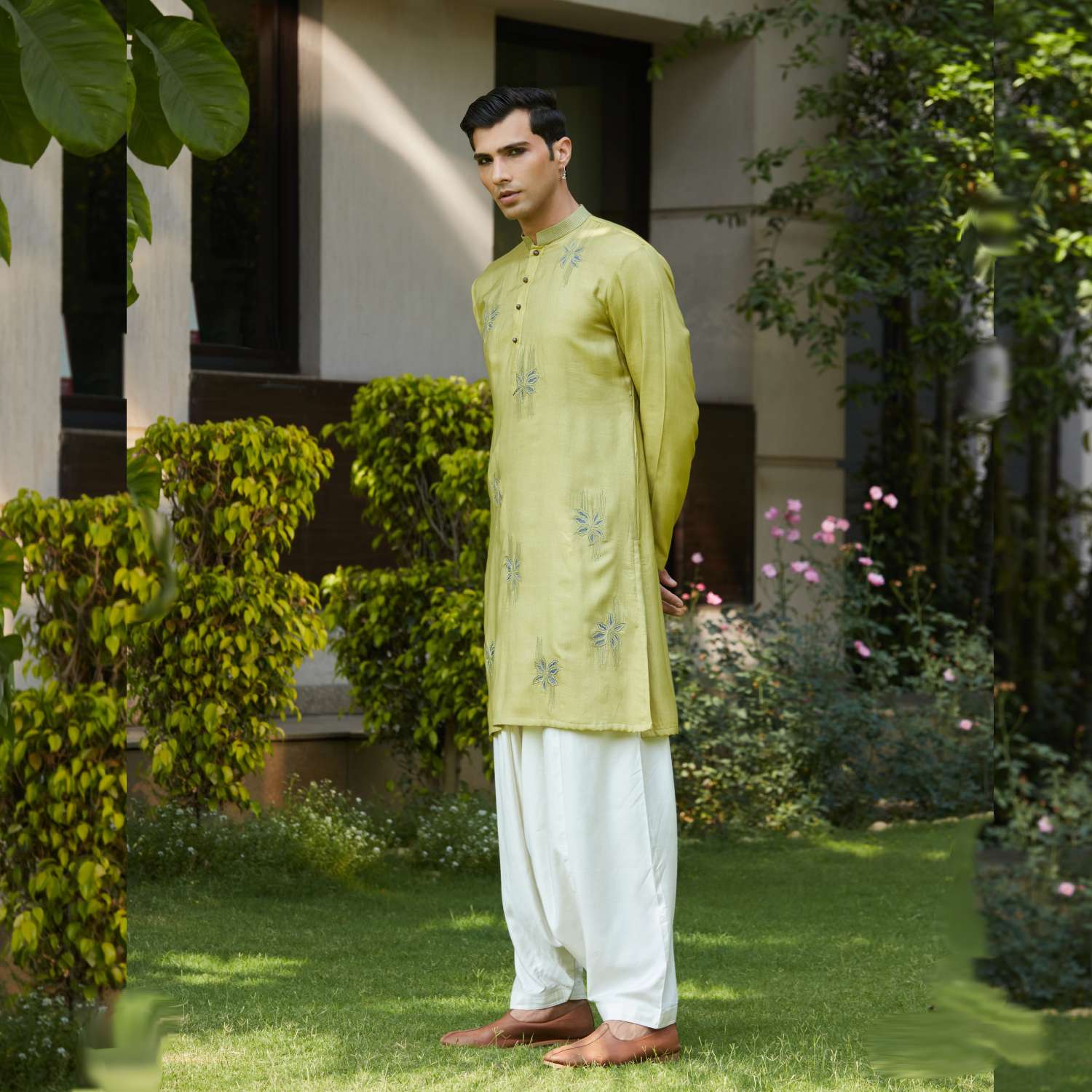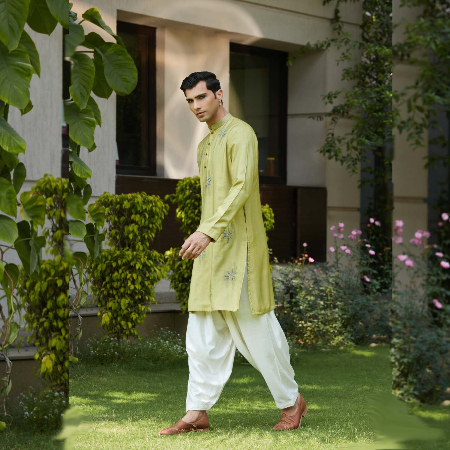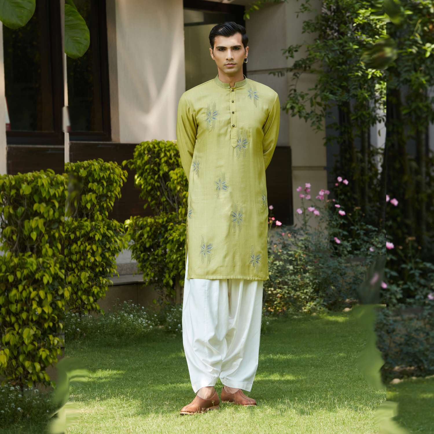 This set includes a sage green kurta paired with an off-white salwar, creating a beautiful contrast. Crafted from premium cotton silk tussar fabric, it ensures comfort and luxury. The kurta features a concealed placket, full sleeves and stunning abstract embroidery. Style it with a wristwatch and formal shoes for traditional occasions or festivities.