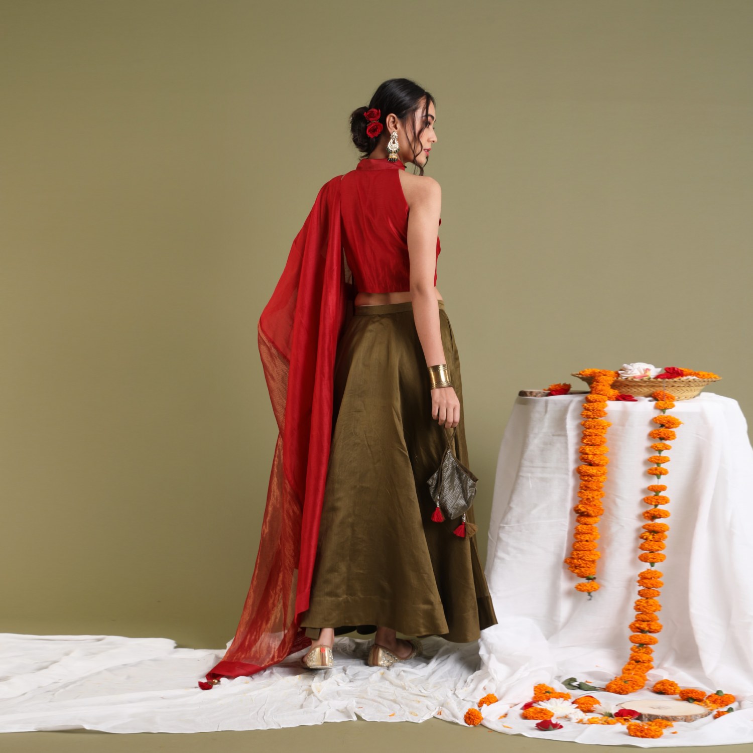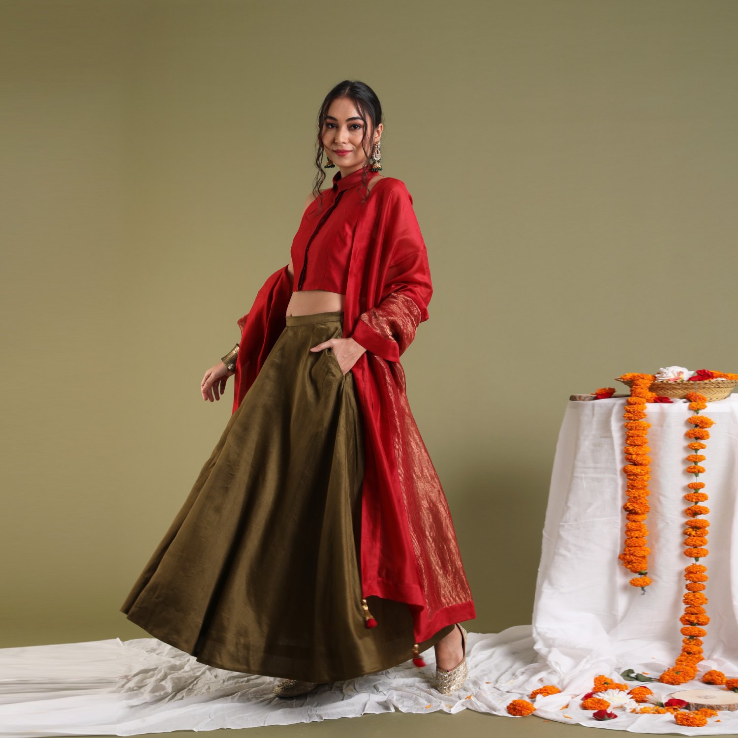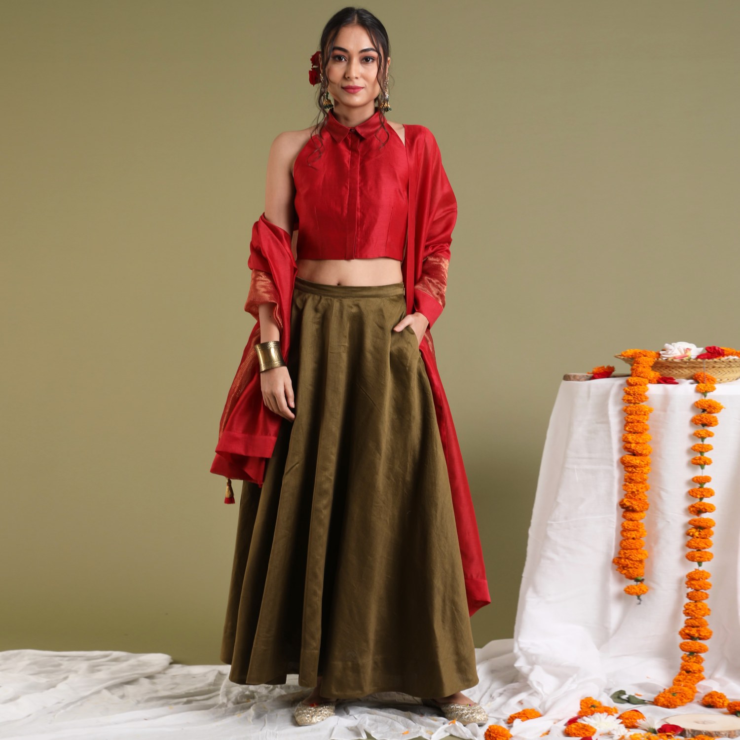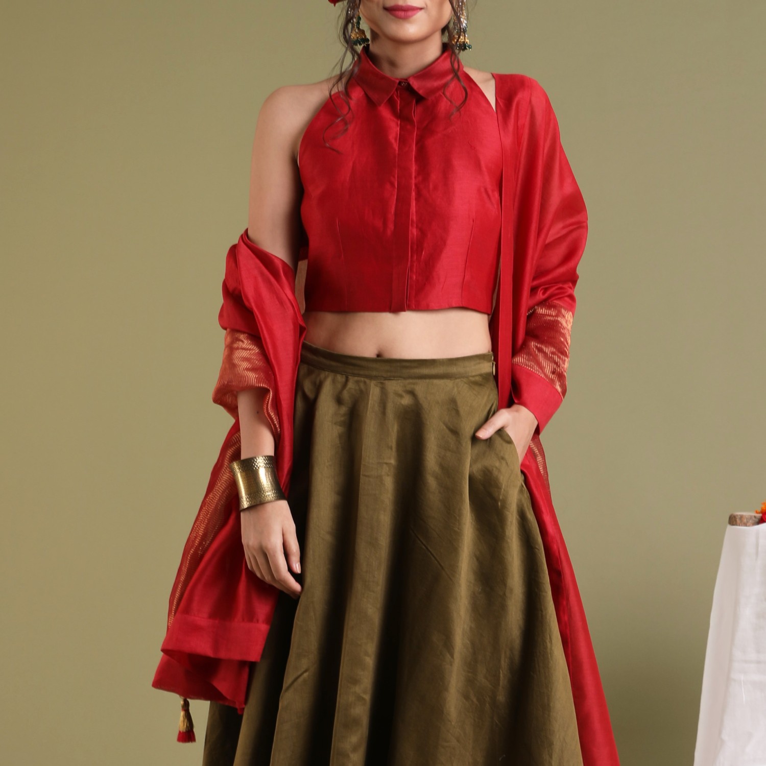 ₹ 10,499 (10% off)Elevate your style with our coordinated set, featuring a chanderi handloom halter neck top in red with a front button opening and collars, paired harmoniously with a tobacco brown chanderi flared skirt with side pockets. Complementing the ensemble is a chanderi red and gold stripe dupatta enhancing the versatility for festive, formal, or separate styling.