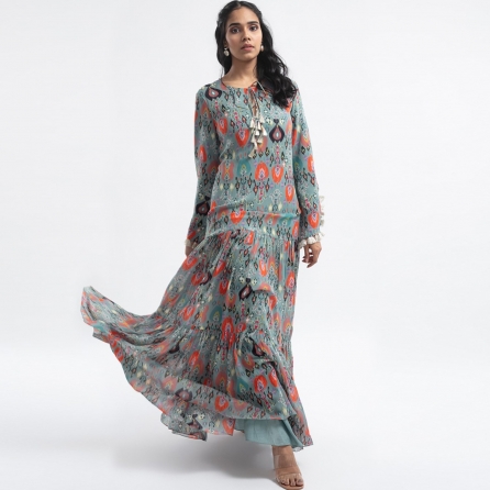 ₹ 8,000 (20% off)Crafted from high-quality georgette fabric, this dress features a vibrant red base adorned with a leaf print. This dress has multiple ruffles adorning the bottom hem and the neck area, creating a romantic look. Style it with statement earrings and heels for a dressy day soiree.