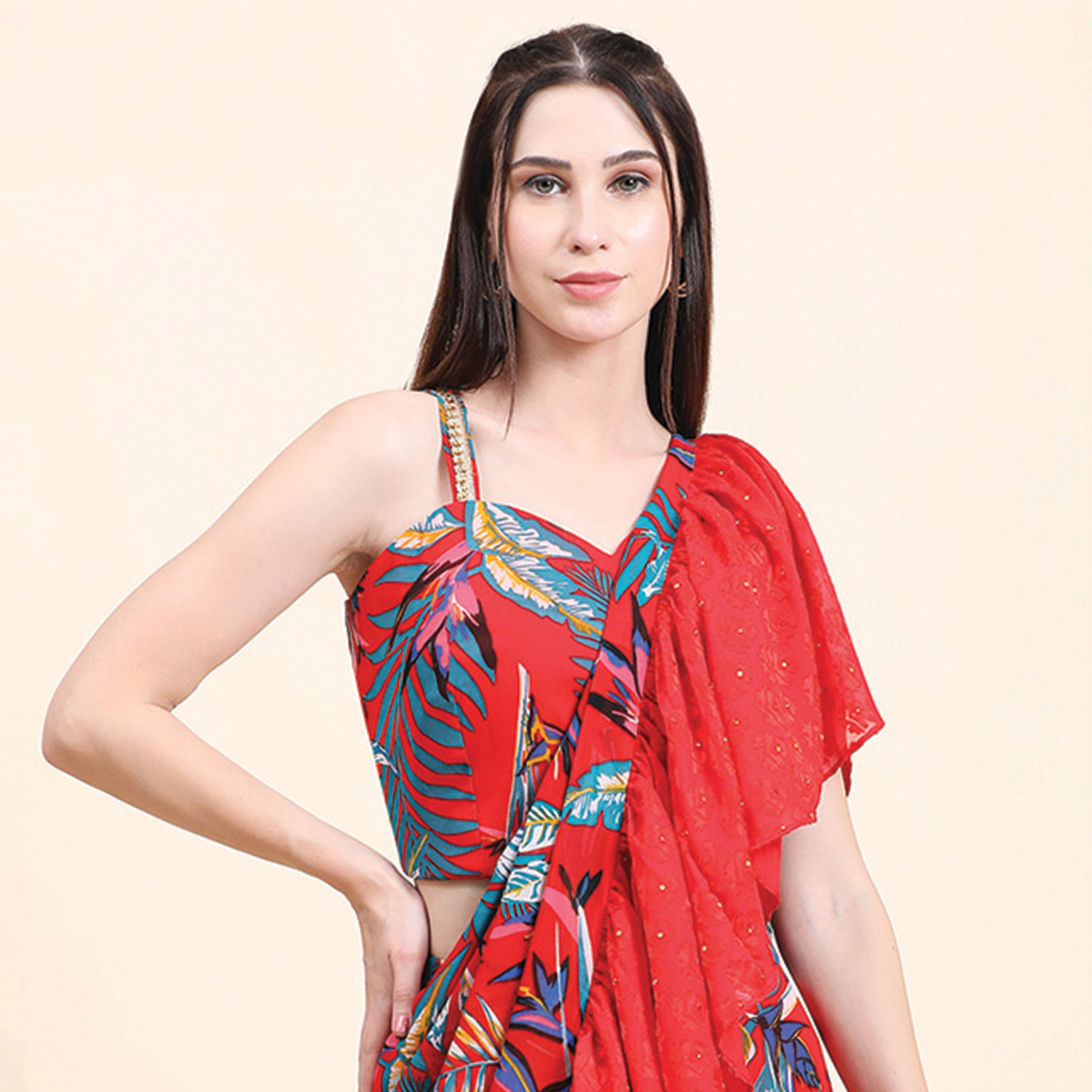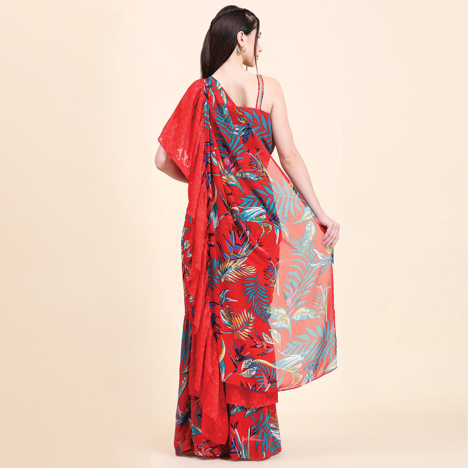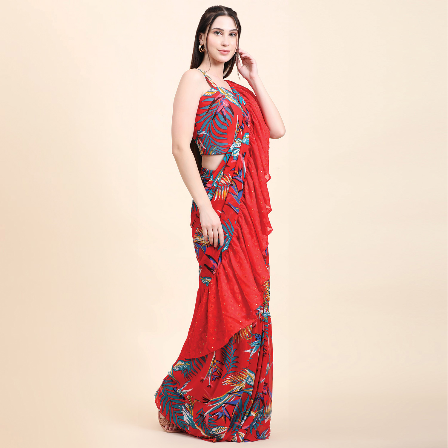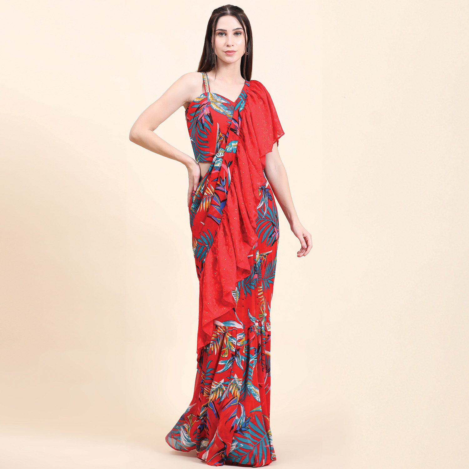₹ 15,000 (20% off)This gorgeous set includes a ruffle saree in a georgette base, a drape pallu and a sequined blouse. The saree is designed to make a statement with its playful multicolor leaf print and a gathered skirt. The sweetheart sequined blouse adds glamour to the outfit, and it's finished with shantoon lining for comfort and structure. Style it with traditional jewellery and embellished heels for weddings or festivities.