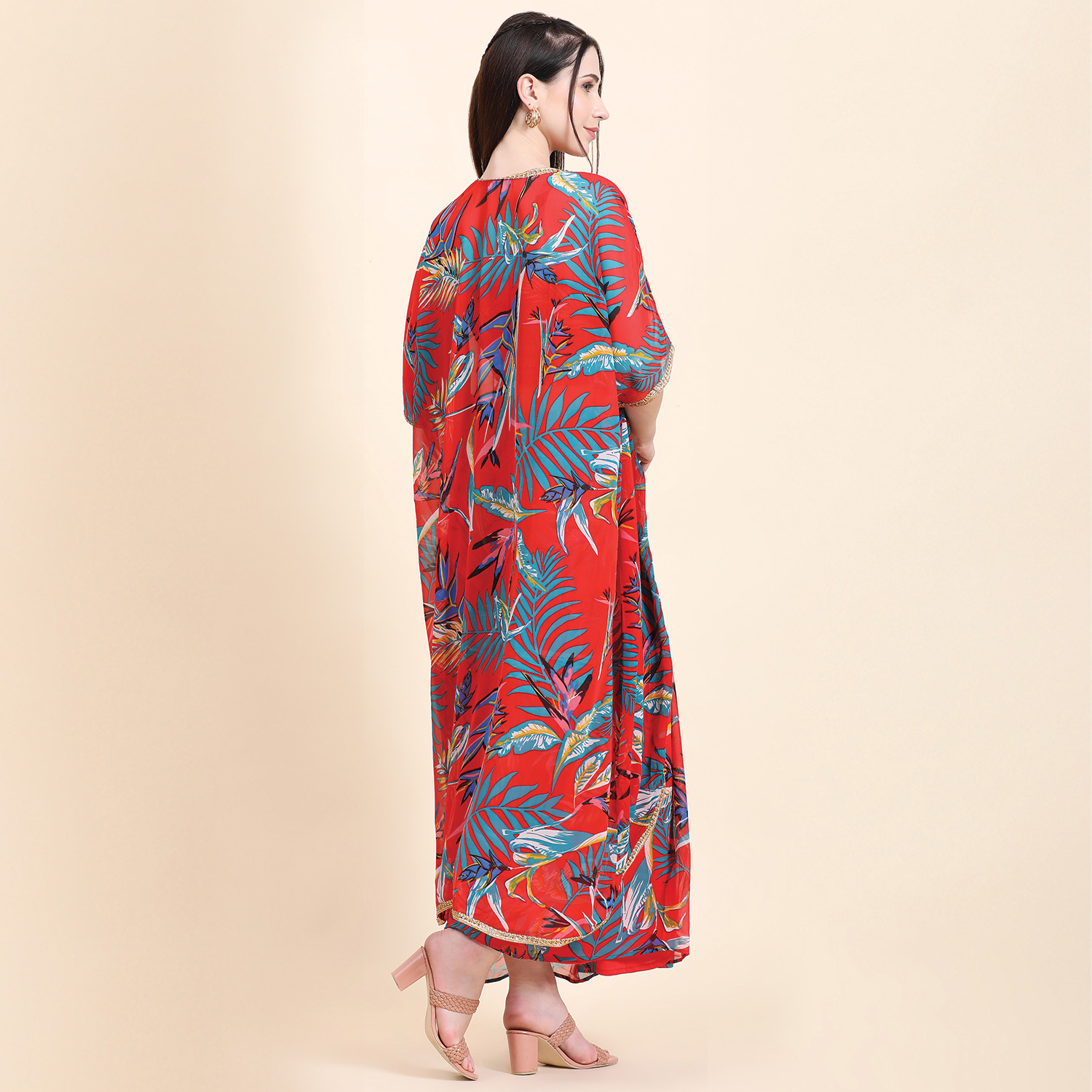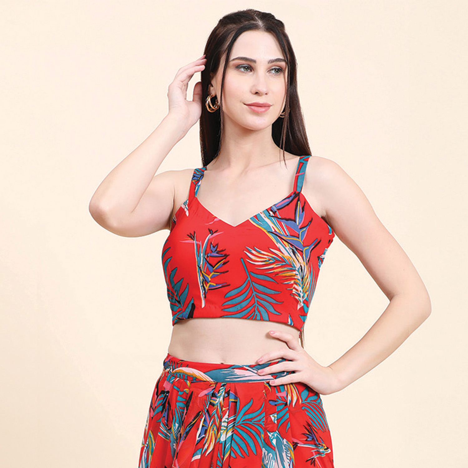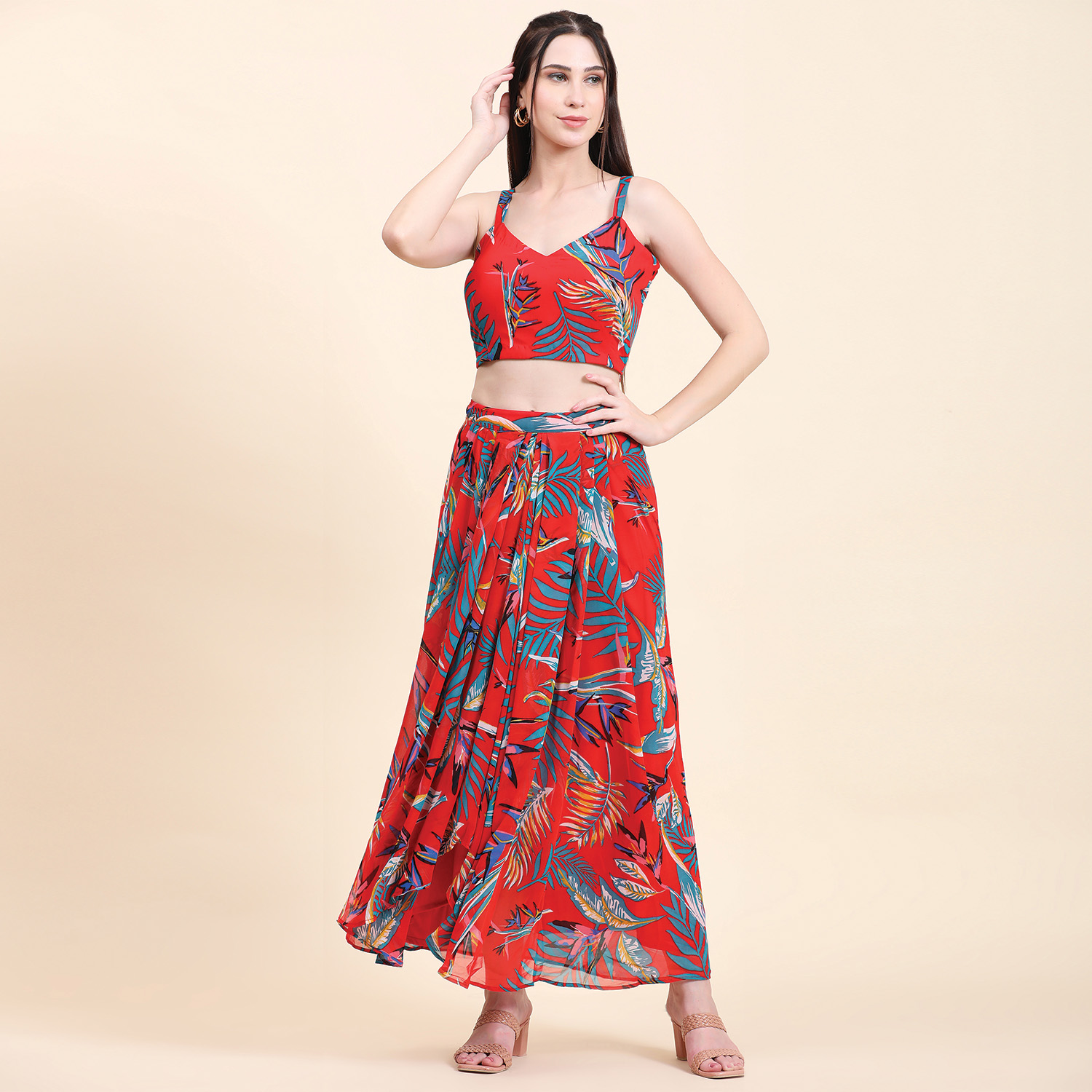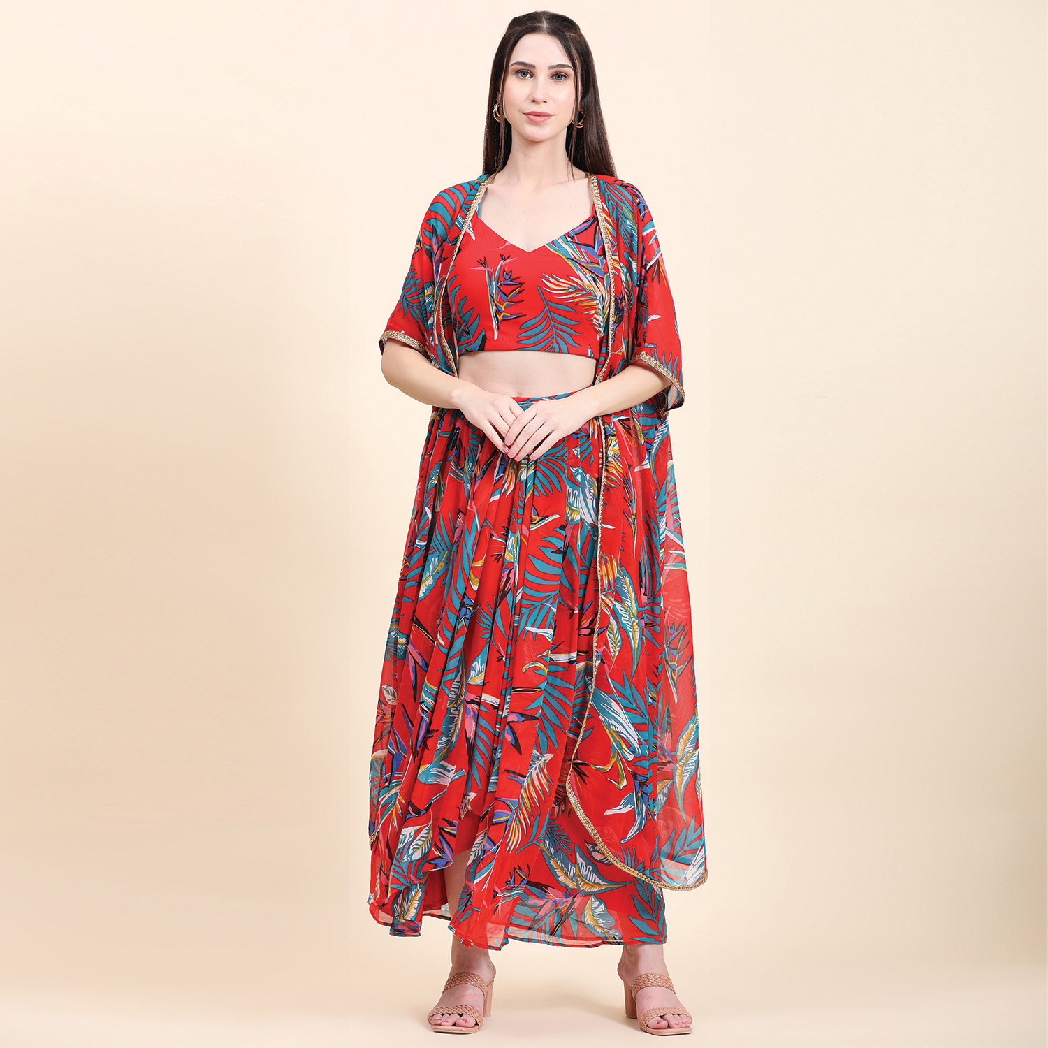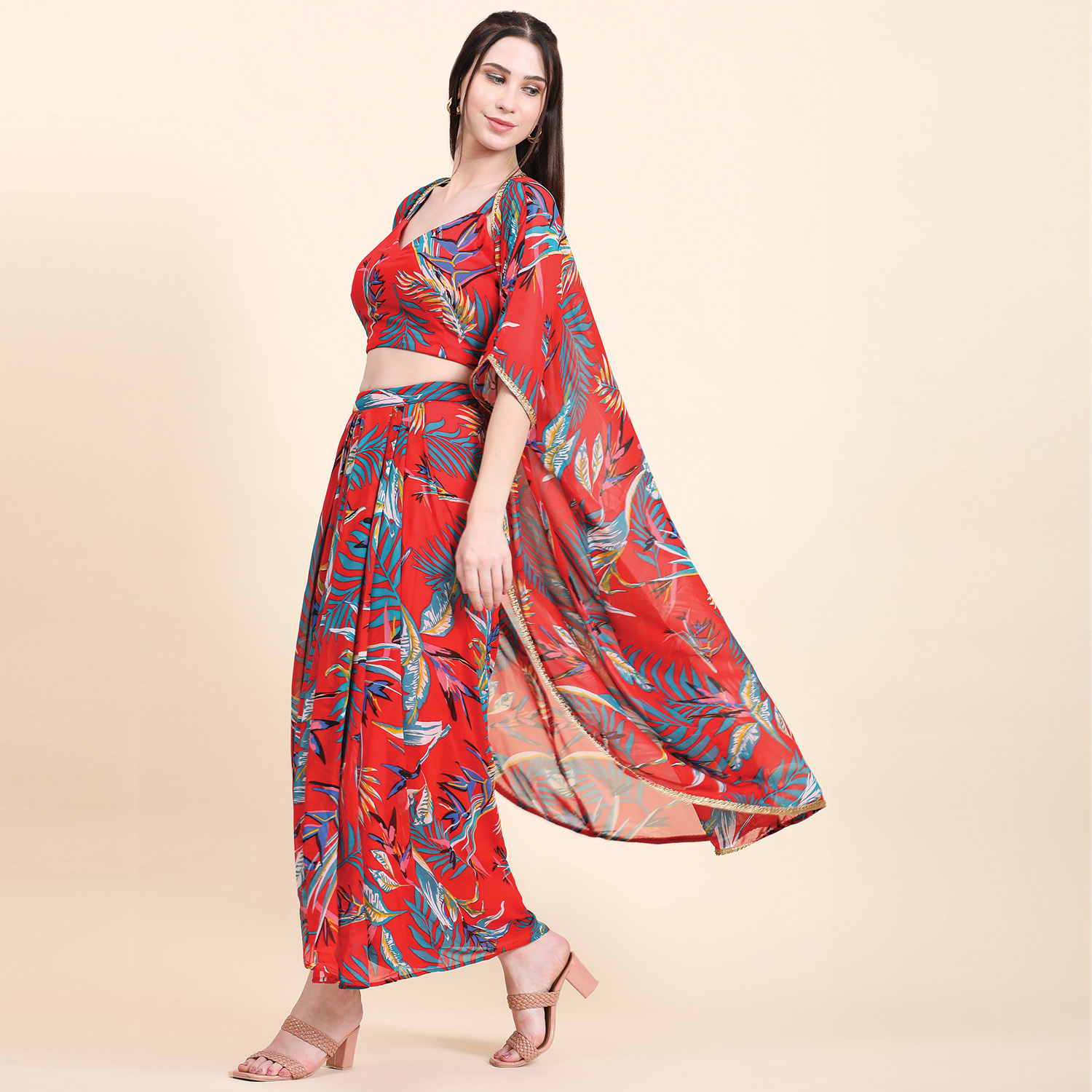₹ 10,000 (20% off)This beautiful set features a rich red georgette base adorned with a multicolor leaf print, creating a vibrant and elegant look. The blouse, dhoti skirt, and lace-embellished cape form a stylish, cohesive outfit. Style it with long gold earrings and embellished heels for weddings or festivities.