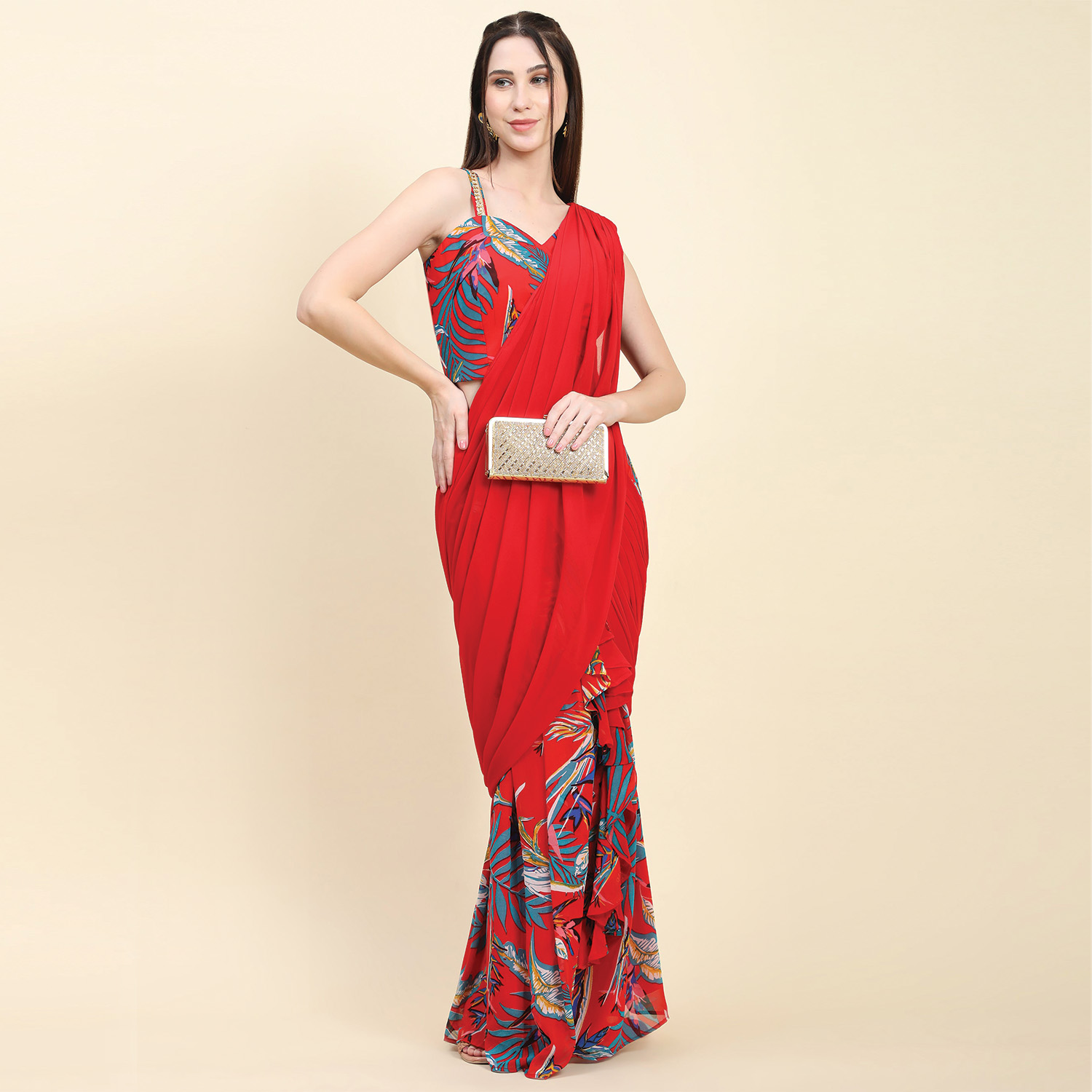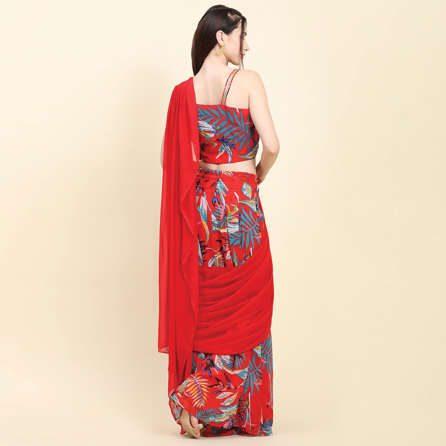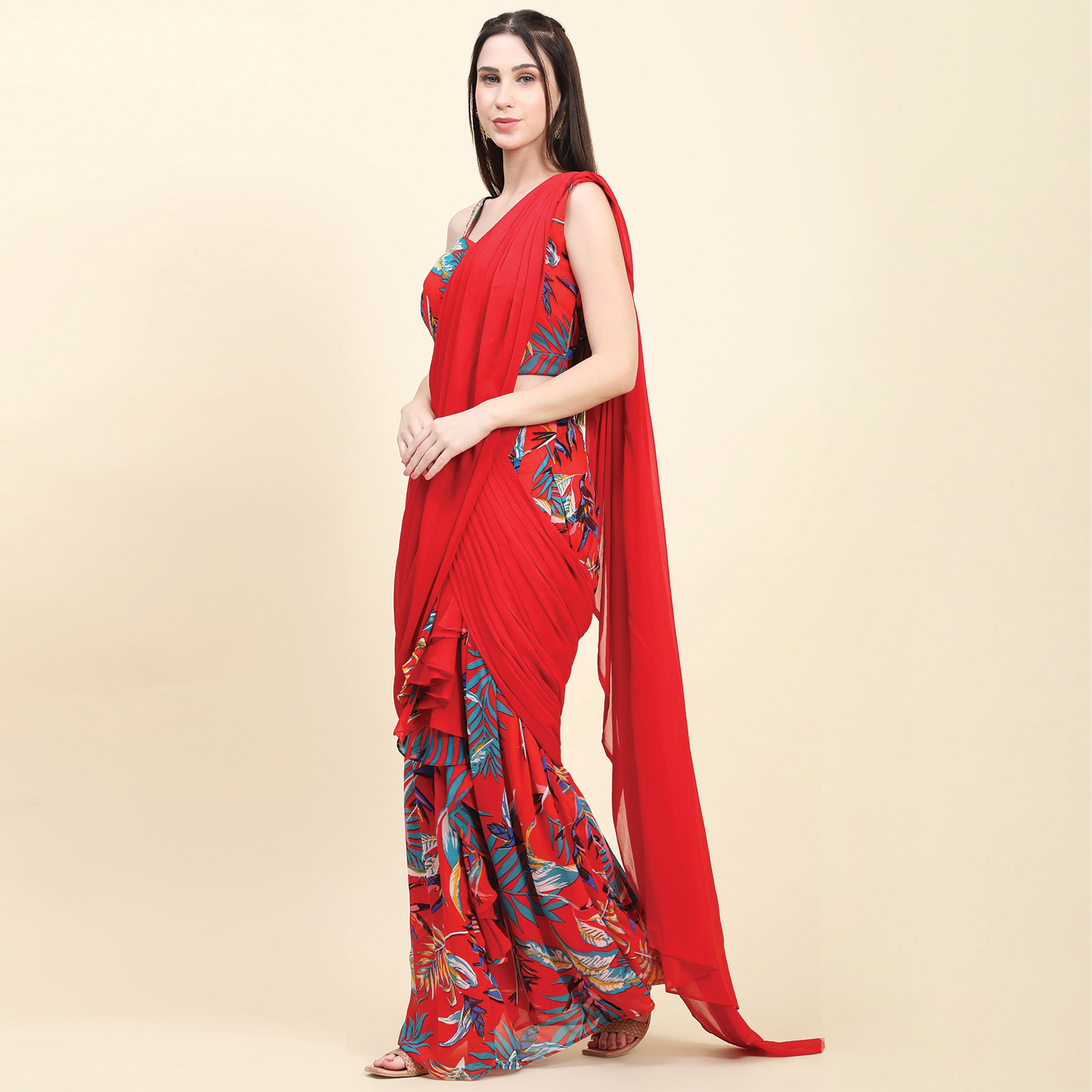 ₹ 15,000 (20% off)The saree features a multicolor leaf print on a georgette base in a vibrant red color. It has ruffle pleats and drape pallu, adding modernity and drama to the traditional saree silhouette. The sweetheart neck blouse complements the saree beautifully, adding femininity to the overall look. Style it with statement earrings, bangles, and a clutch for weddings or festivities.