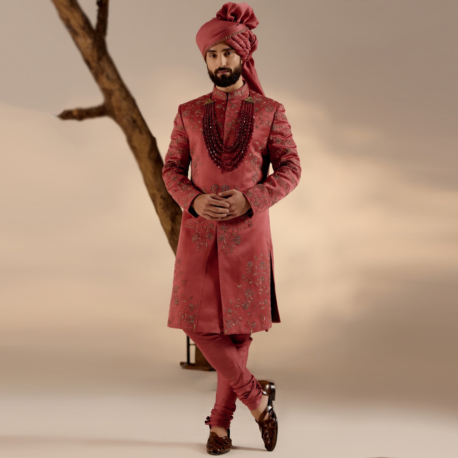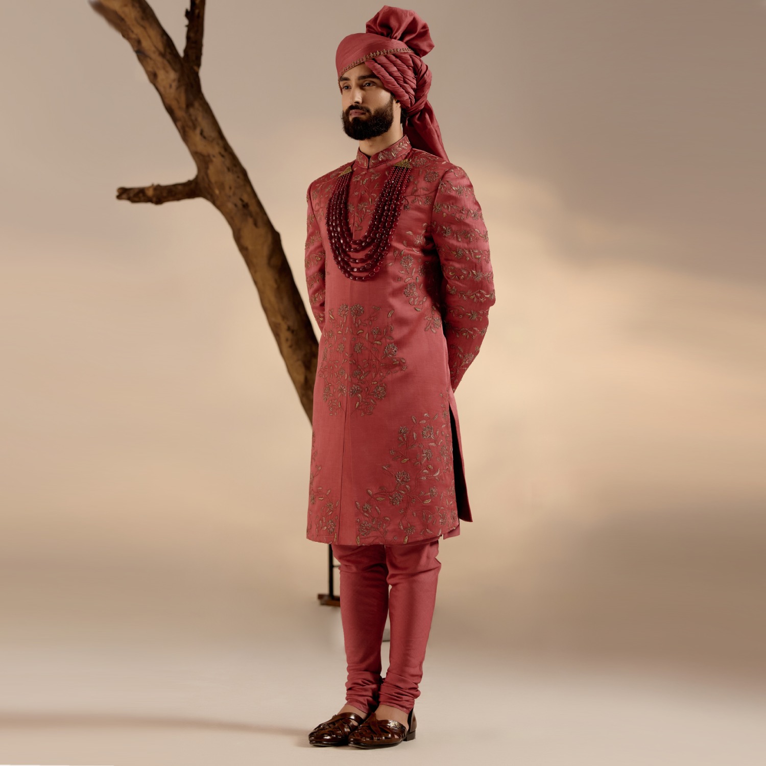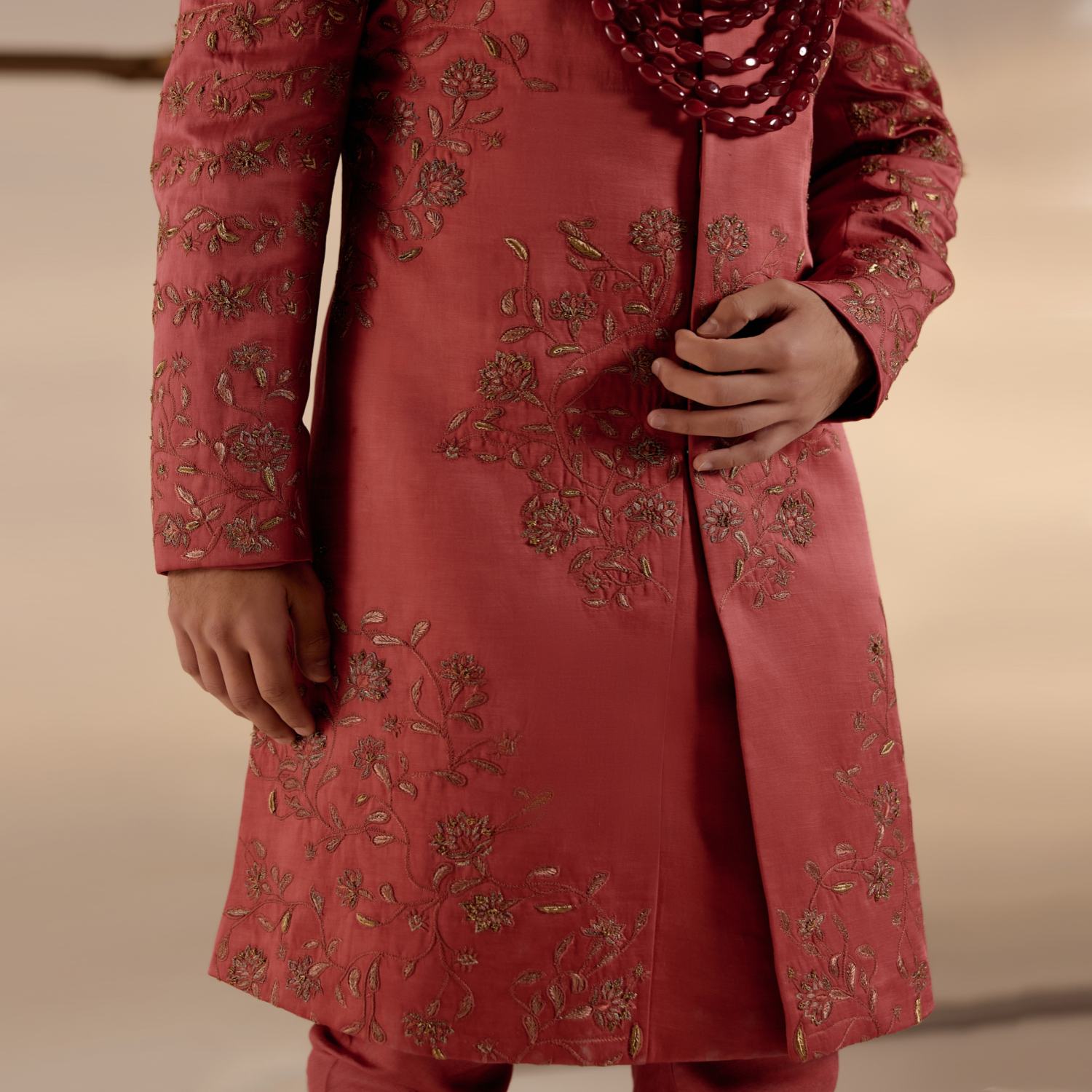 ₹ 1,51,000 (10% off)This stunning red silk set includes a sherwani, kurta, churidar and a safa. It is hand embroidered using tone-on-tone resham work with gold zari and dabka for a luxurious texture. Style it with a gold necklace and formal shoes for weddings or festivities.