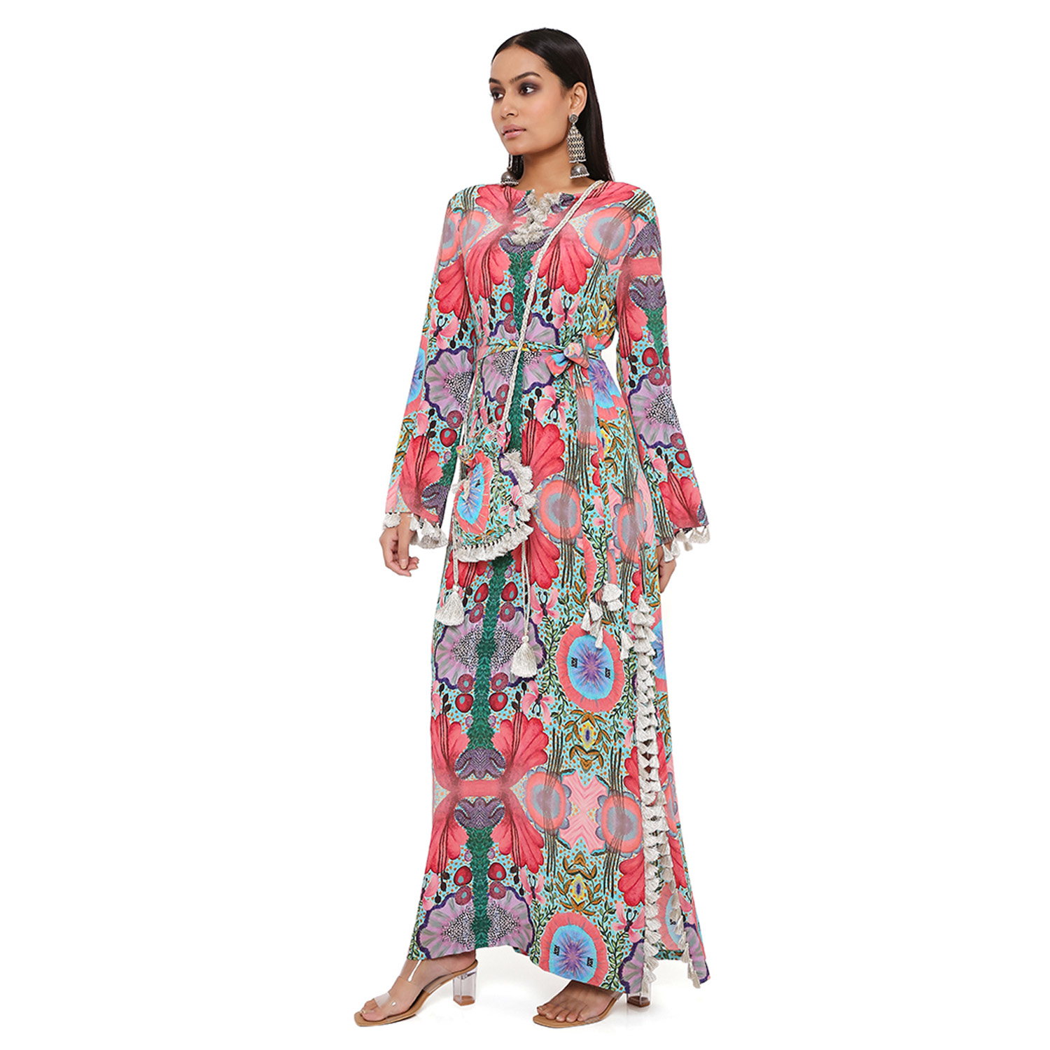 Adorned with an enchanting print on crepe fabric, this features a vibrant mix of colors. It has a long length and relaxed fit, ensuring a flowing and effortless silhouette. Style it with statement jewellery and heels for a dressy evening soiree.