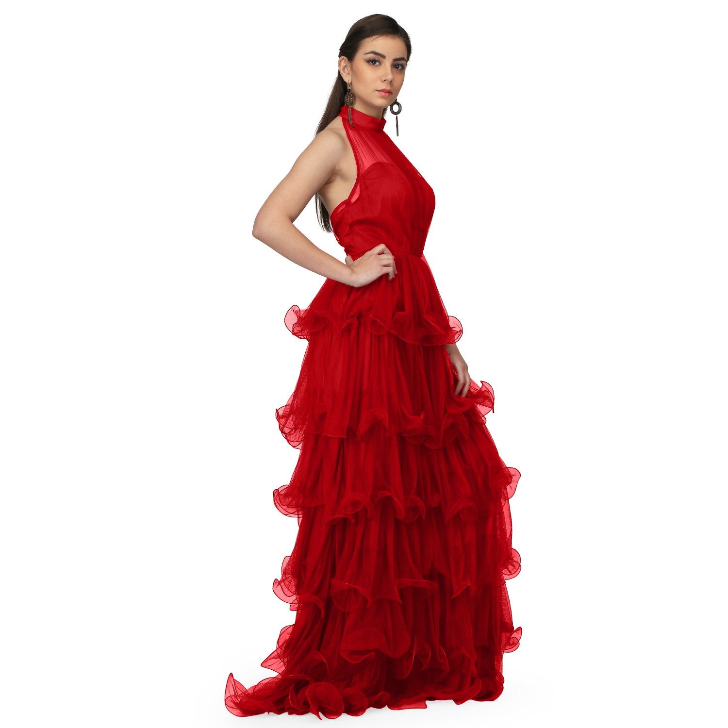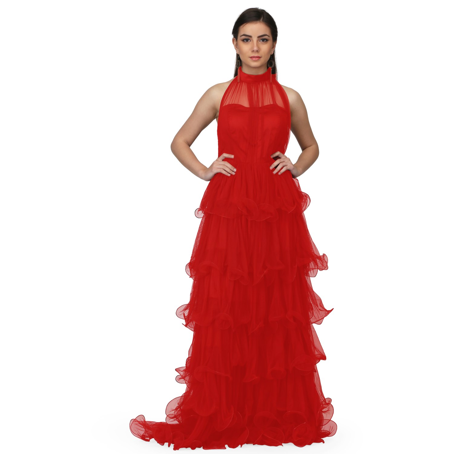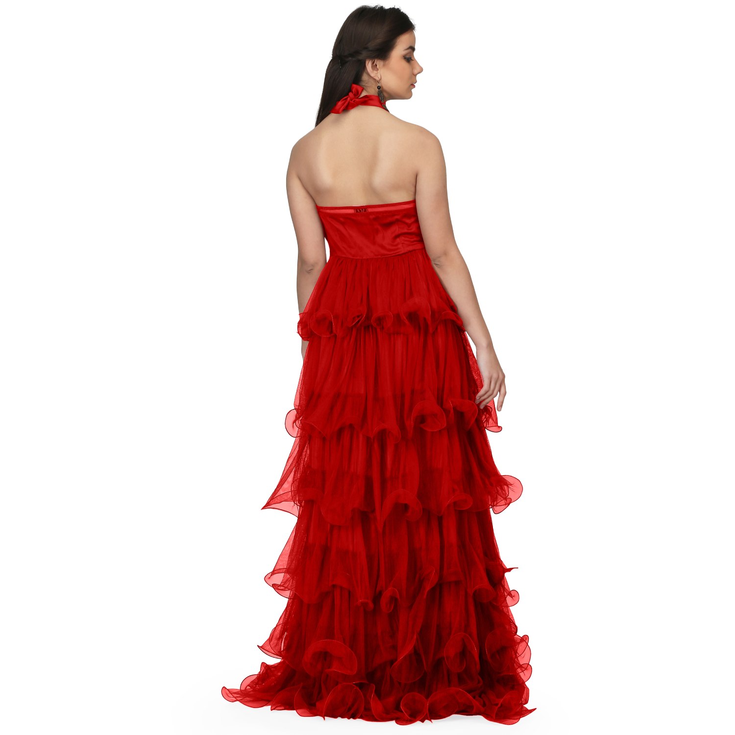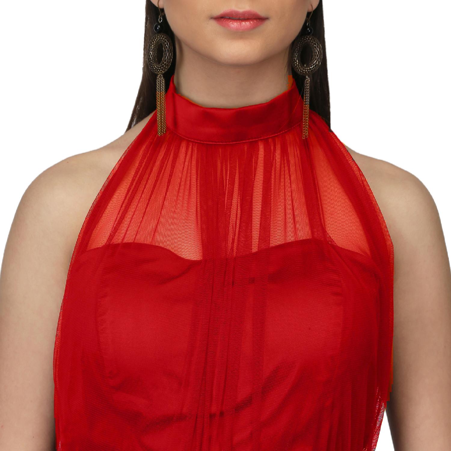 ₹ 6,500 (20% off)This gorgeous red maxi dress is crafted from a combination of net and satin fabrics, ensuring a luxurious and silky texture. The halter neck design adds a hint of sophistication to the dress, accentuating your neckline beautifully. The dress features a multitier ruffle and gathered draped design that adds uniqueness to your look. Pair it with statement earrings and a sling bag for a dressy evening soiree.