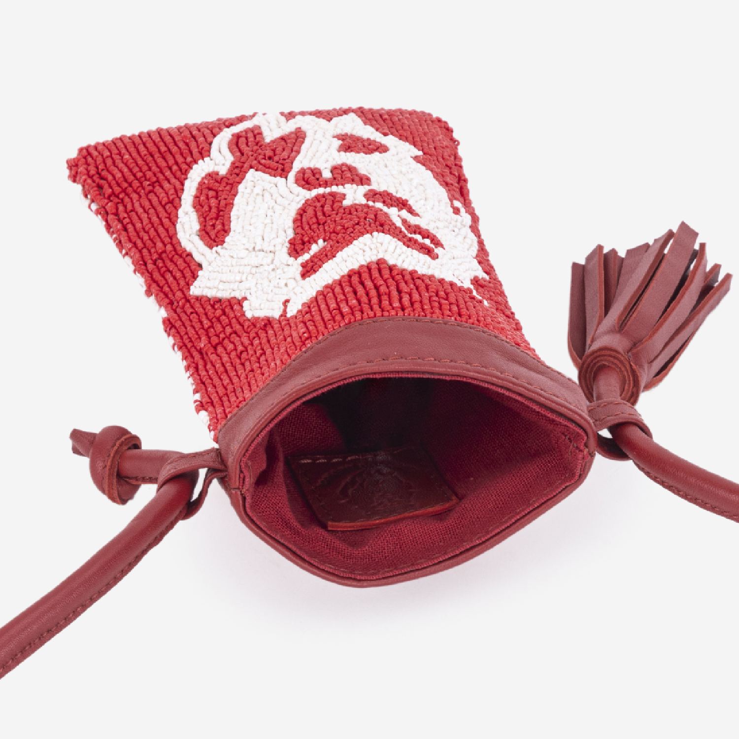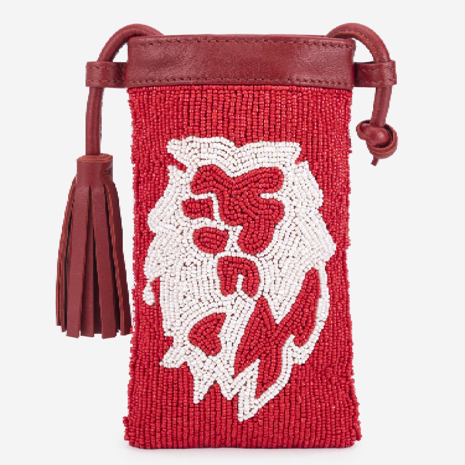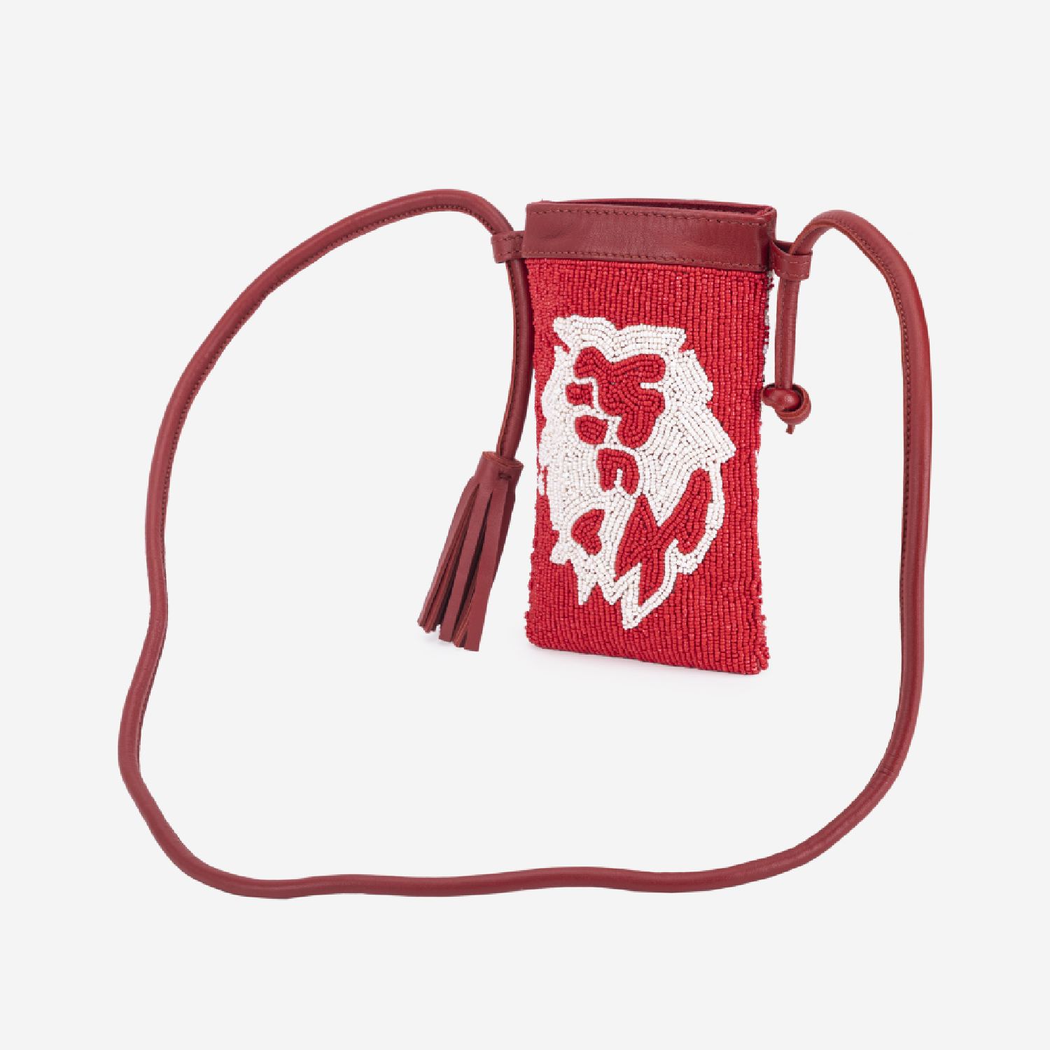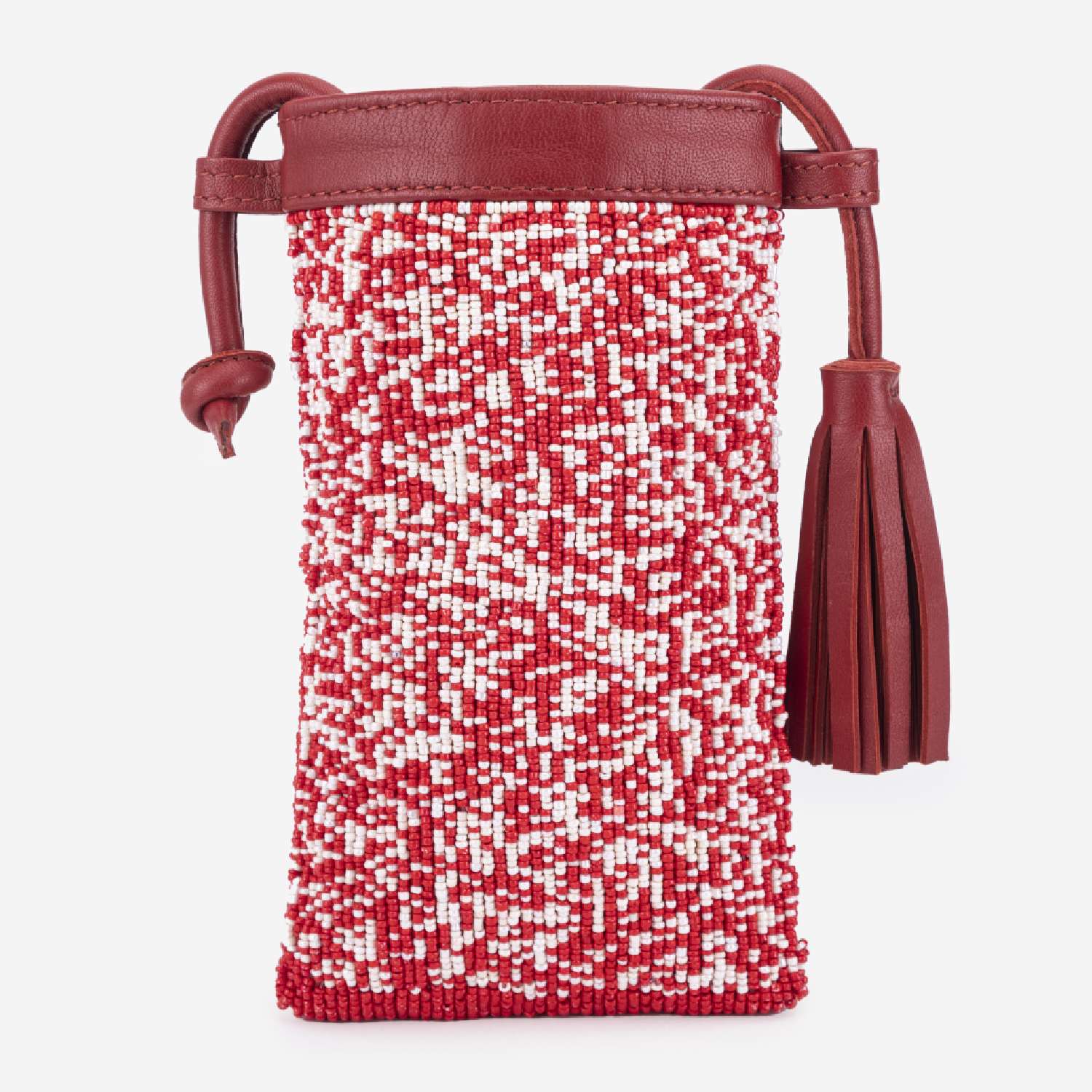 This chic bag is made from a combination of leather and beads, providing a mix of textures. The bag has a fringe detailing and is equipped with a magdot closure, ensuring the security of your belongings. This sling bag features red and white colors, offering elegance to the look. Pair it with a dress and oversized sunglasses for a boho look.
