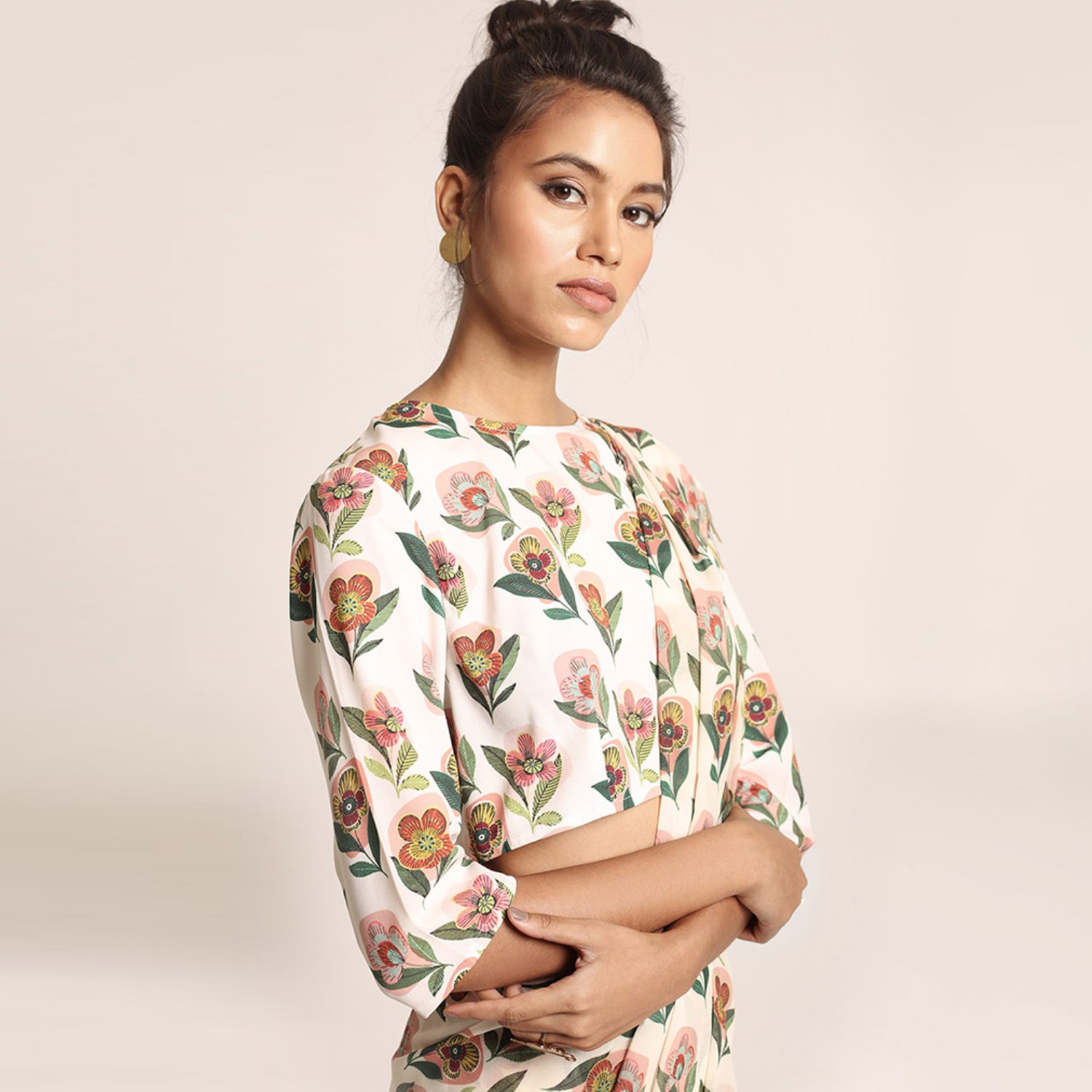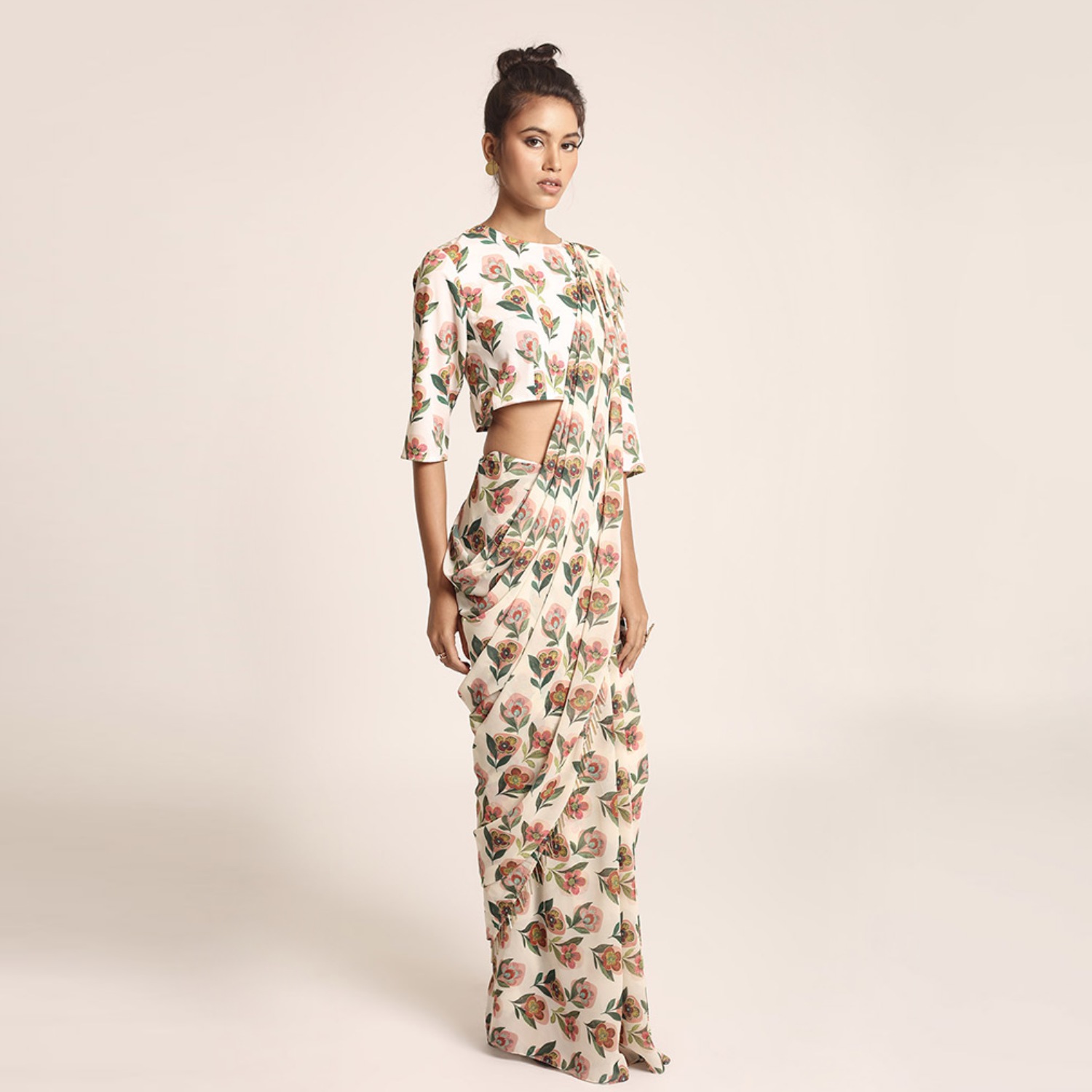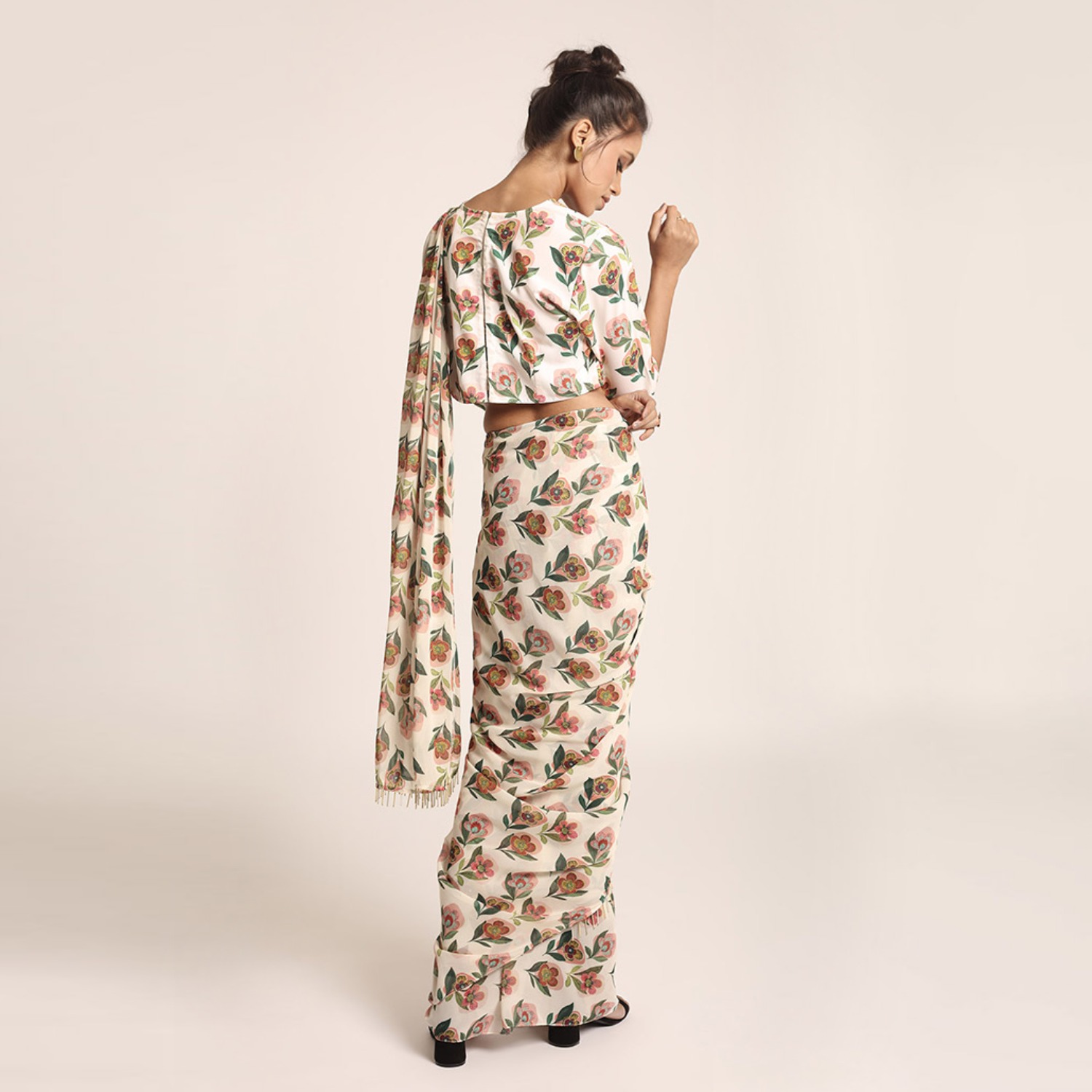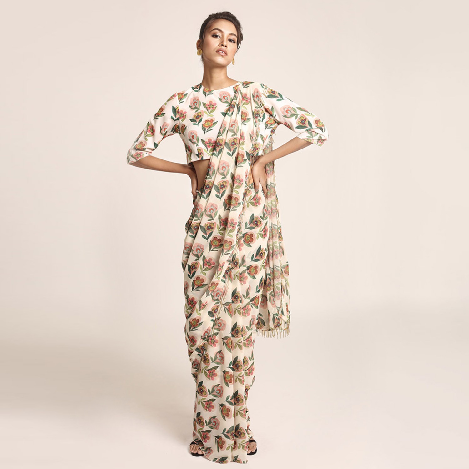 Crafted from high-quality crepe fabric, this set comes in a soft cream shade. It features a floral print choli and matching saree with tassel detailing, adding elegance to the look. Style it with statement earrings and heels for a dressy soiree.