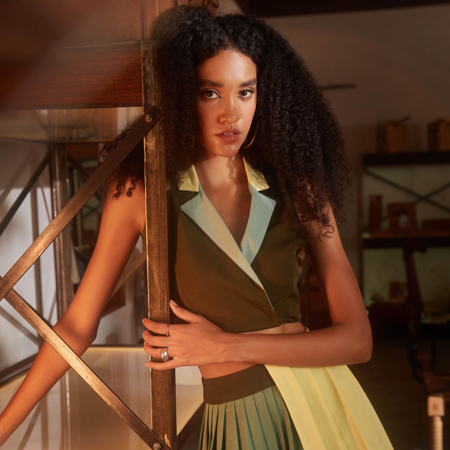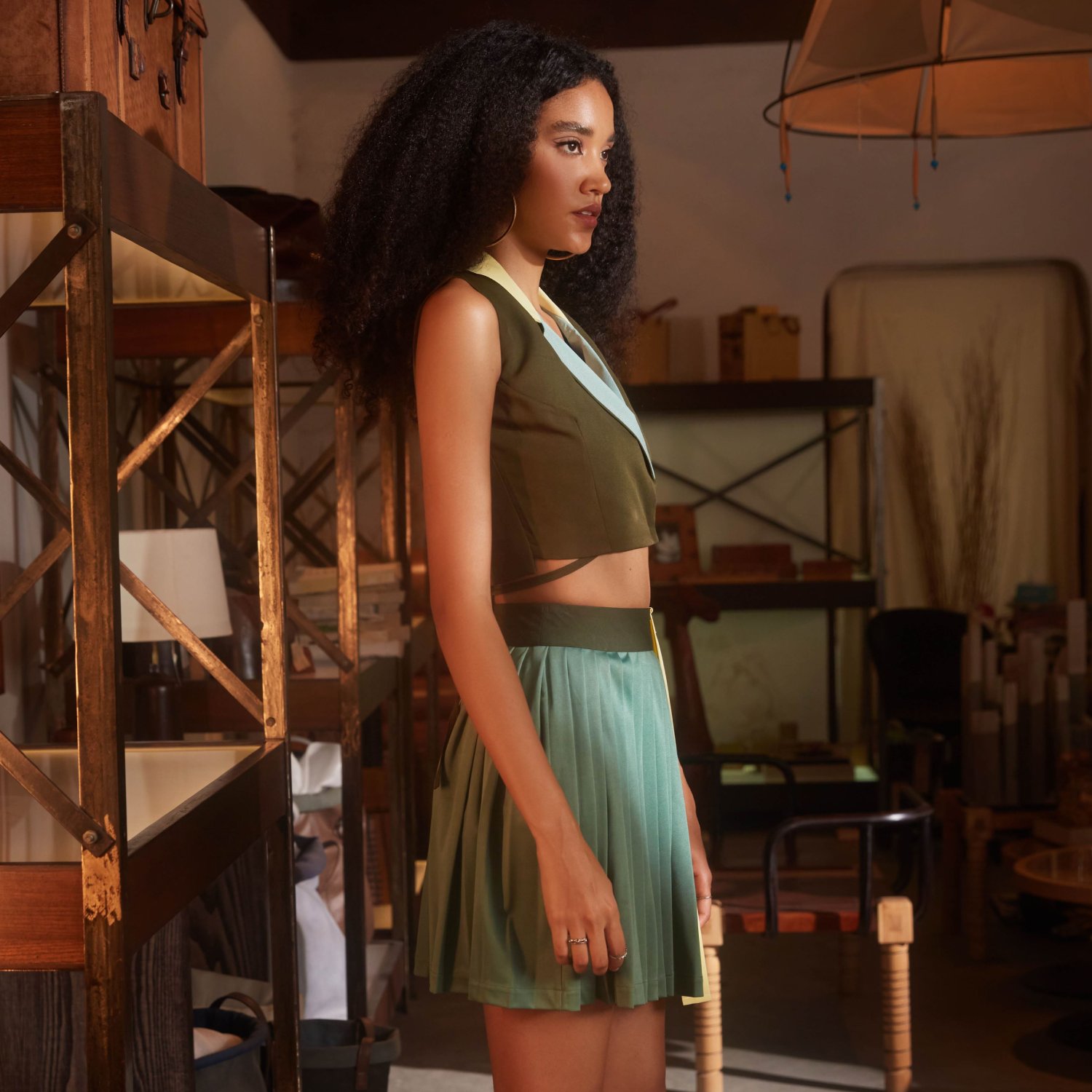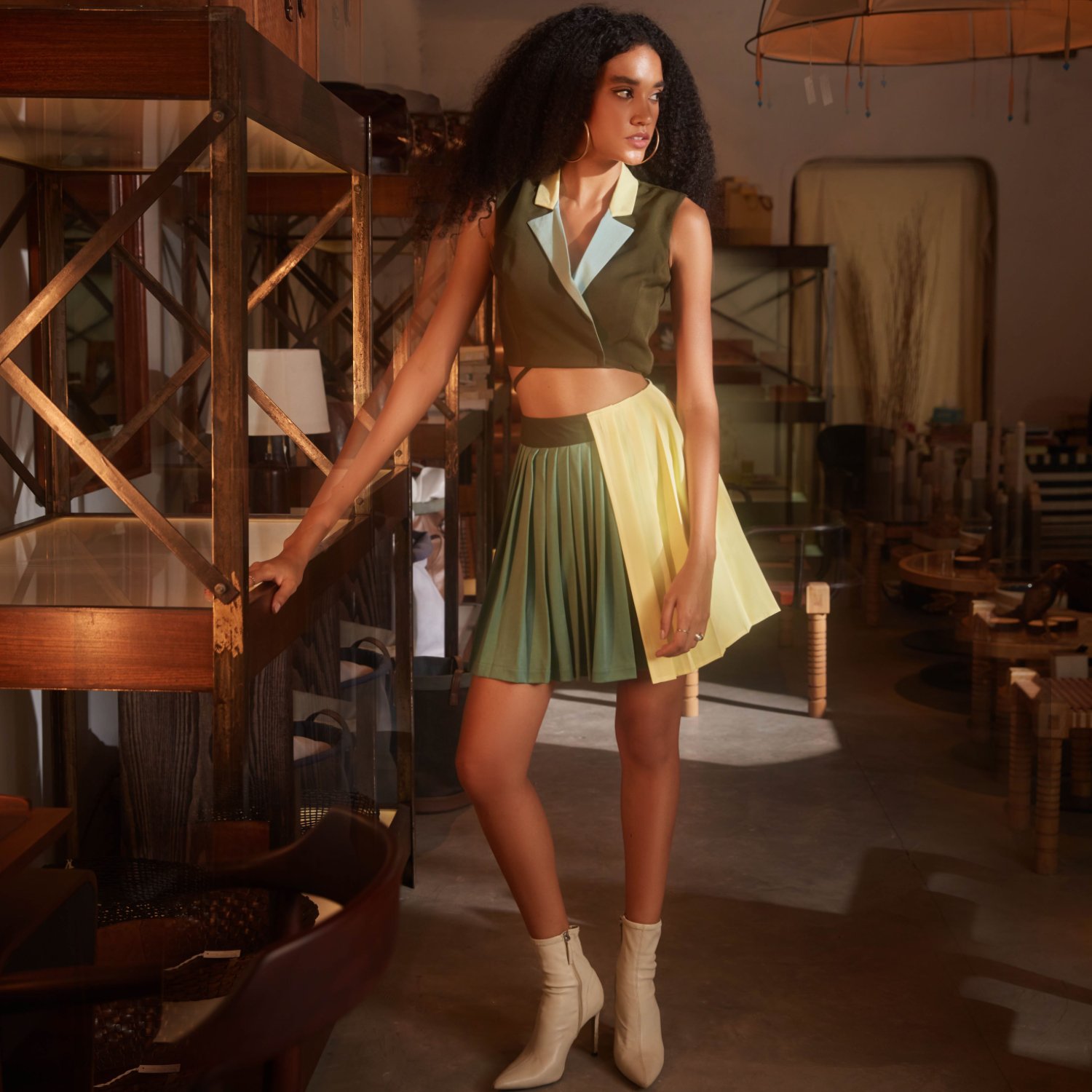 This two-piece set comprises a sleeveless crop top with an open collar neckline and a waist tie. The tiffany blue and lemon collar adds a pop of color, contrasting beautifully with the olive top. This set has a tiffany blue high-waist skirt featuring an olive waistband and a broad knife-pleated lemon side. Pair this understated outfit with statement earrings and heels for a day event.