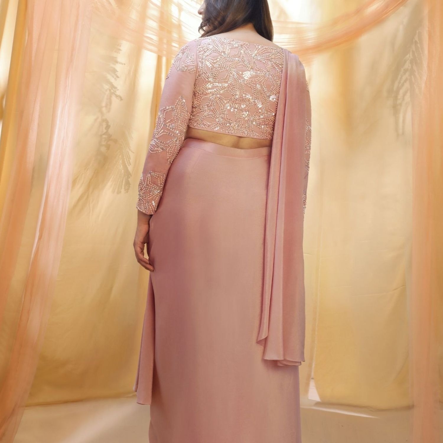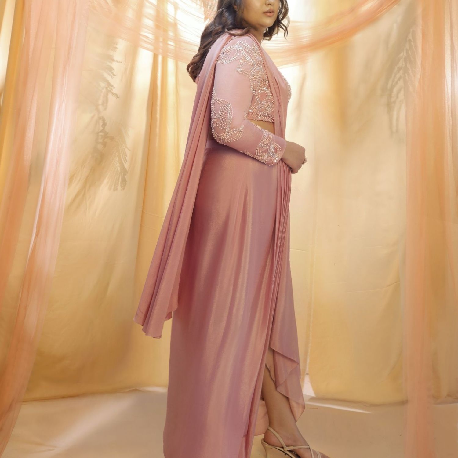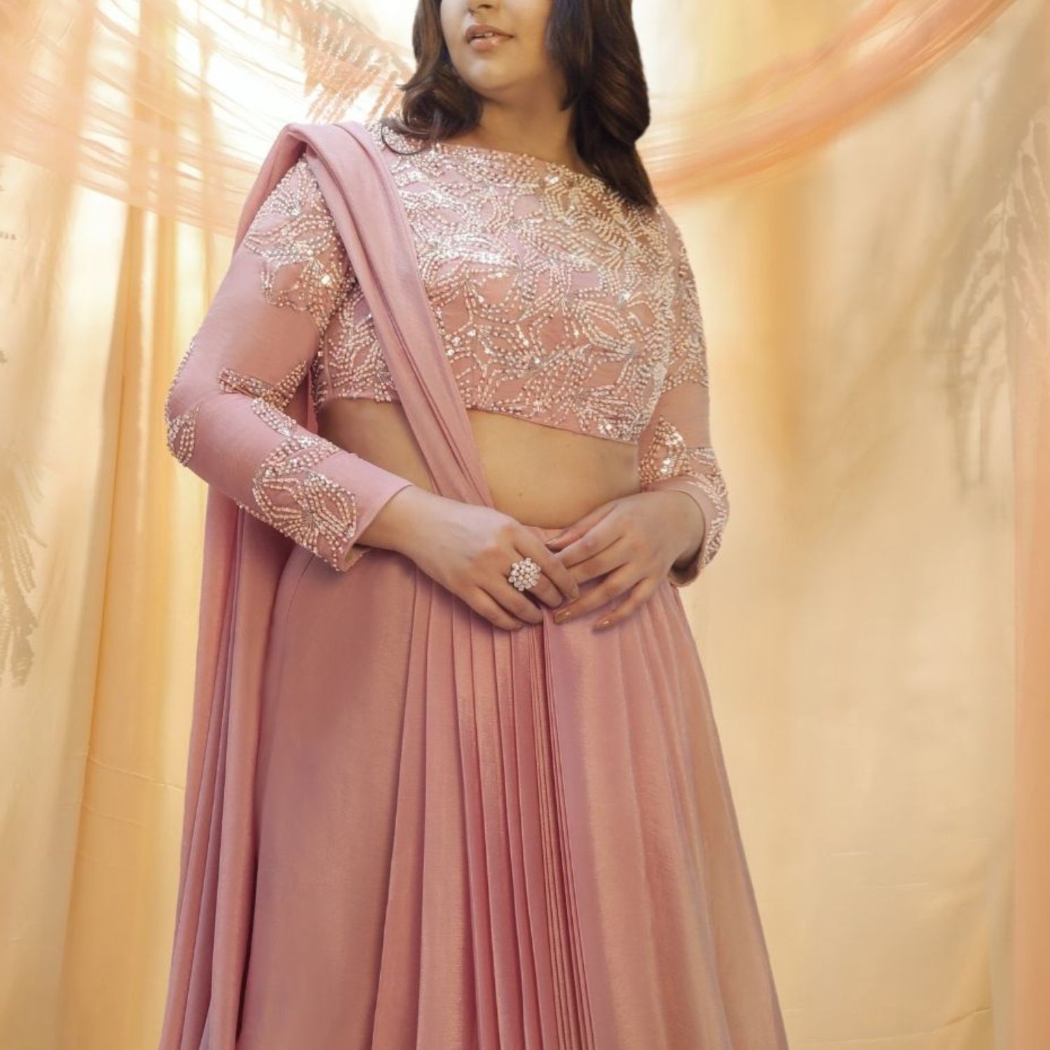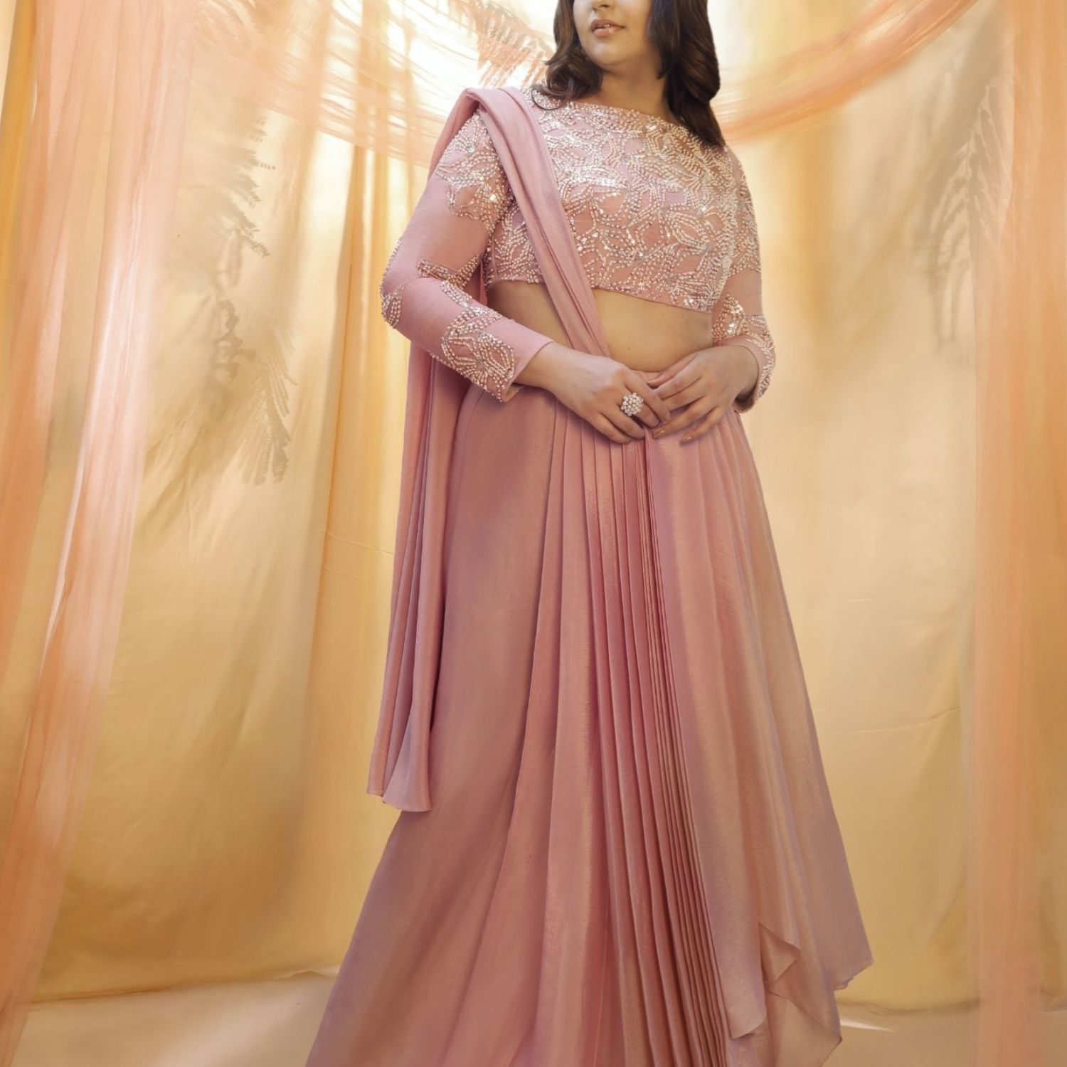 ₹ 28,000 (10% off)Embrace opulence with this resplendent rose gold drape dhoti, paired with a meticulously crafted heavy embroidered blouse. This exquisite ensemble showcases the perfect fusion of modern and traditional aesthetics. The flowing drape exudes grace, while the blouse's intricate embroidery adds a regal charm. Step into the spotlight and make a statement in this captivating attire that exudes timeless elegance.