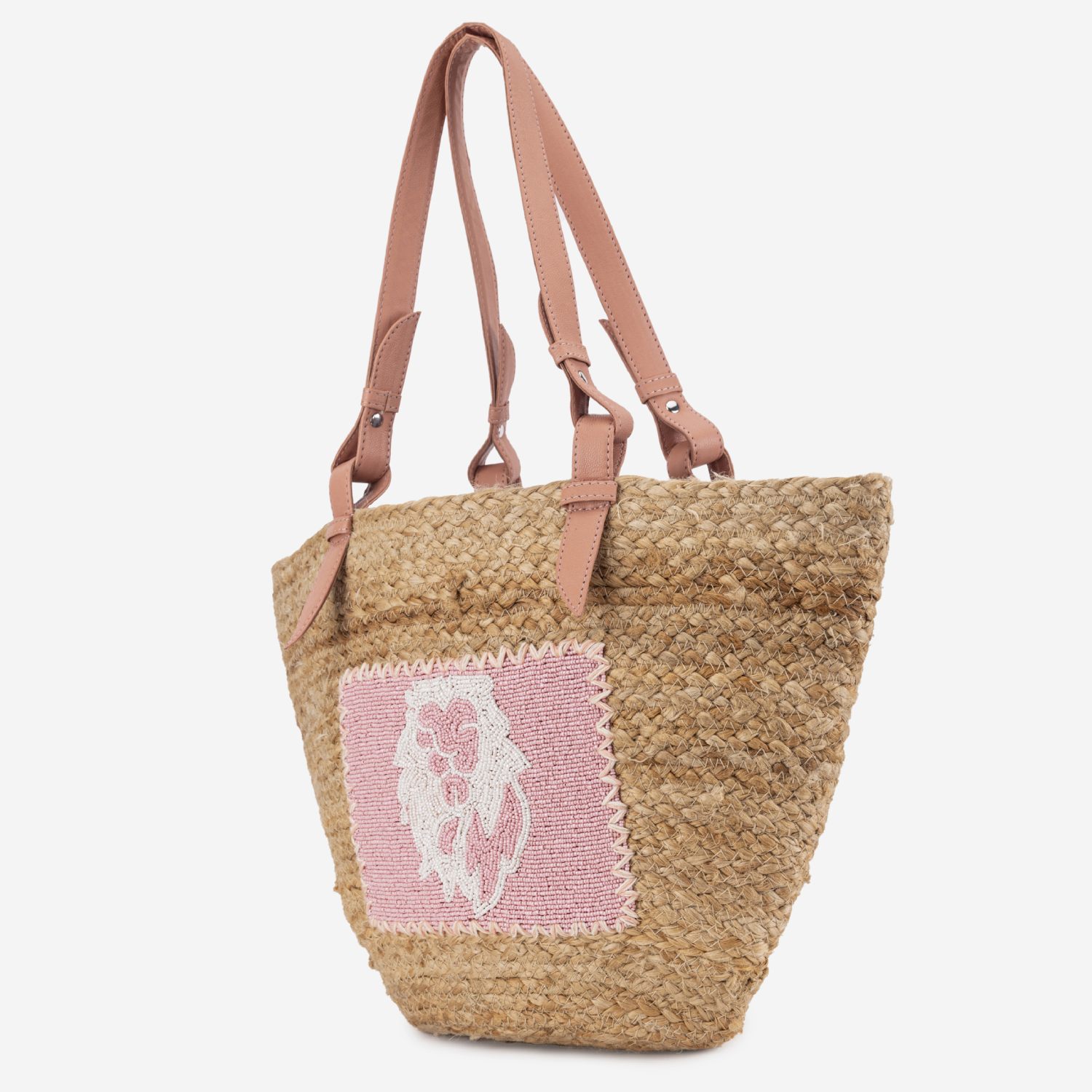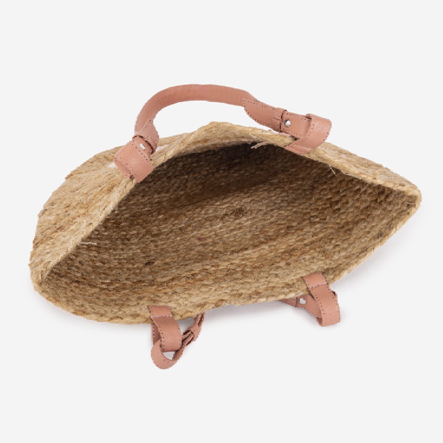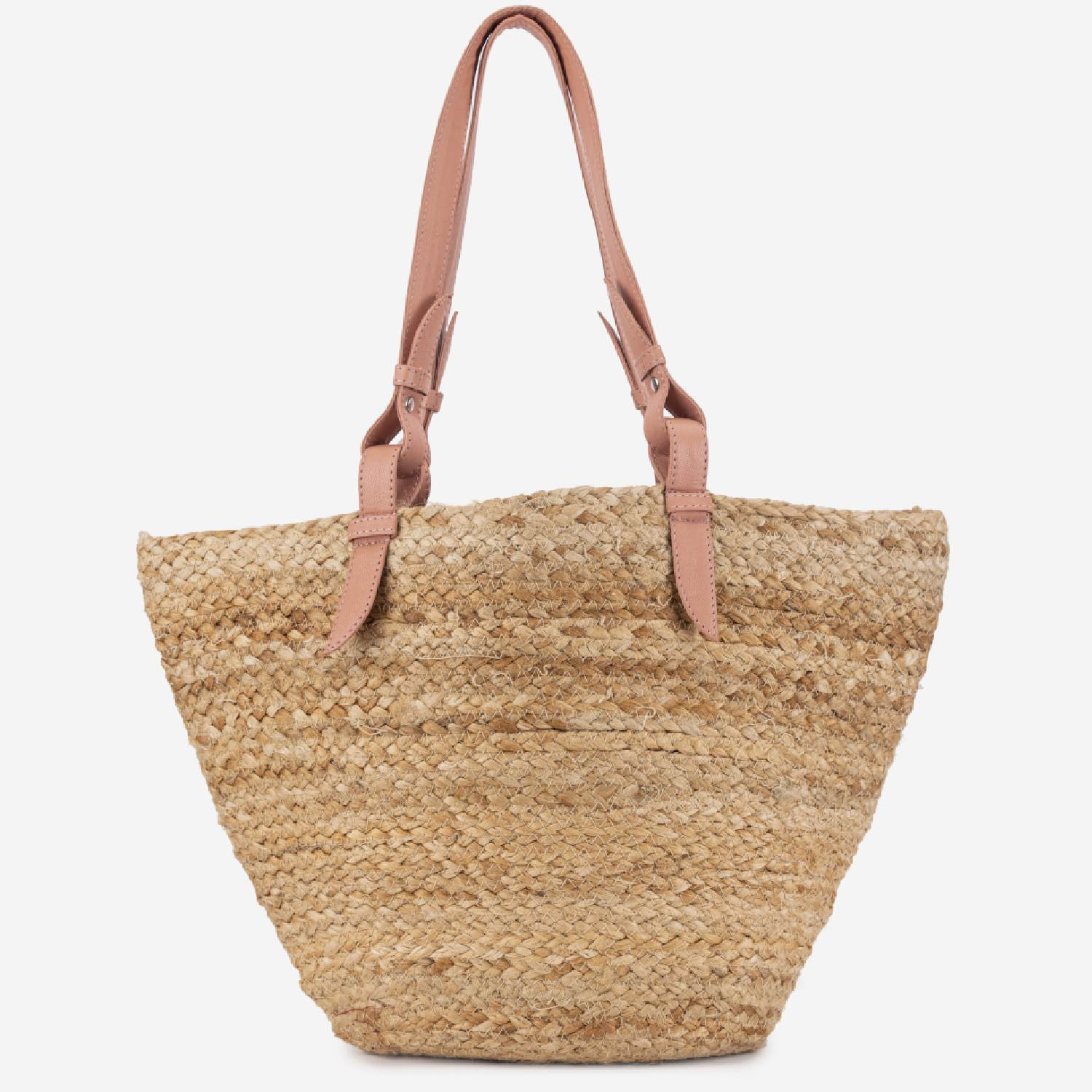 This gorgeous bag features a combination of rose pink and beige jute, giving it a natural and earthy aesthetic. It comes with a black leather handle, adding elegance and durability to the bag. This small tote has an open closure, allowing for easy access to your belongings.