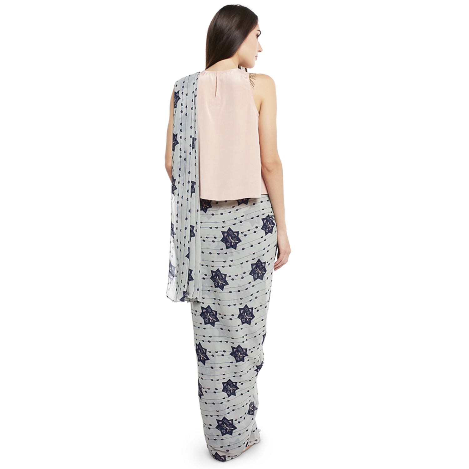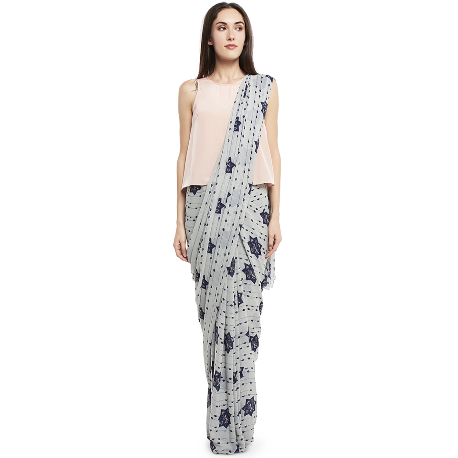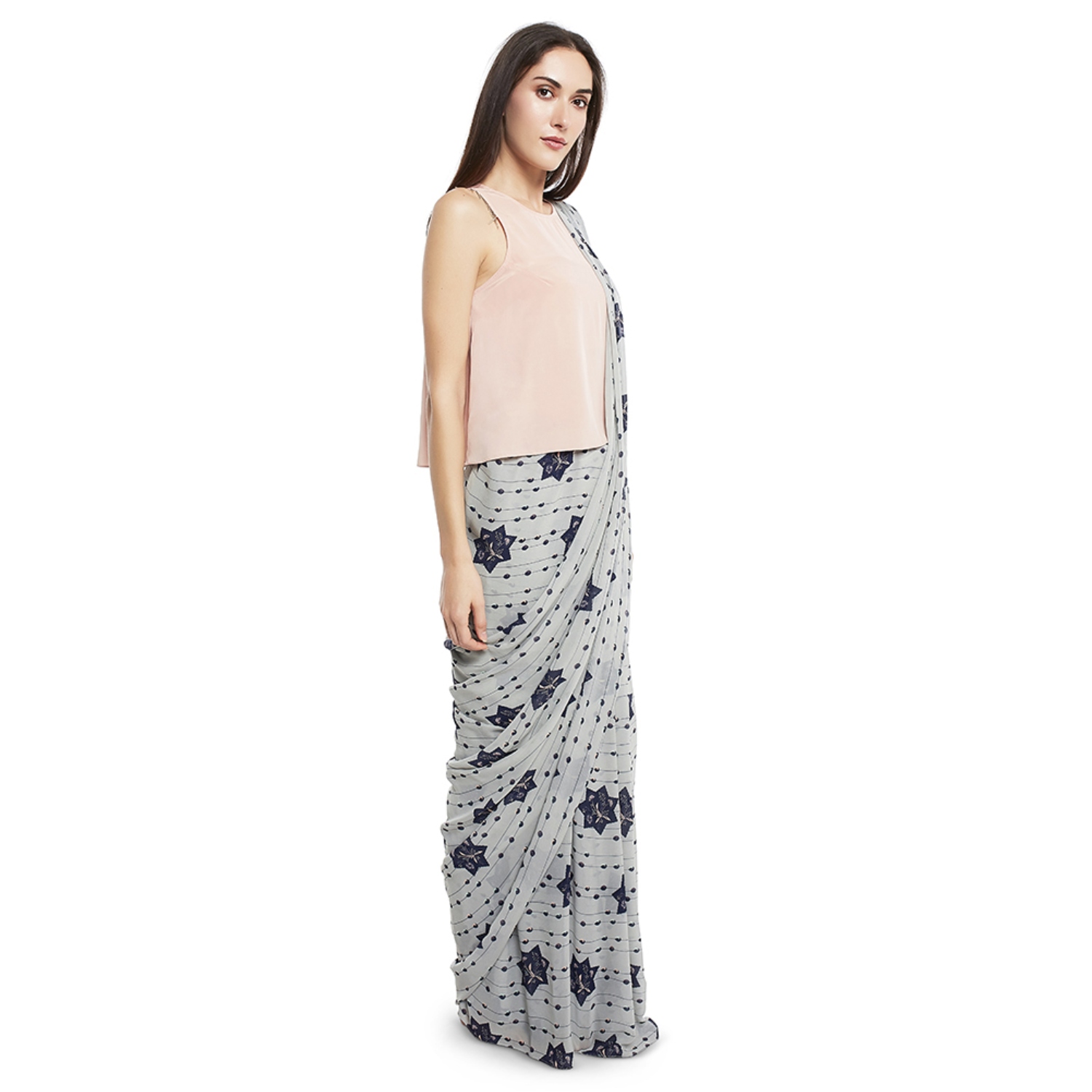This stunning set features a solid sleeveless rose pink crepe top, which offers a modern and eye-catching design. The set comes with a grey saree featuring a contrasting star print in georgette, adding elegance to the look. Pair it with dangling earrings and a sling bag for a dressy event.