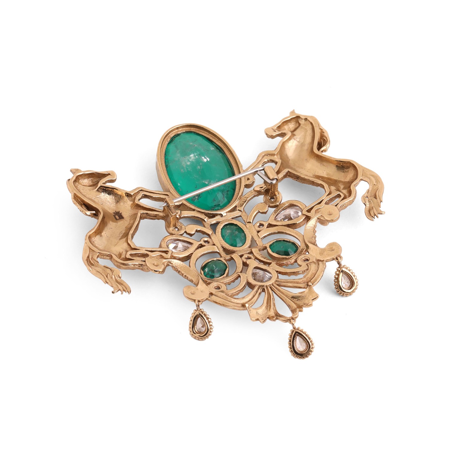 ₹ 7,800 (5% off)This brooch is a stunning accessory that features two intricately designed galloping horses. Adorned with four stunning green gemstones on a gold base, this brooch exudes a sense of elegance and vitality. It is a striking and meaningful piece that can add character and sophistication to your outfit, making it a perfect choice for special events or occasions.