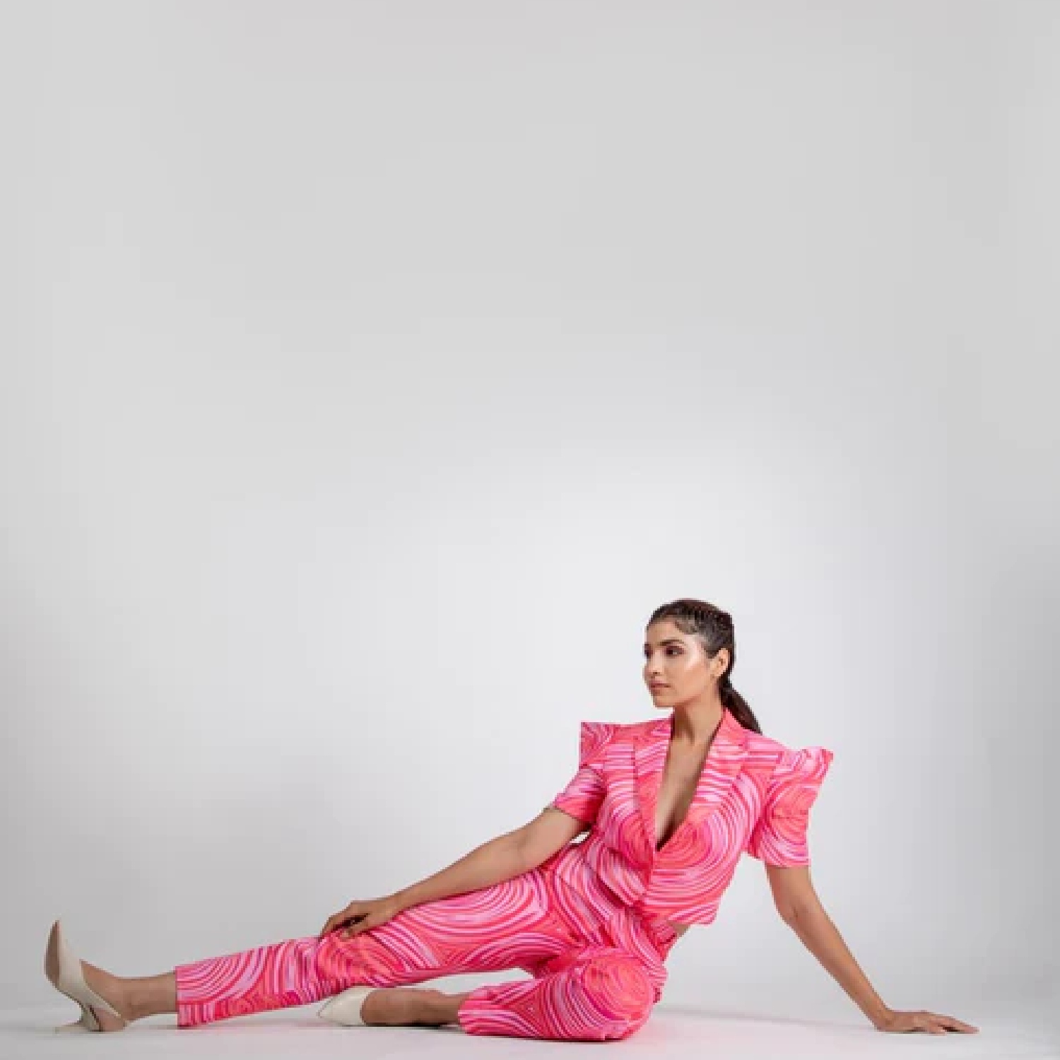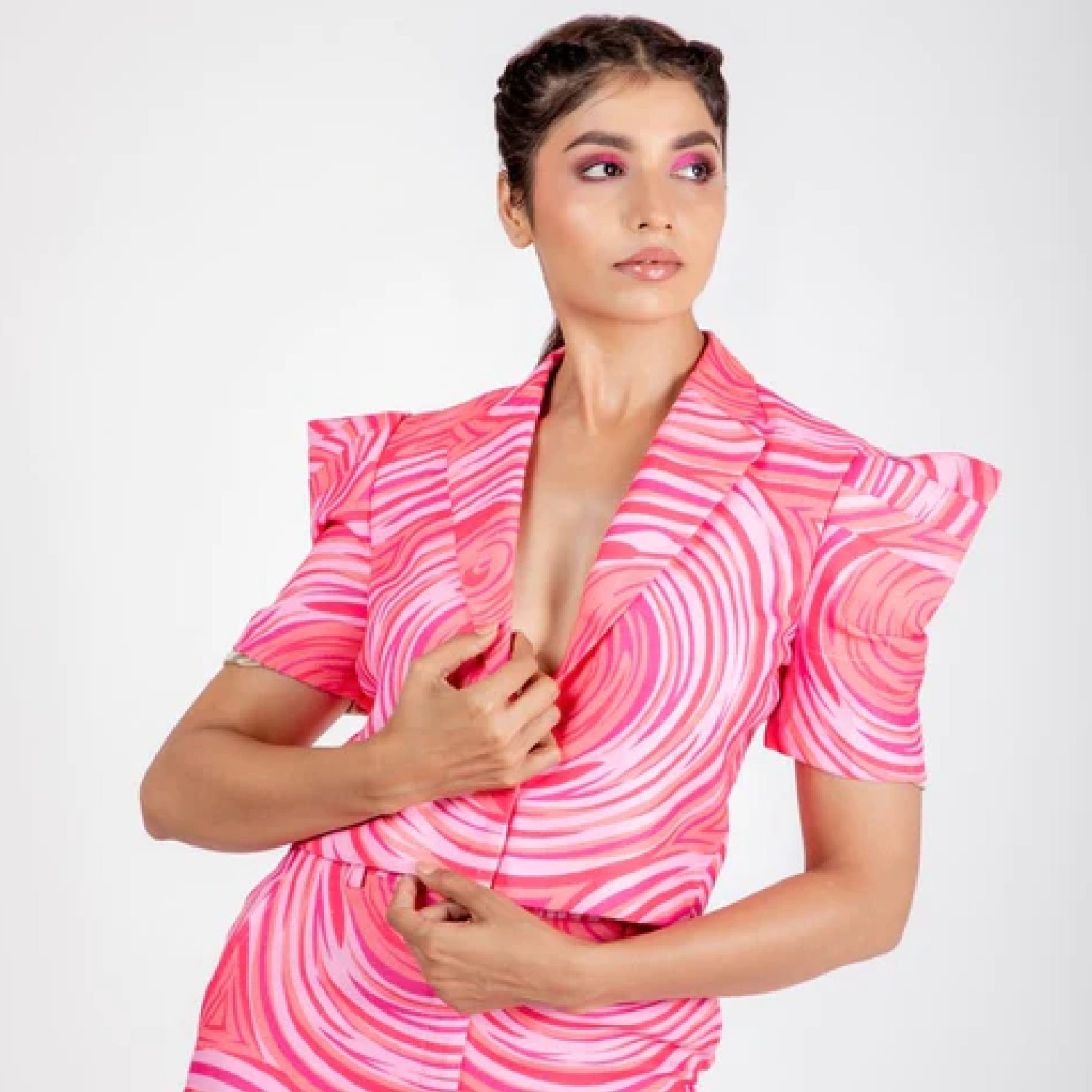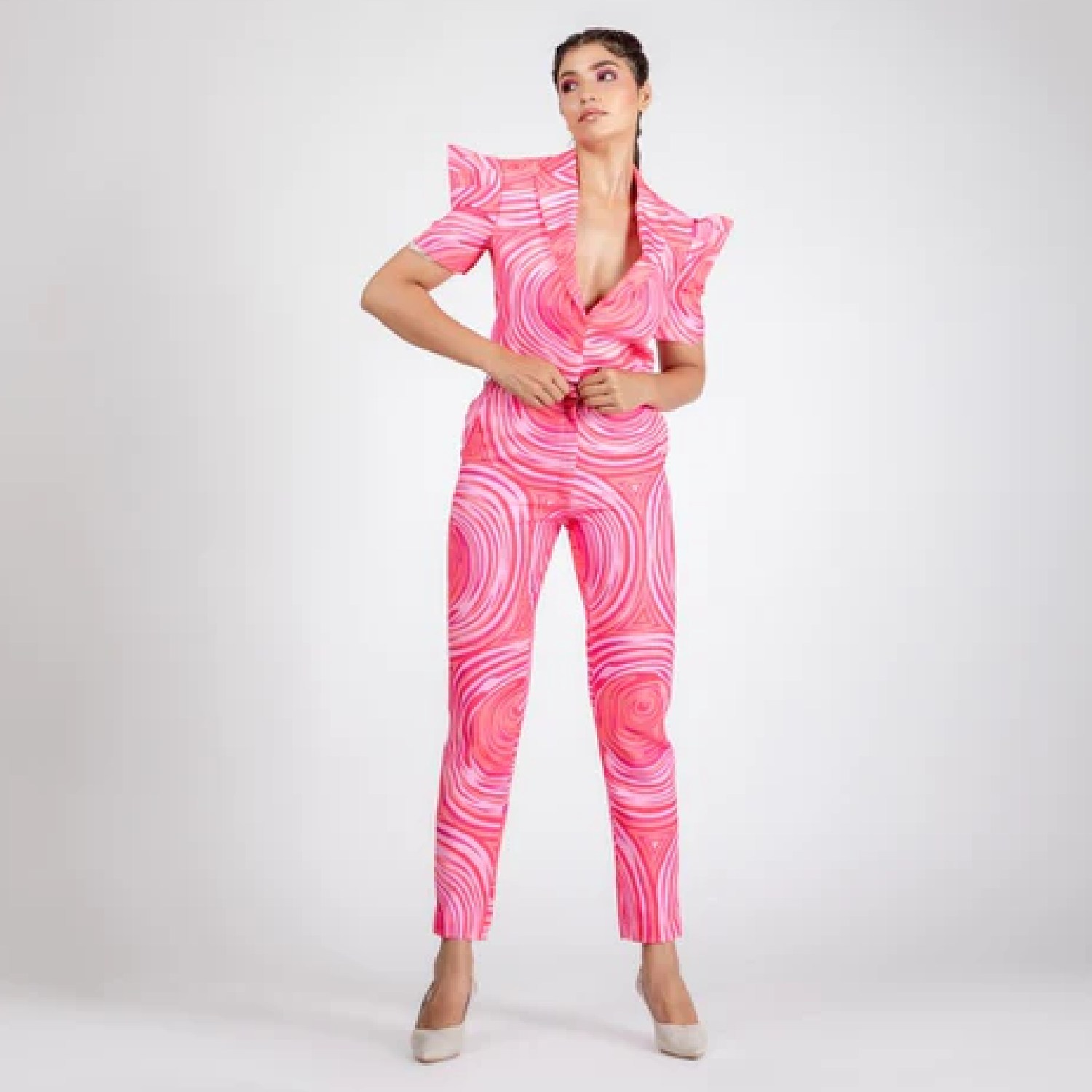 ₹ 4,700 (25% off)This stunning blazer is crafted from high-quality linen fabric. It features round white prints on a pink base, dramatic sleeves, cropped length and a fitted silhouette, offering a flattering look. Style it with minimal accessories and heels for a dressy event.