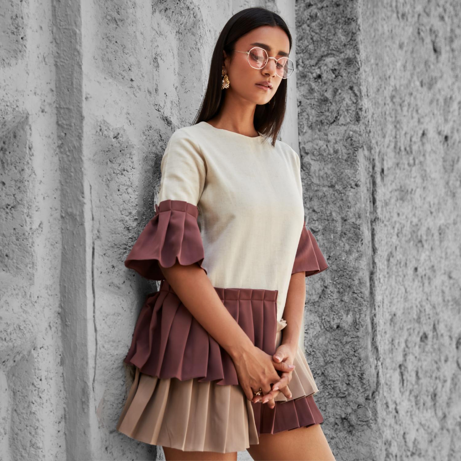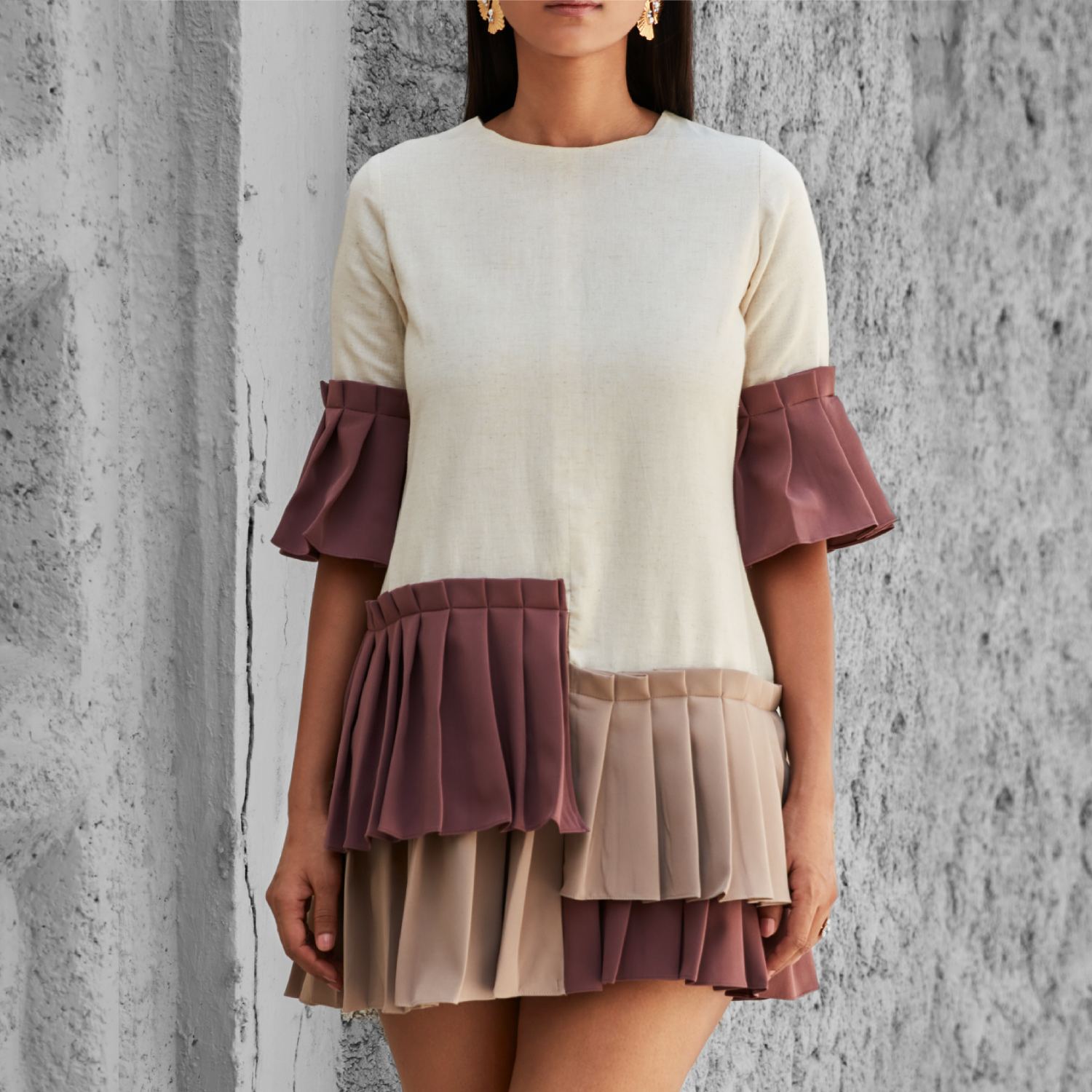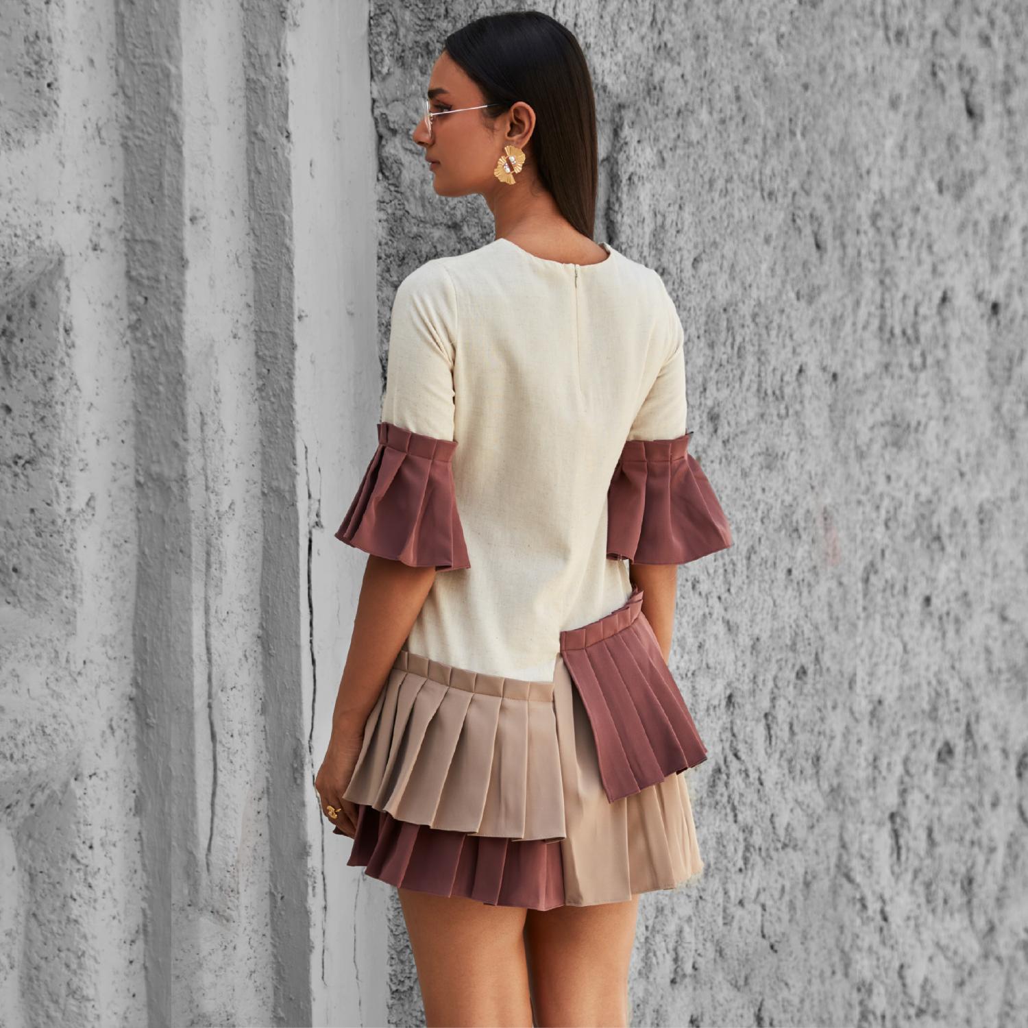 This elegant shift dress in off-white features a unique knife-pleated tiered hem in mauve and greige. It has a classic round neckline and is designed with elbow-length sleeves with a knife-pleated flared mauve cuff. Pair this dress with statement earrings and heels for a chic look.