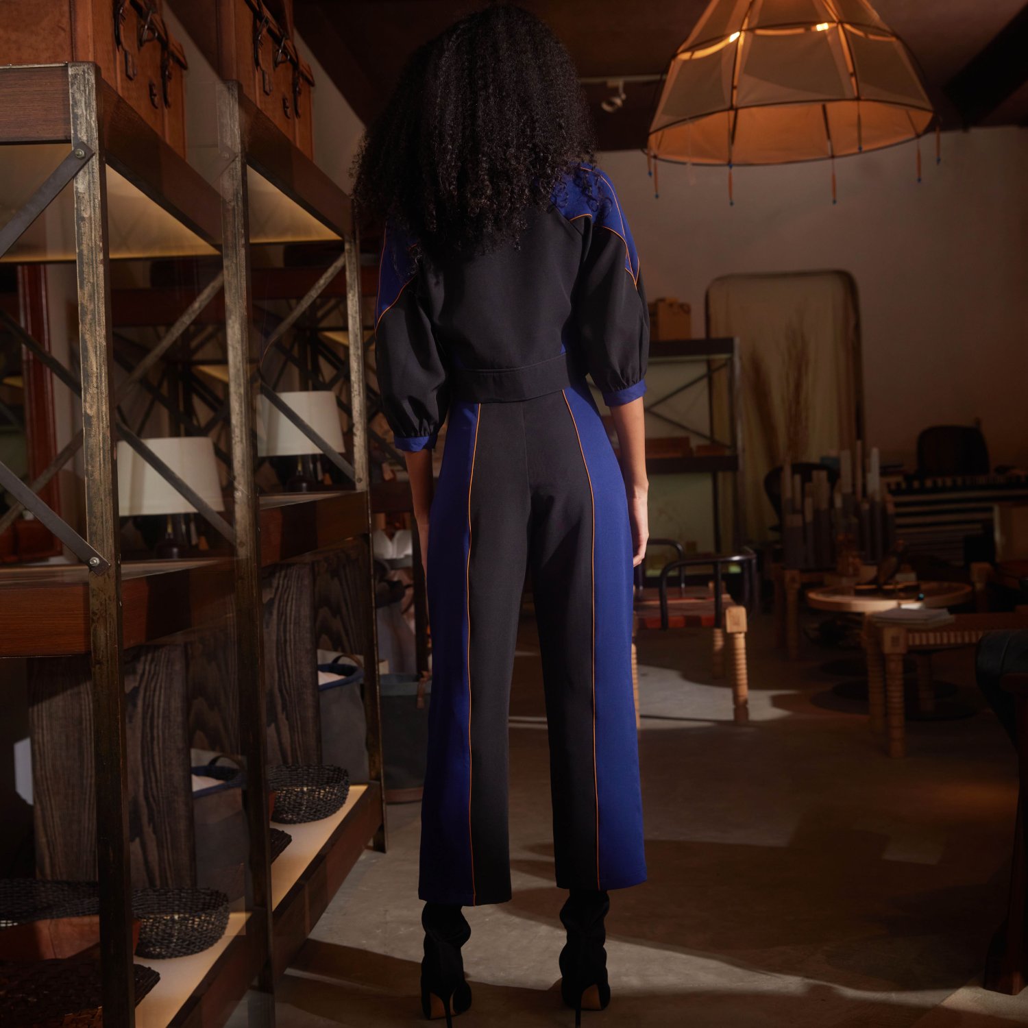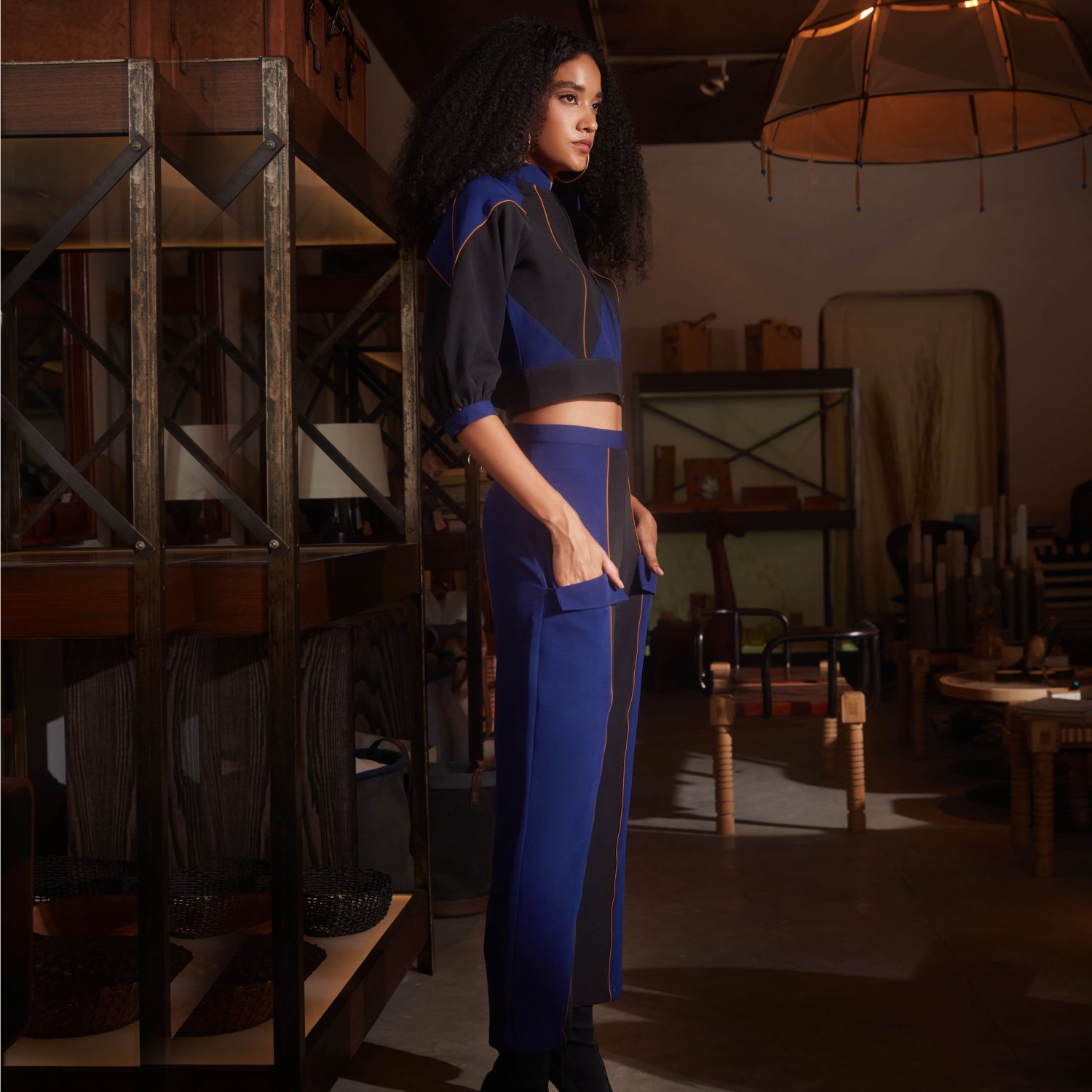 This color-blocked two-piece set has a mix of navy blue, black, and vibrant apricot orange highlights, creating a striking visual contrast. It features a cropped jacket with raglan sleeves, a band collar, a front zipper and a waistband. Complementing the top is a pair of straight trousers with oblique flap pockets and a concealed side zip. Pair this set with pointed-toe heels and minimalistic accessories for a dressy evening soiree.