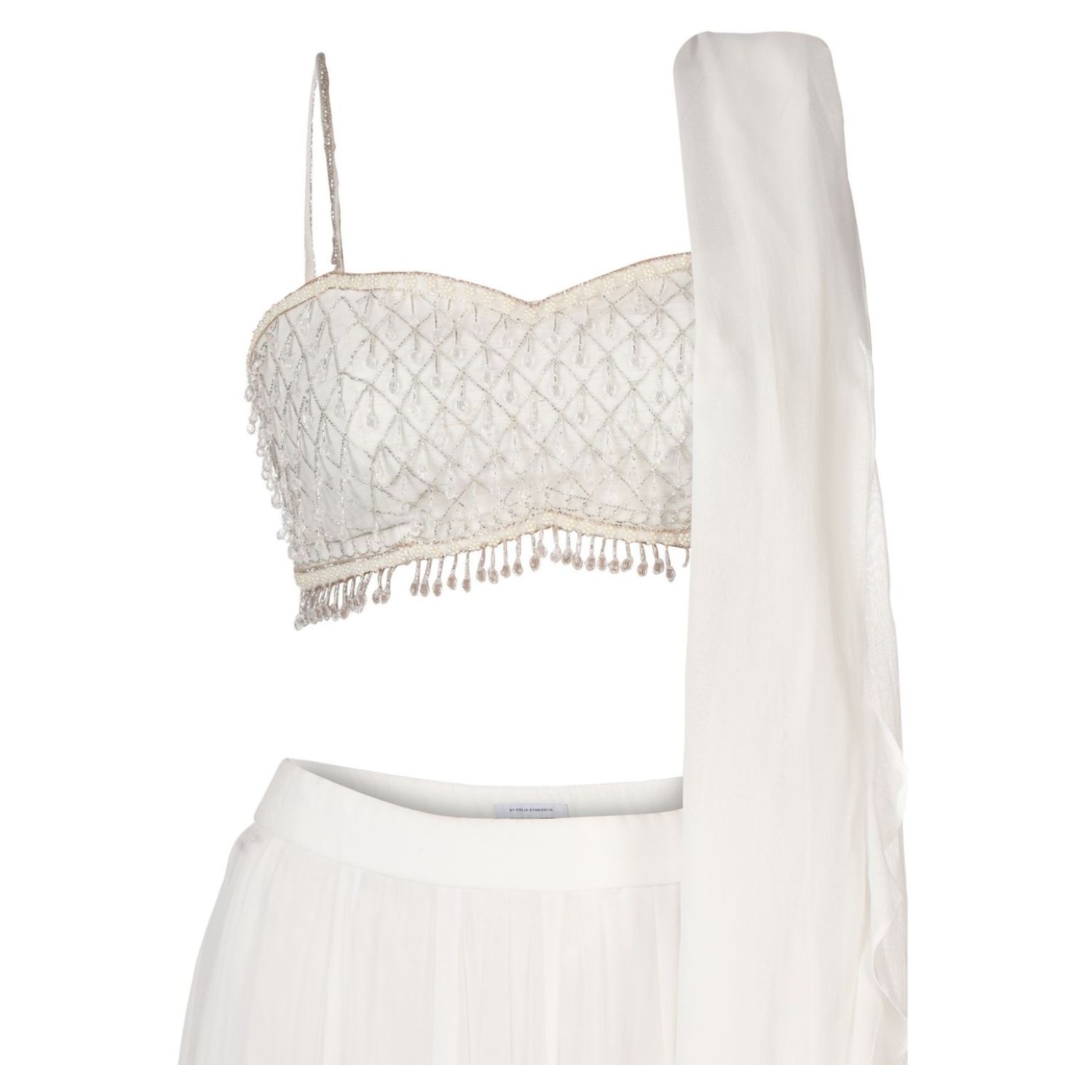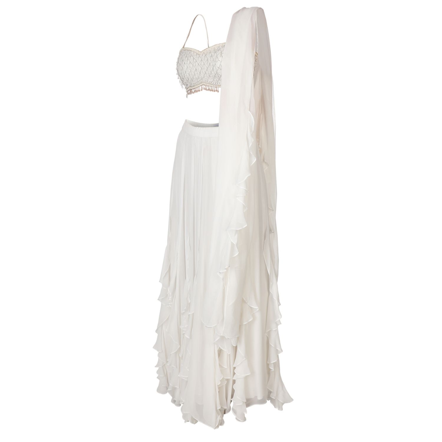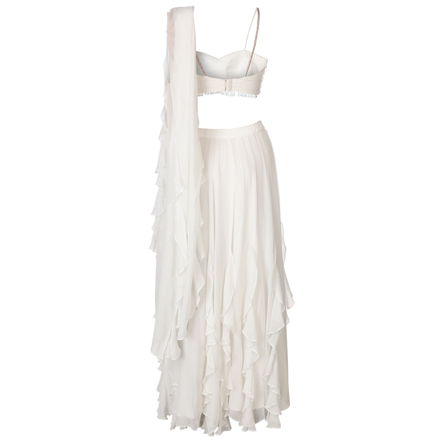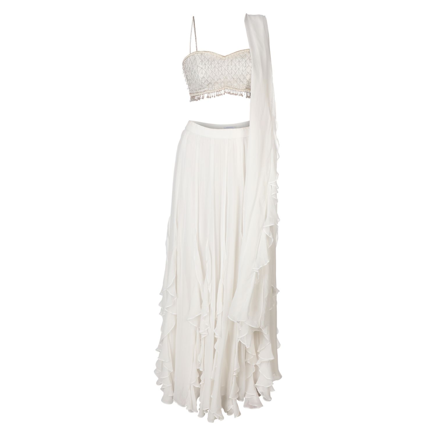 ₹ 40,000 (7% off)Embrace the allure of timeless elegance with this bay salt ruffle lehenga set. Crafted in linen silk & tulle, this set features an intricately embellished blouse with ruffled skirt & dupatta. Make a captivating statement with this extraordinary set, exuding grace.
