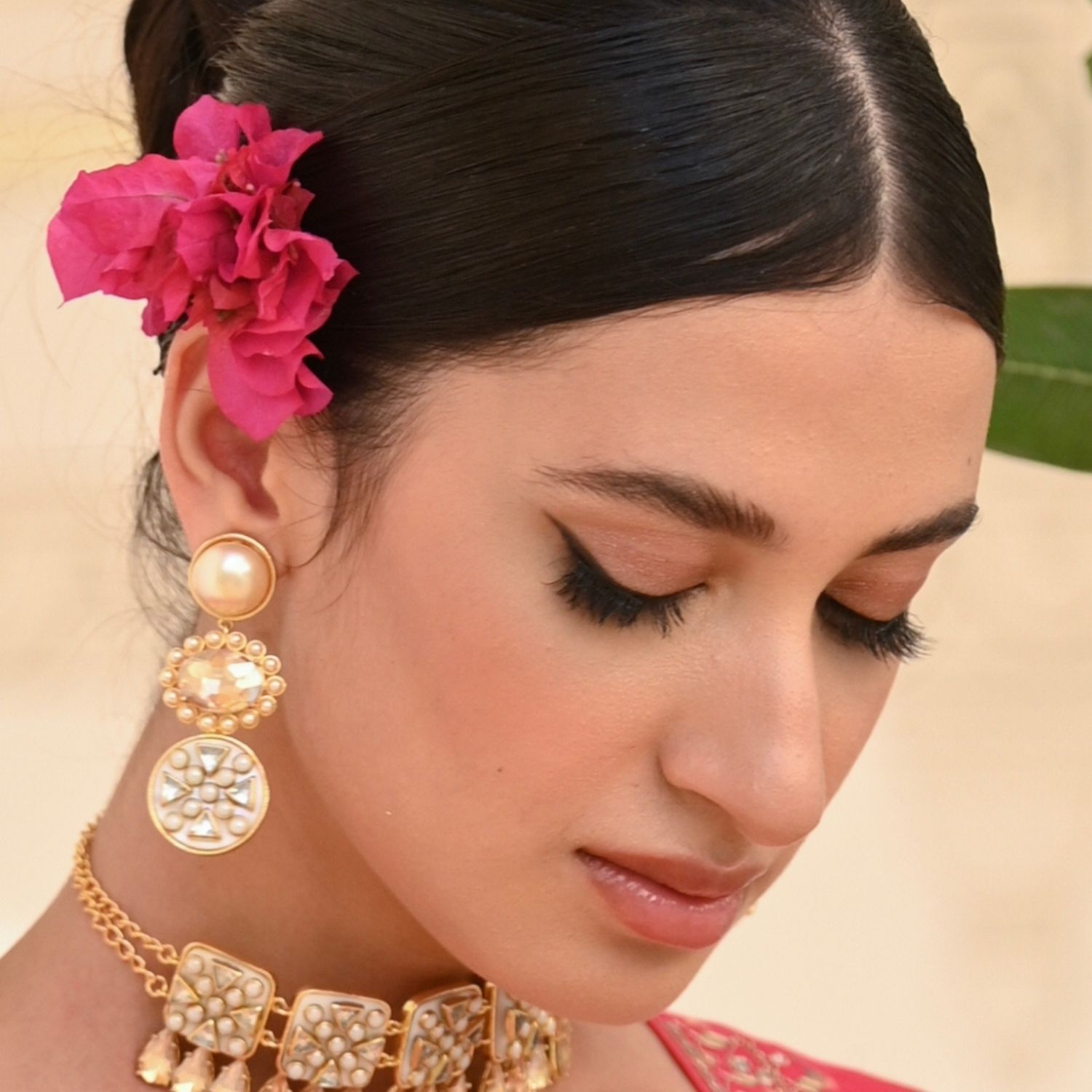 ₹ 5,500 (10% off)Embrace the captivating beauty of this piece, which combines natural ivory stone, pearls, kundan crystals, and swarovski pearls to create a stunning work of art. Allow it to become a treasured addition to your jewelry collection, radiating grace and allure wherever it goes.