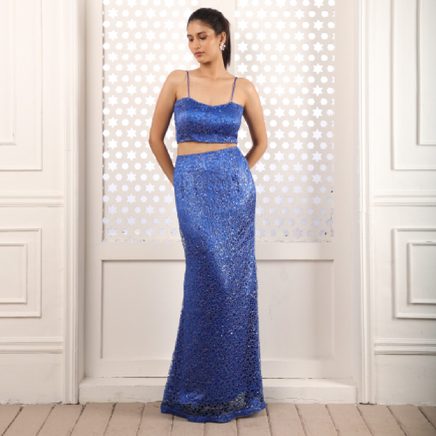A mesmerizing ensemble, the sapphire blue mermaid lehenga crafted with exquisite net fabric exudes elegance and charm. Its form fitting silhouette enhances grace, while the rich blue hue adds a touch of regality. Perfect for special occasions, this lehenga captivates with its intricate design and timeless allure.