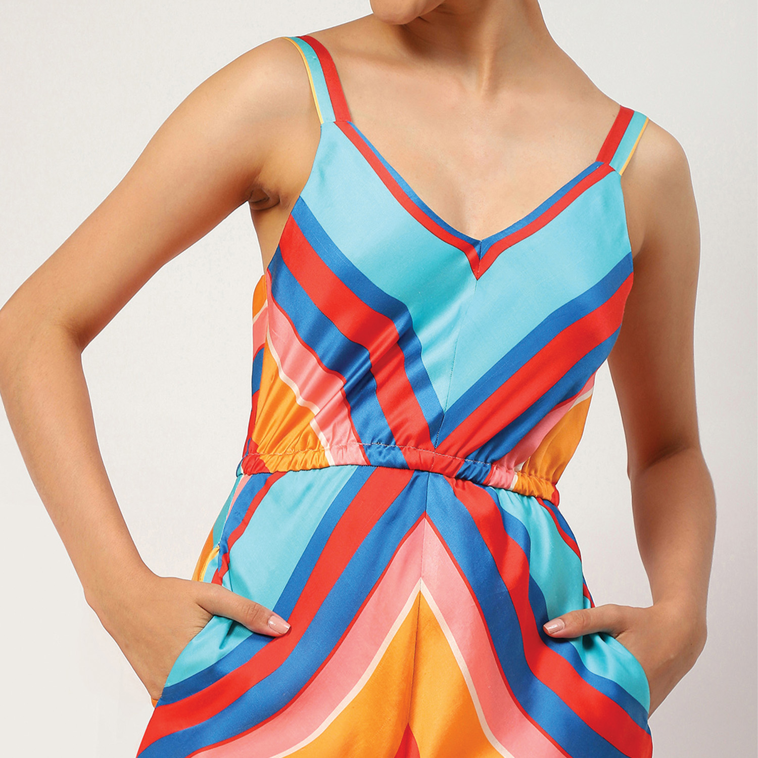 ₹ 7,490 (10% off)Crafted from lightweight and soft satin fabric, this striped print playsuit comes in multicolor. It features well-tailored shoulder straps, straight side pockets and an elasticated waist to add definition. Style it with drop earrings and heels for a dressy brunch date.