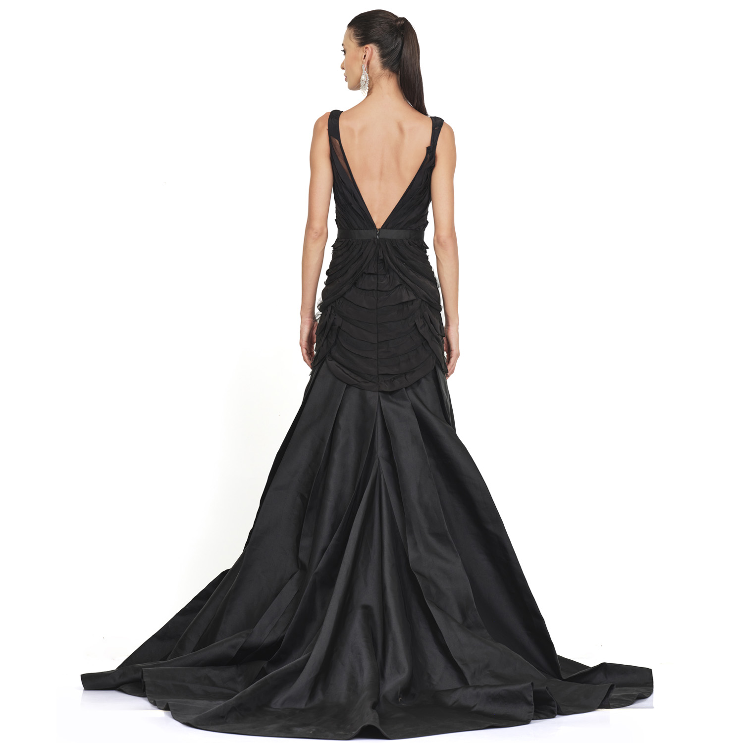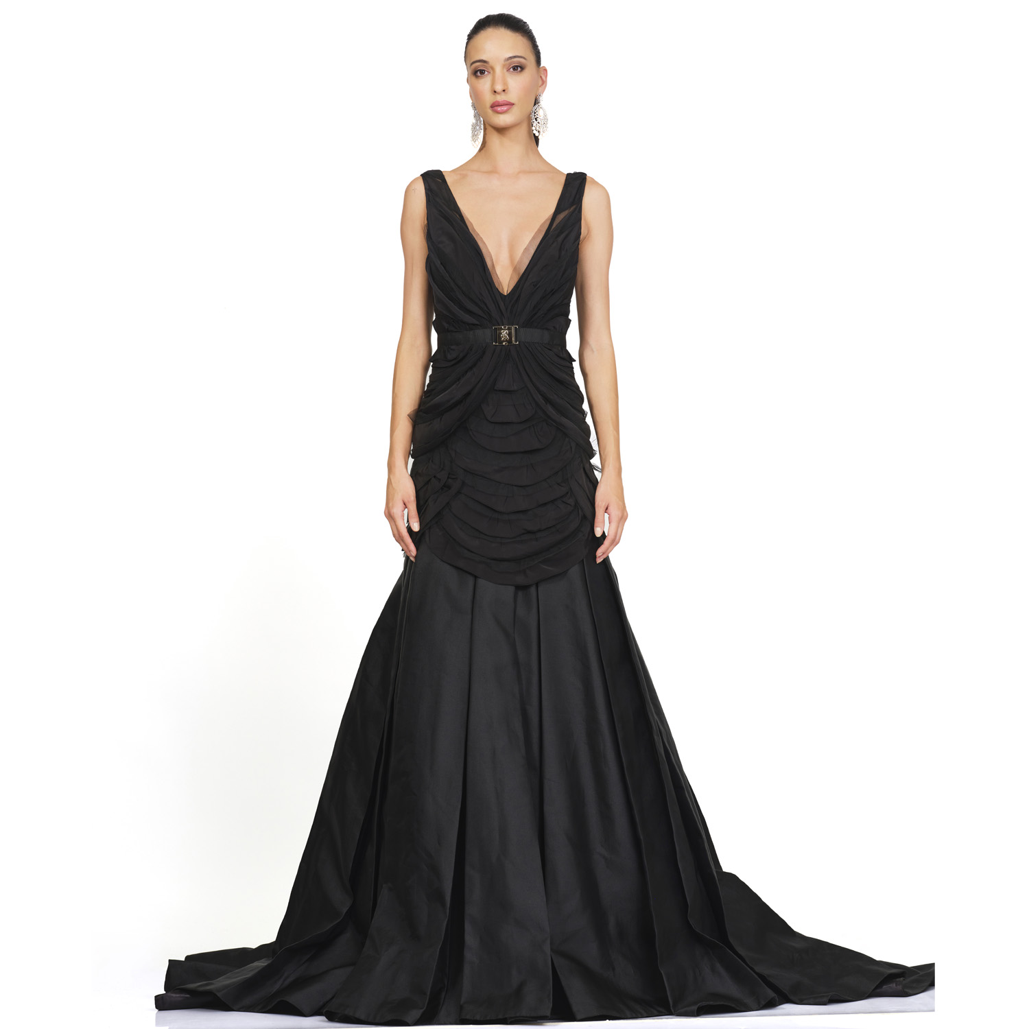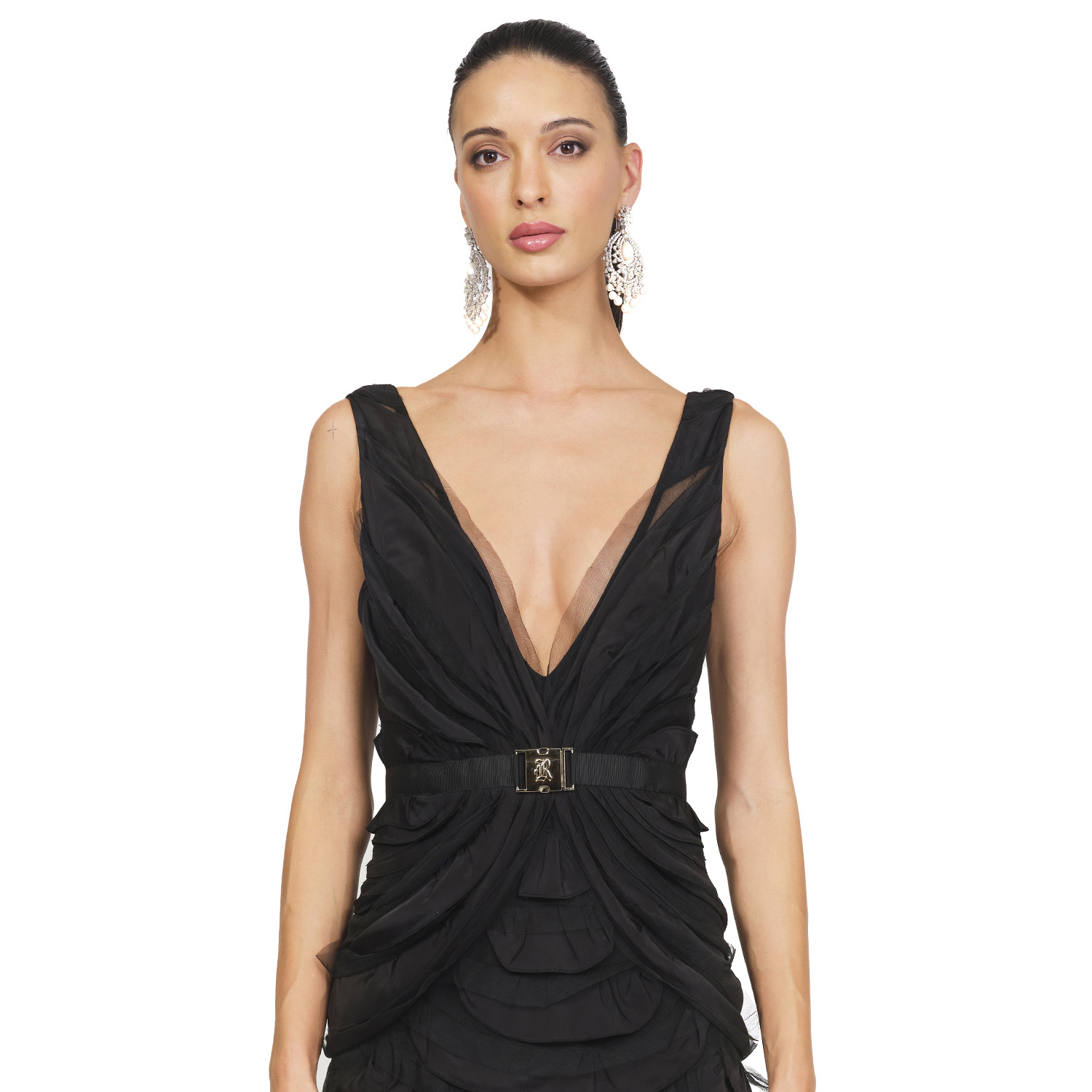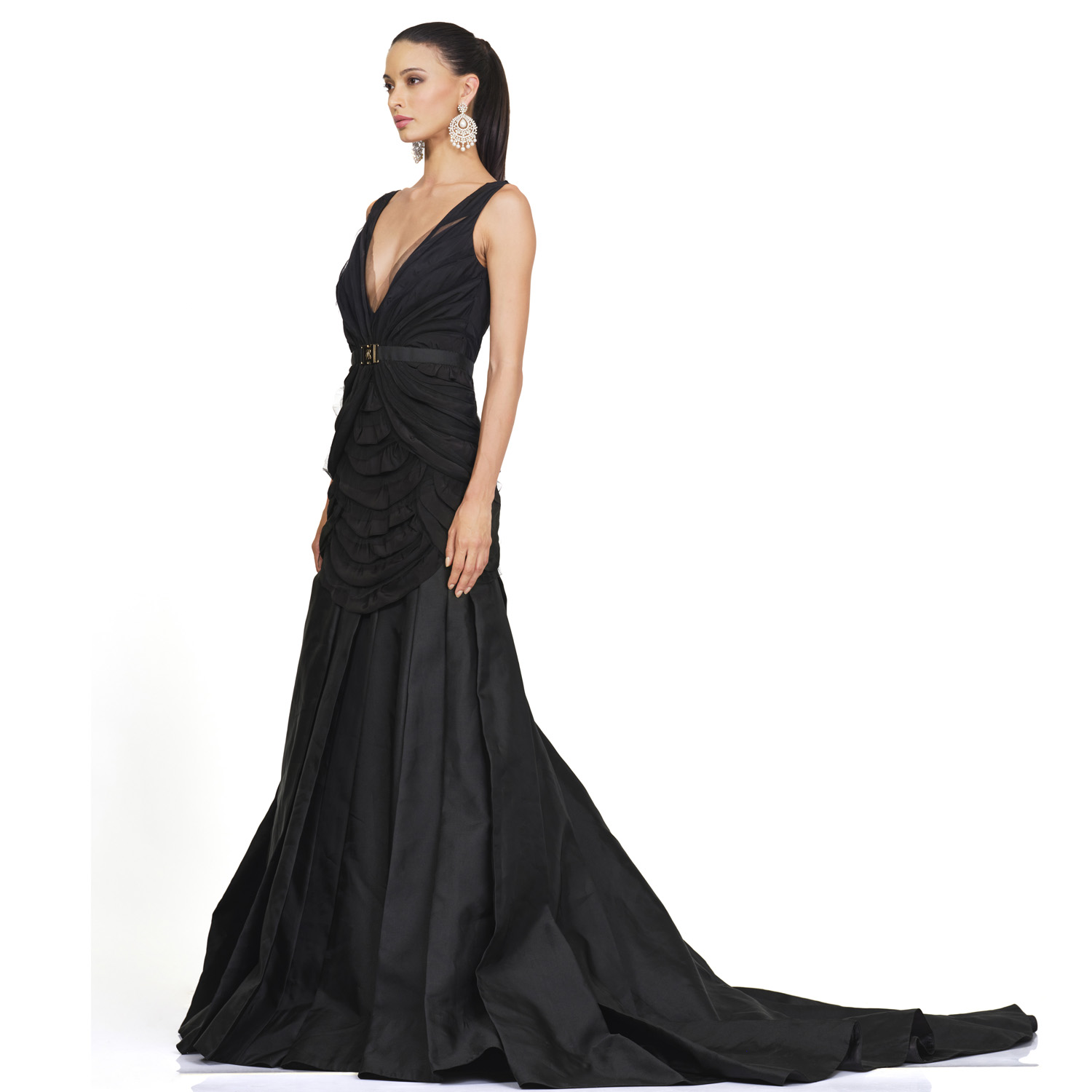This black satin silk gown features a plunging V neckline, belt detail, net ruffles, floor sweeping trail and centre zip closure, offering elegance and ease of wear. Style this dress with delicatr accessories for an elegant evening soiree.