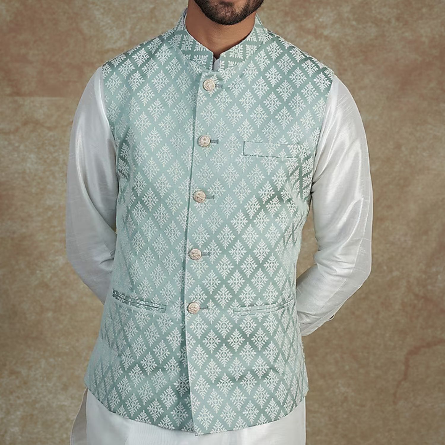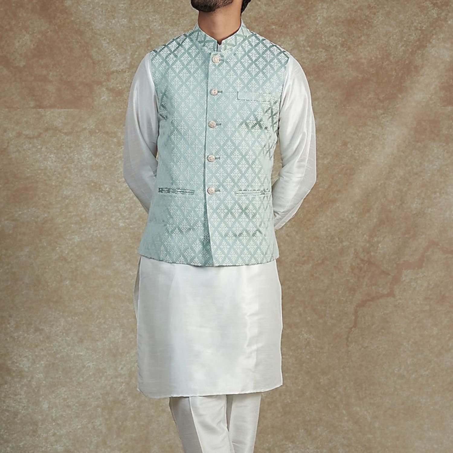 This stunning ensemble is perfect for special occasions or weddings. This sea green self designed jacquard jacket is paired with an off with a white dupion silk kurta and an off white dupion silk churidar pyjama.