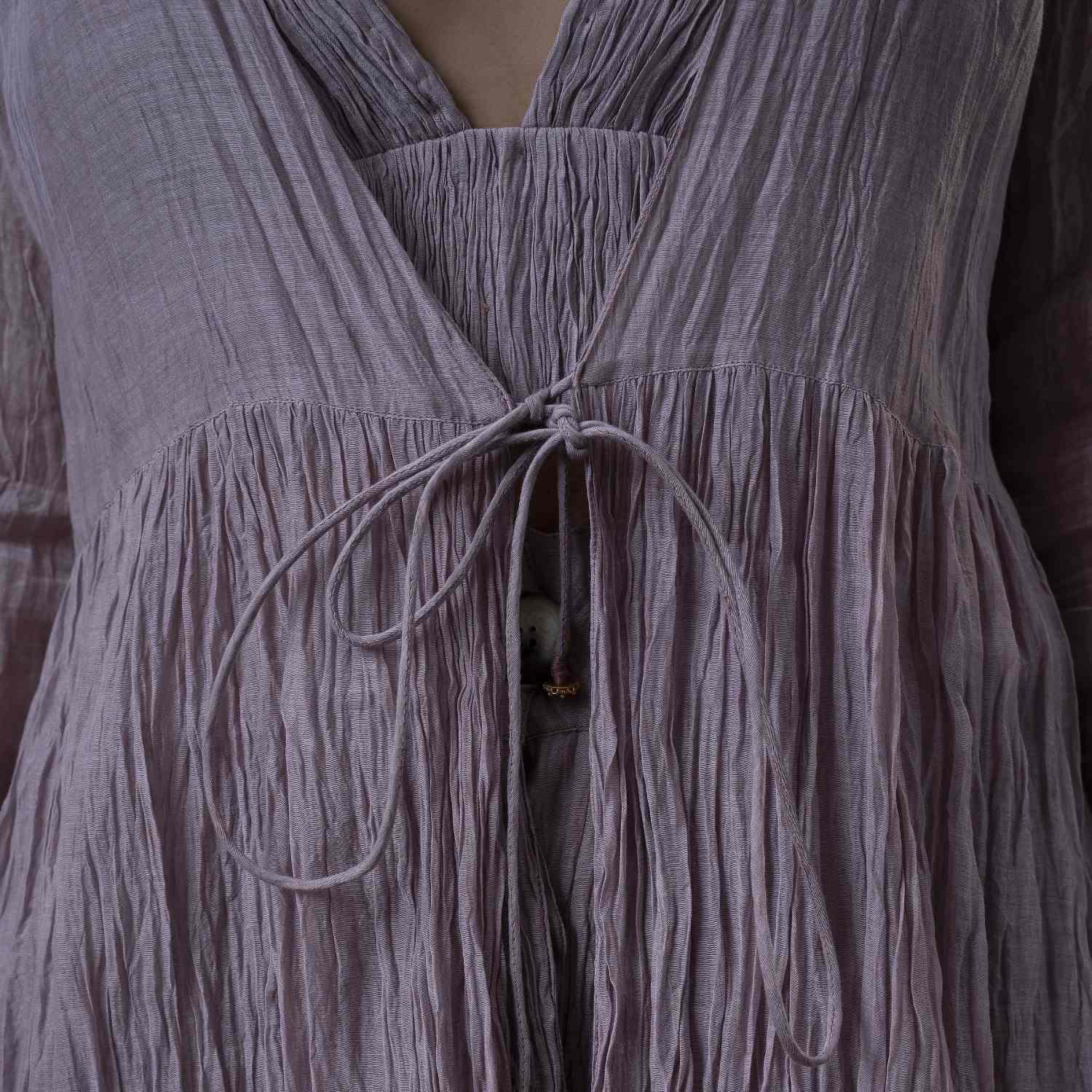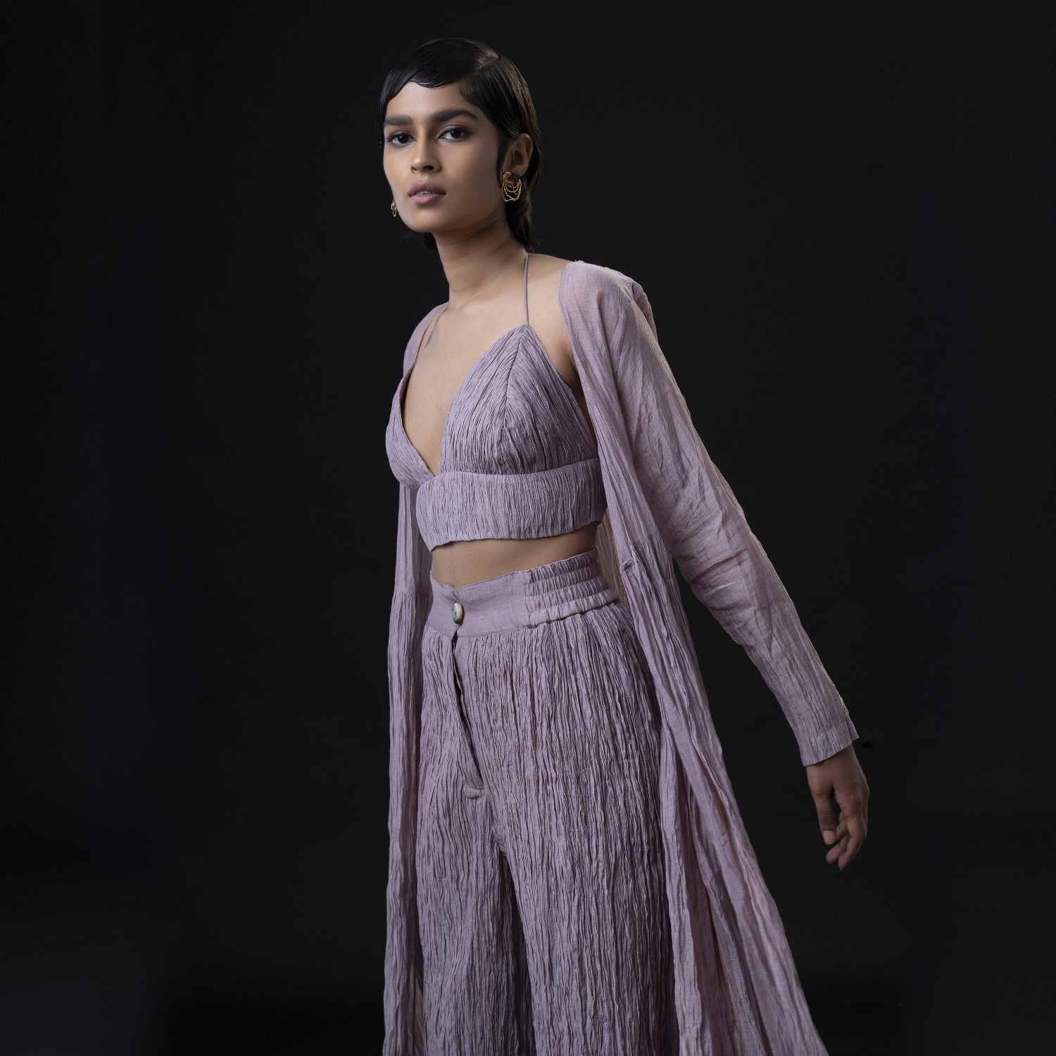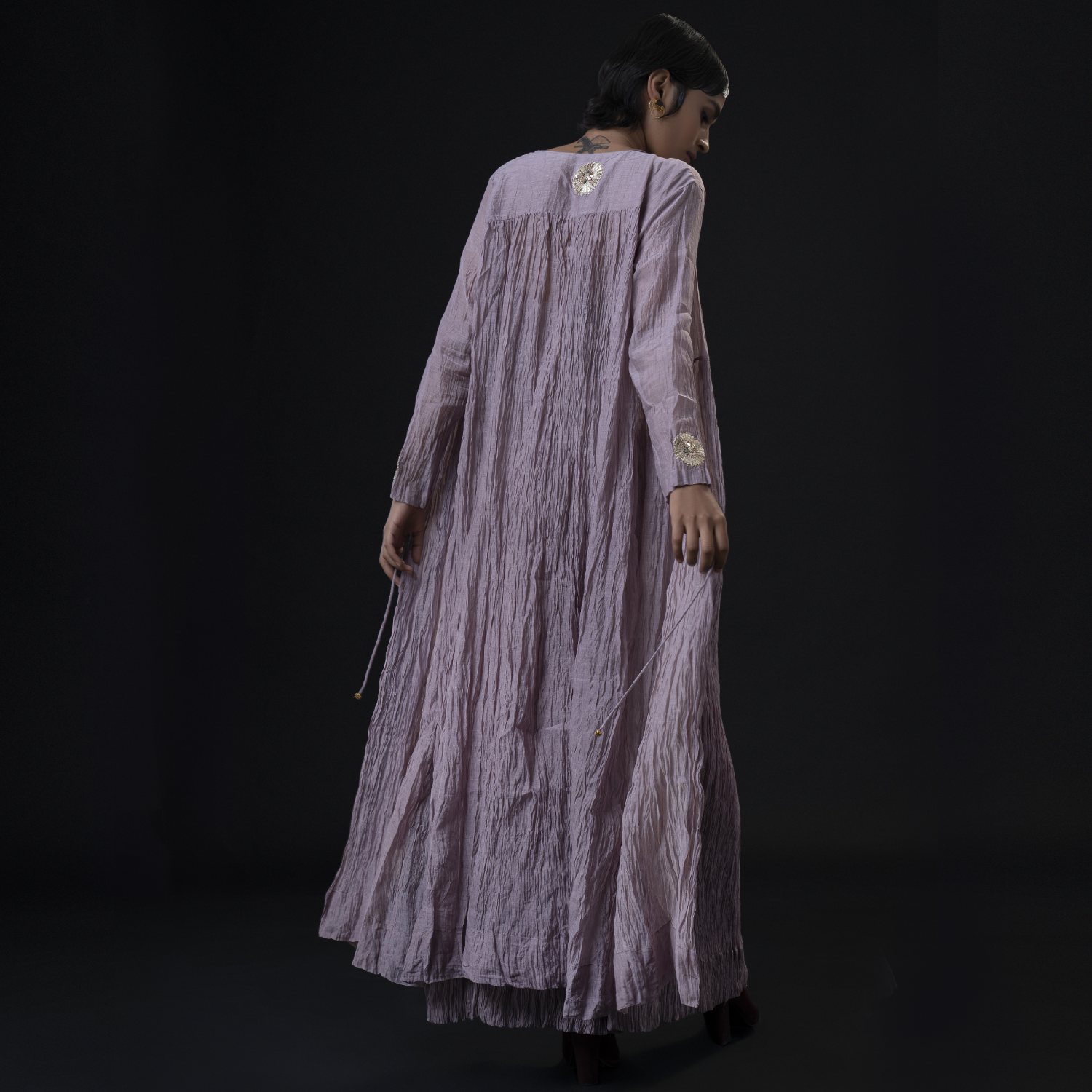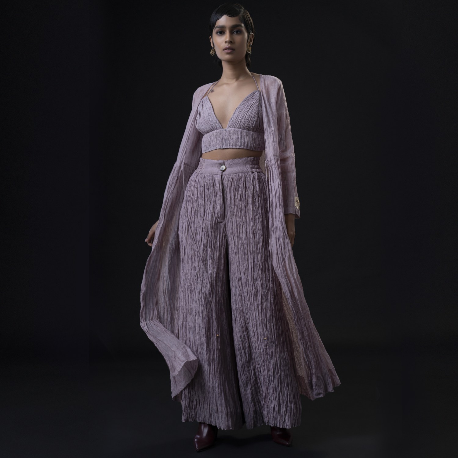 ₹ 15,275 (10% off)This set is a masterpiece, featuring an ankle-length jacket that gracefully flows in an A-line silhouette. The gathers below the waist create a unique texture that adds depth to the ensemble. The jacket is adorned with delicate flower motifs on the sleeves and the center back yoke, adding femininity. This set comes with a bralette top and a high waist palazzo, enhancing the outfit?? modern appeal.