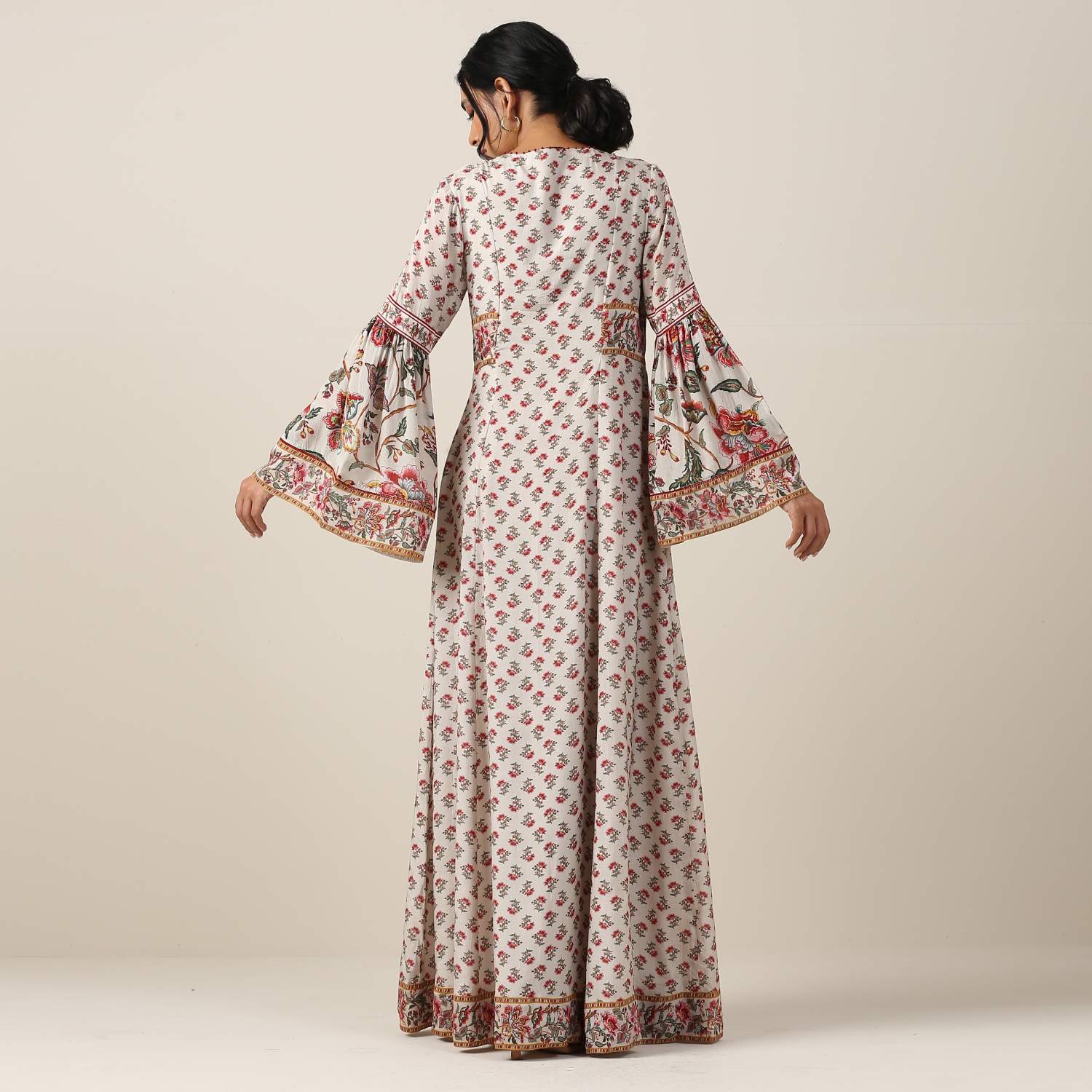 This beautiful off-white dress has been skillfully crafted from silk fabrics and features booti and jaal print with ghera on dress, it effortlessly combines opulence and style, ensuring you make a glamorous statement.