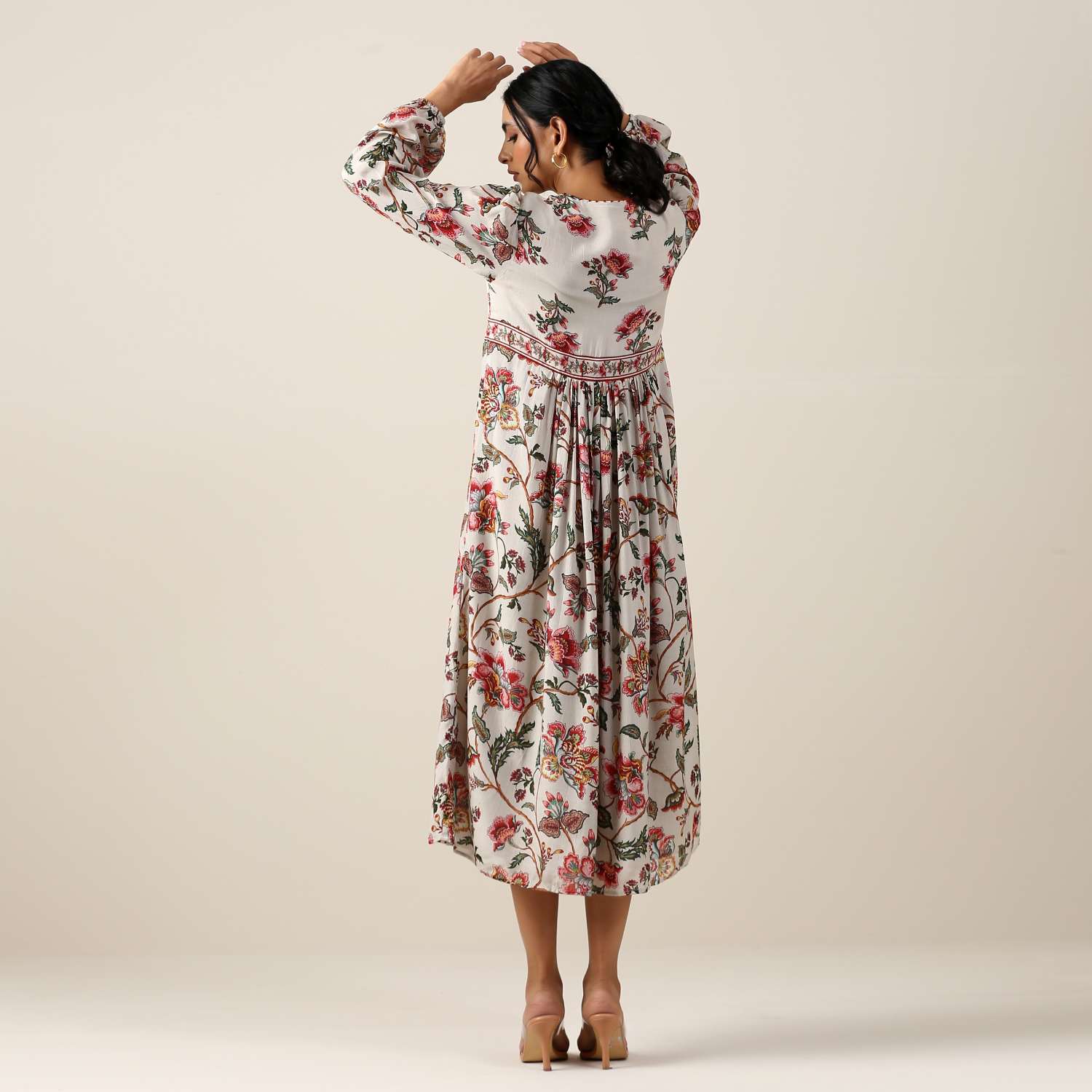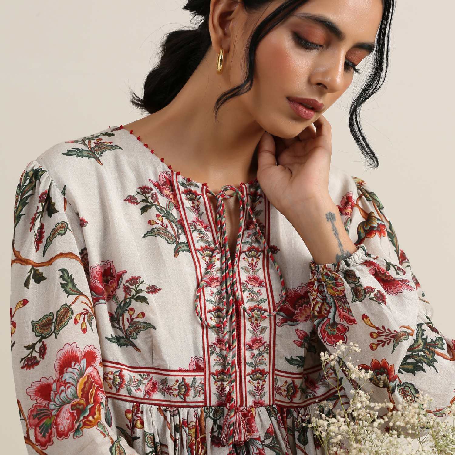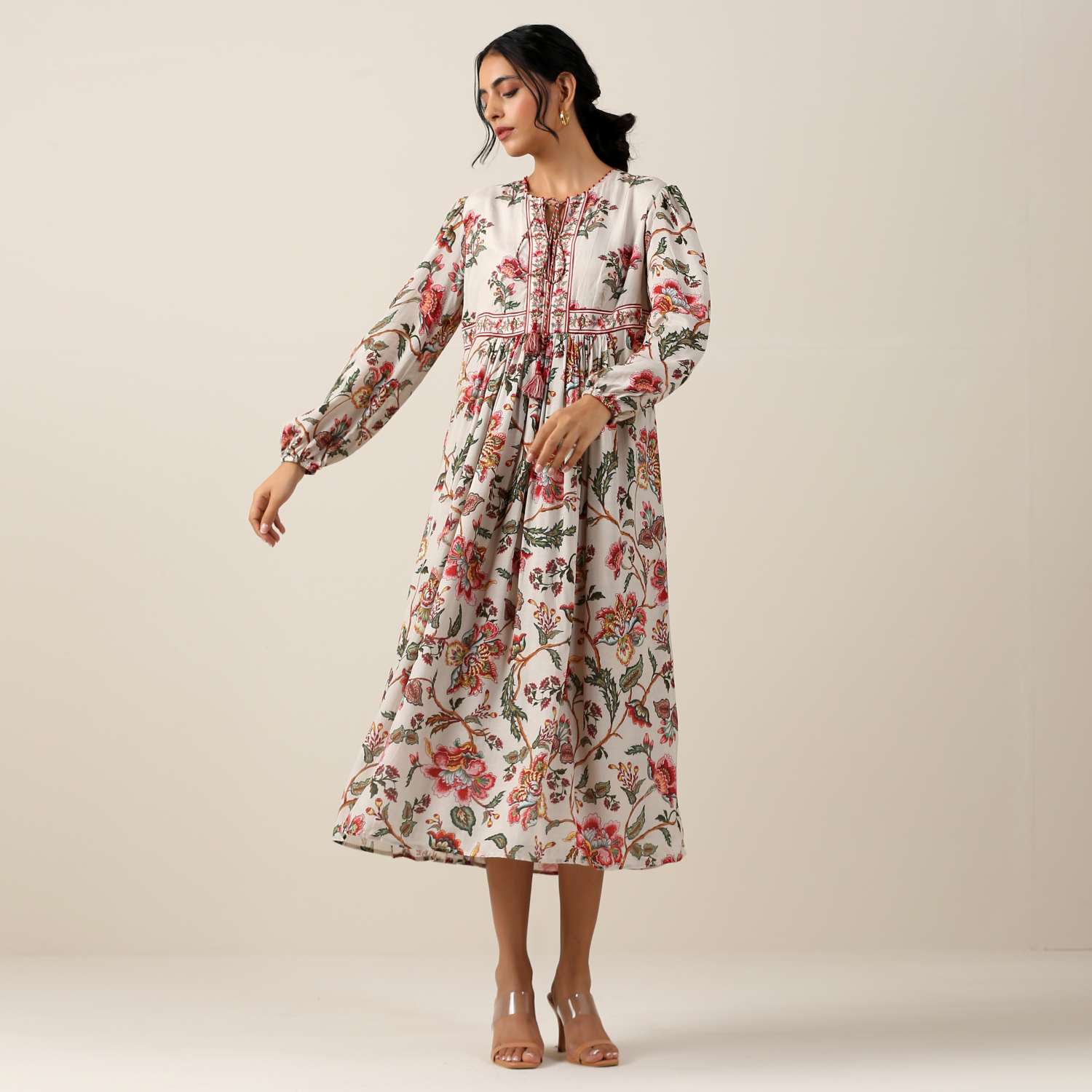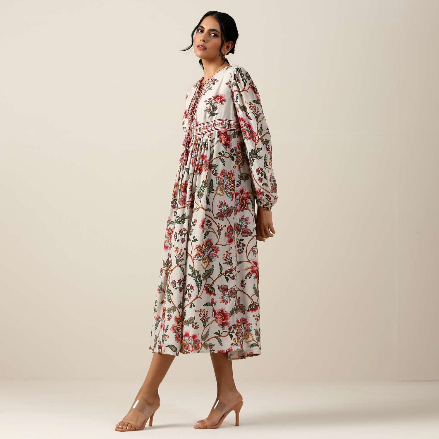 ₹ 11,399 (25% off)Crafted from soft and lightweight off-white silk fabric, this dress features a floral print. It has a full length sleeves and a beautiful print on the front for added elegance. Style it with a dainty necklace and heels for a dressy evening soiree.