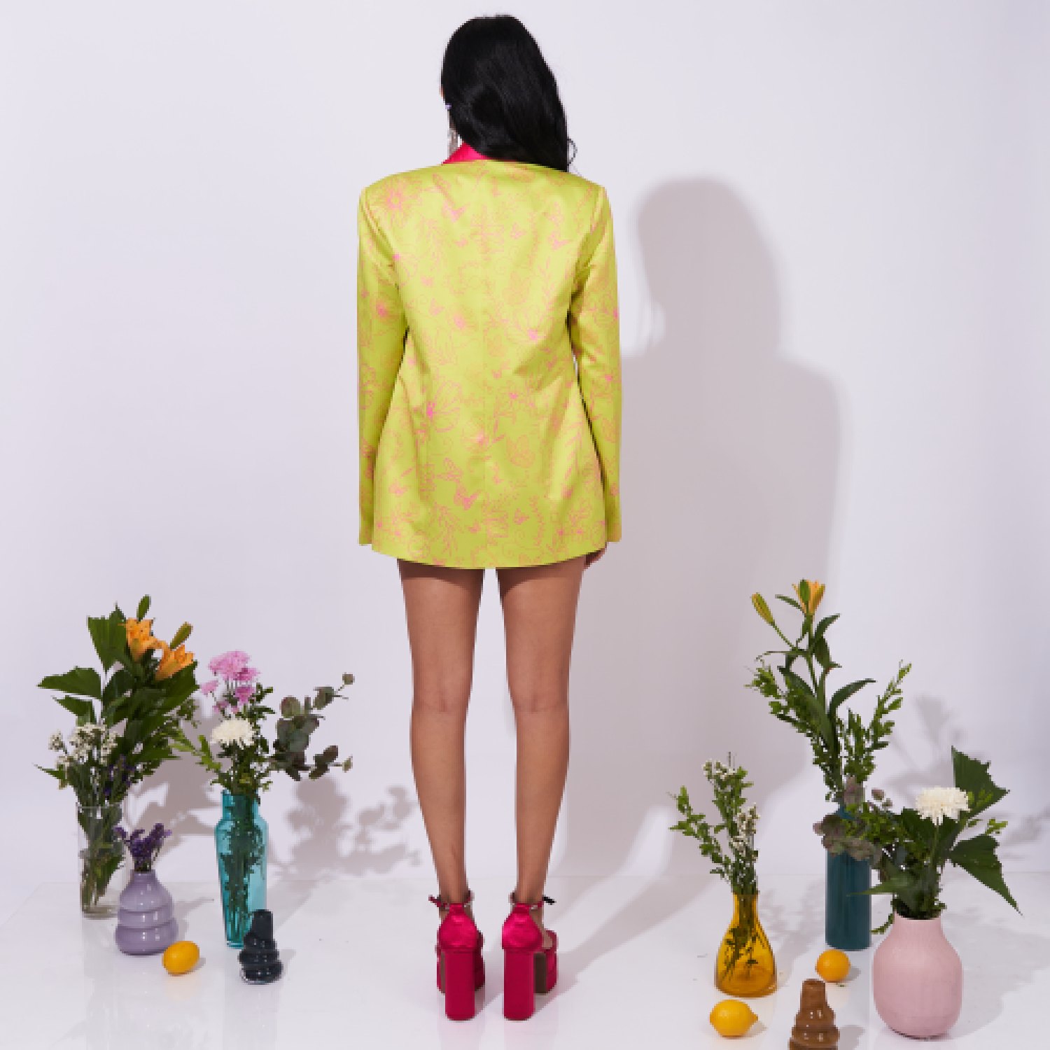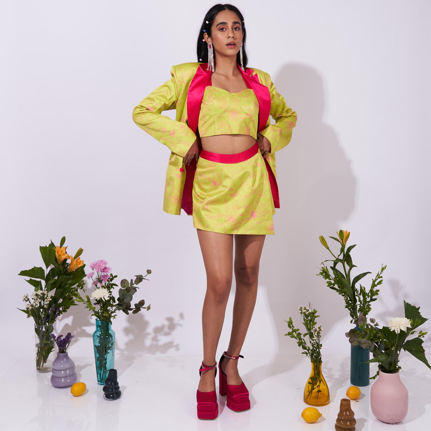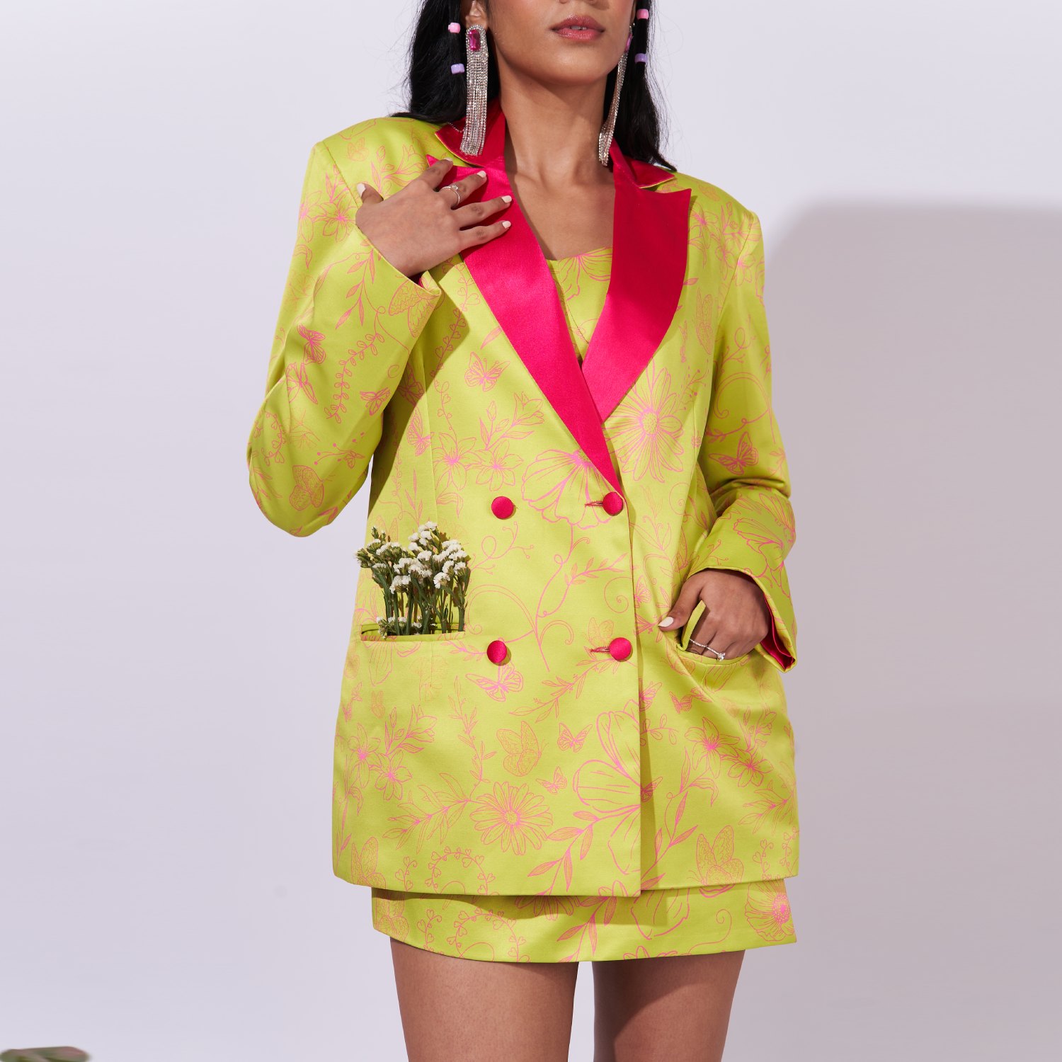This double breasted blazer is a key component of a coordinating set and boasts shoulder pads for structure. The front button closure enhances its sophisticated appeal, while welt pockets add functionality. The blazer's distinct feature lies in its digitally printed design, which merges contemporary style with timeless elegance for a versatile and modern fashion statement.
