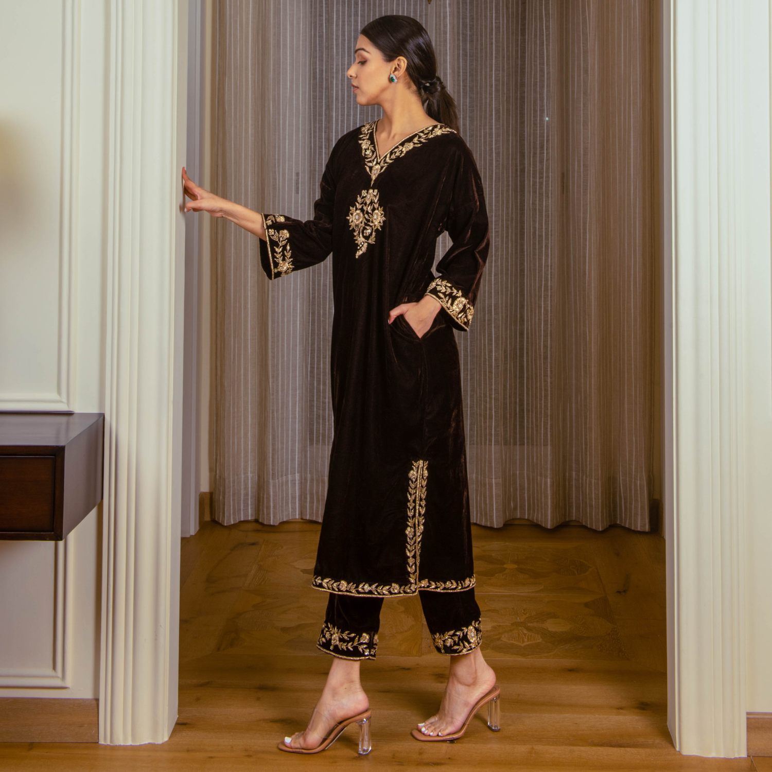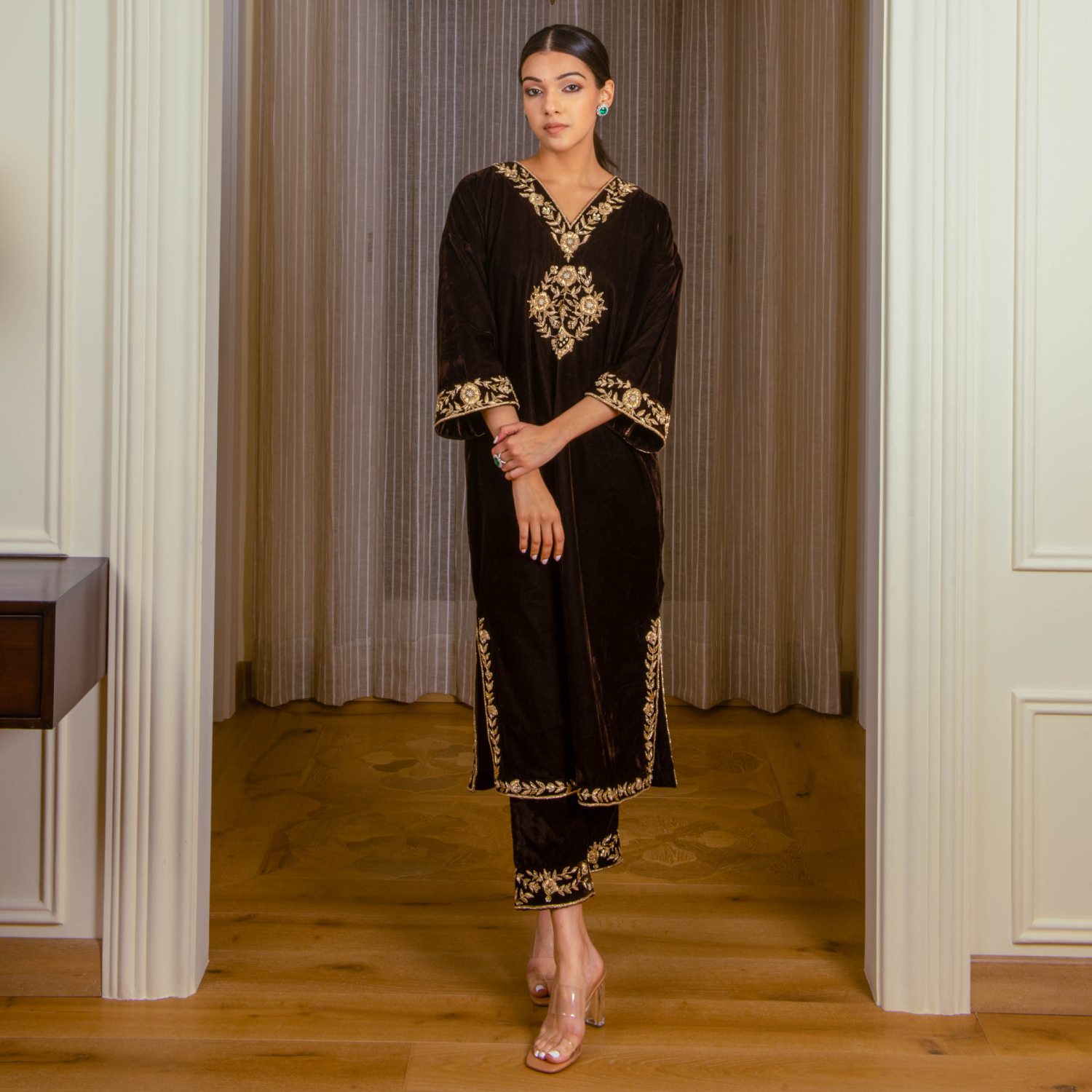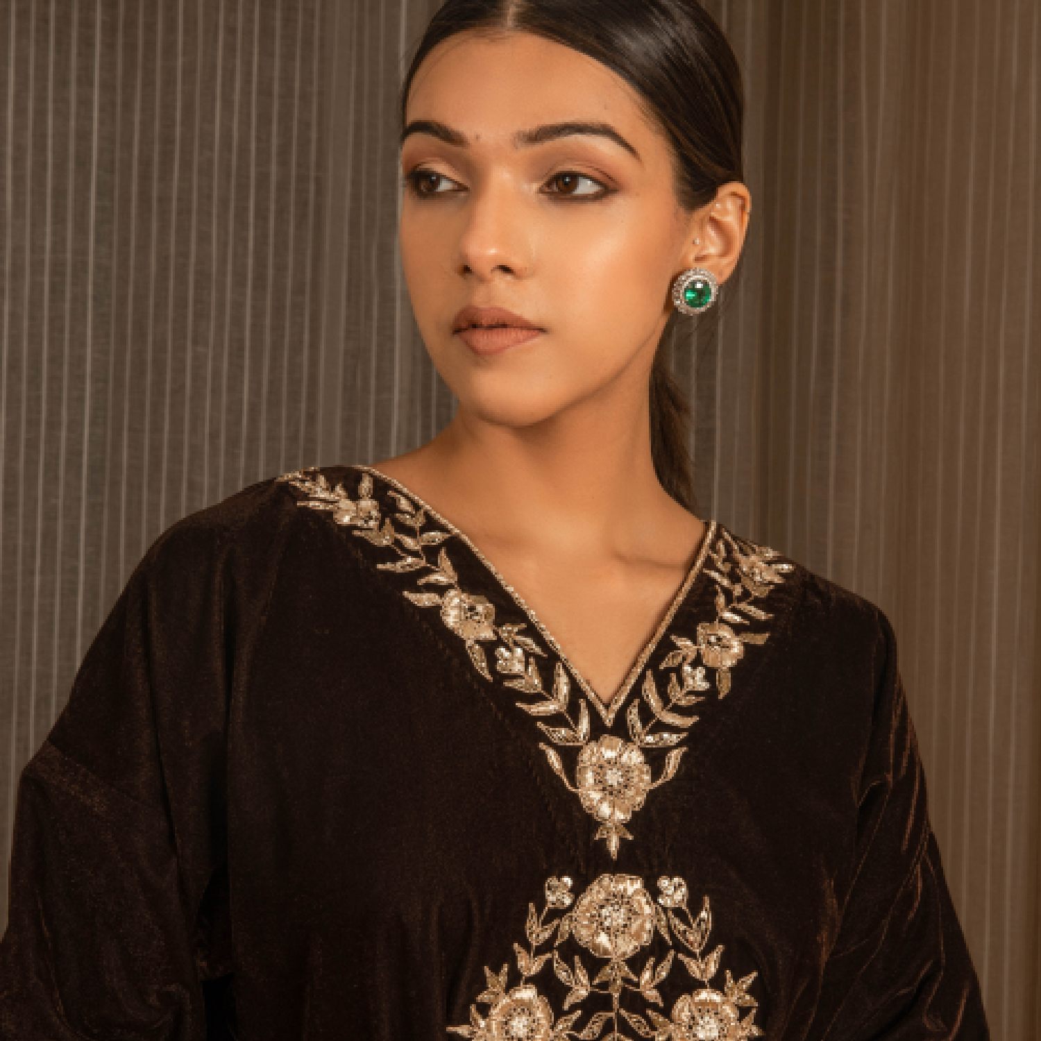 ₹ 34,000 (5% off)This kaftan-style tunic, in rich coffee brown, features detailed embroidery at the neck, sleeves, and hem. The back is accentuated with an embroidered motif, showcasing exquisite cut dana and dori work using the zardozi technique. Paired with straight-fit mid-waist pants, complete with an elasticated waist, inseam pockets, and hand-embroidered hems, this set combines style and comfort for a festive celebration.
