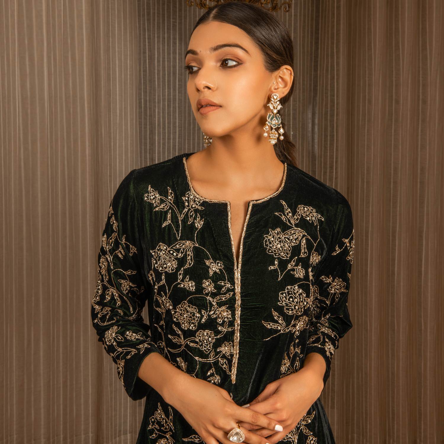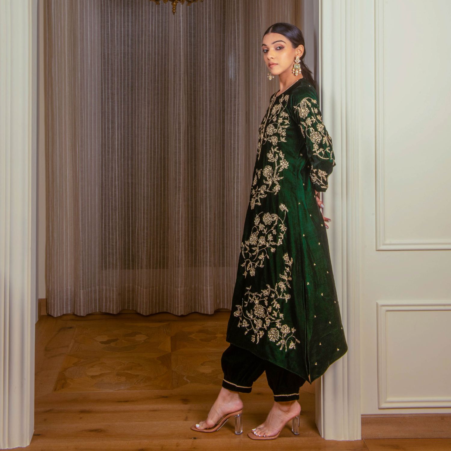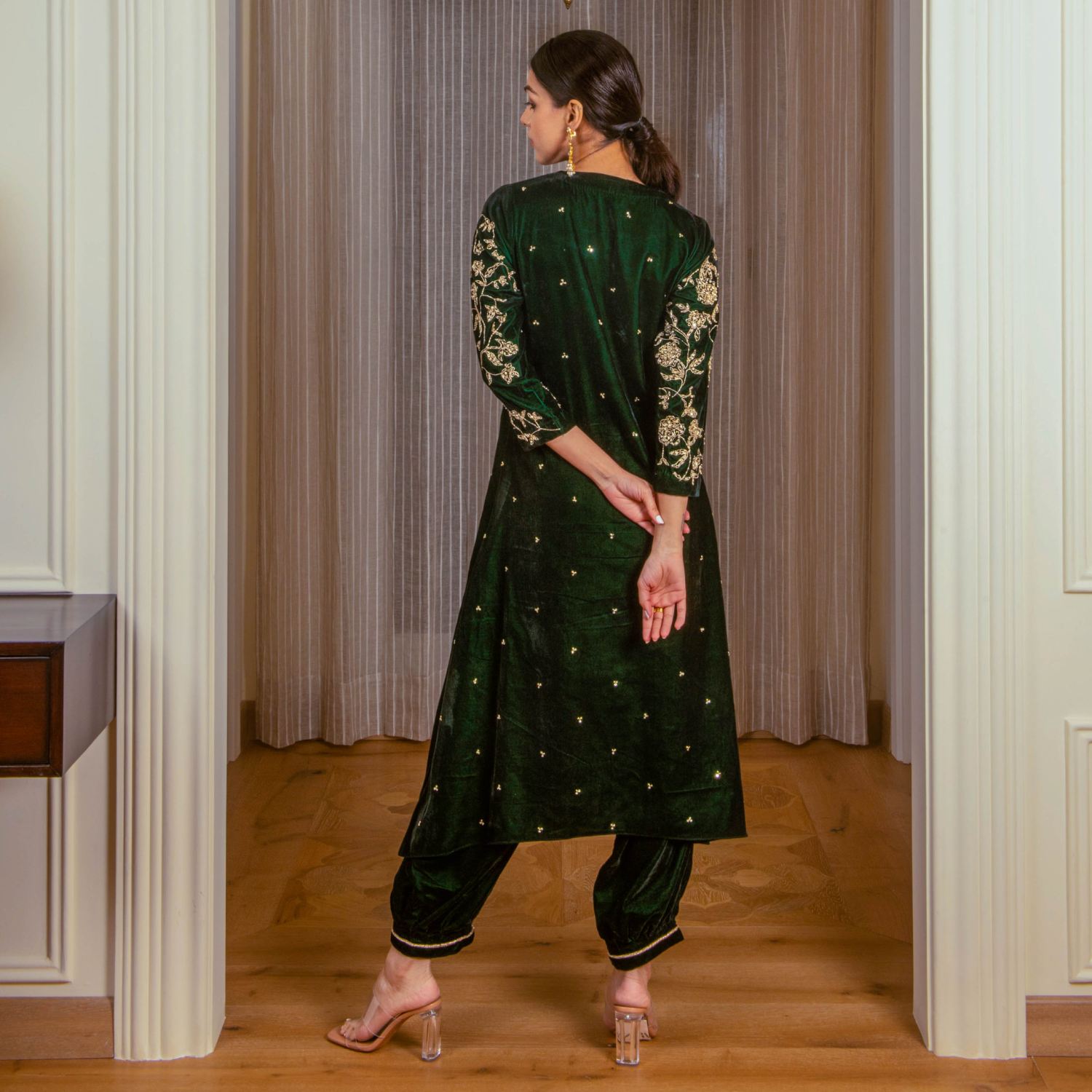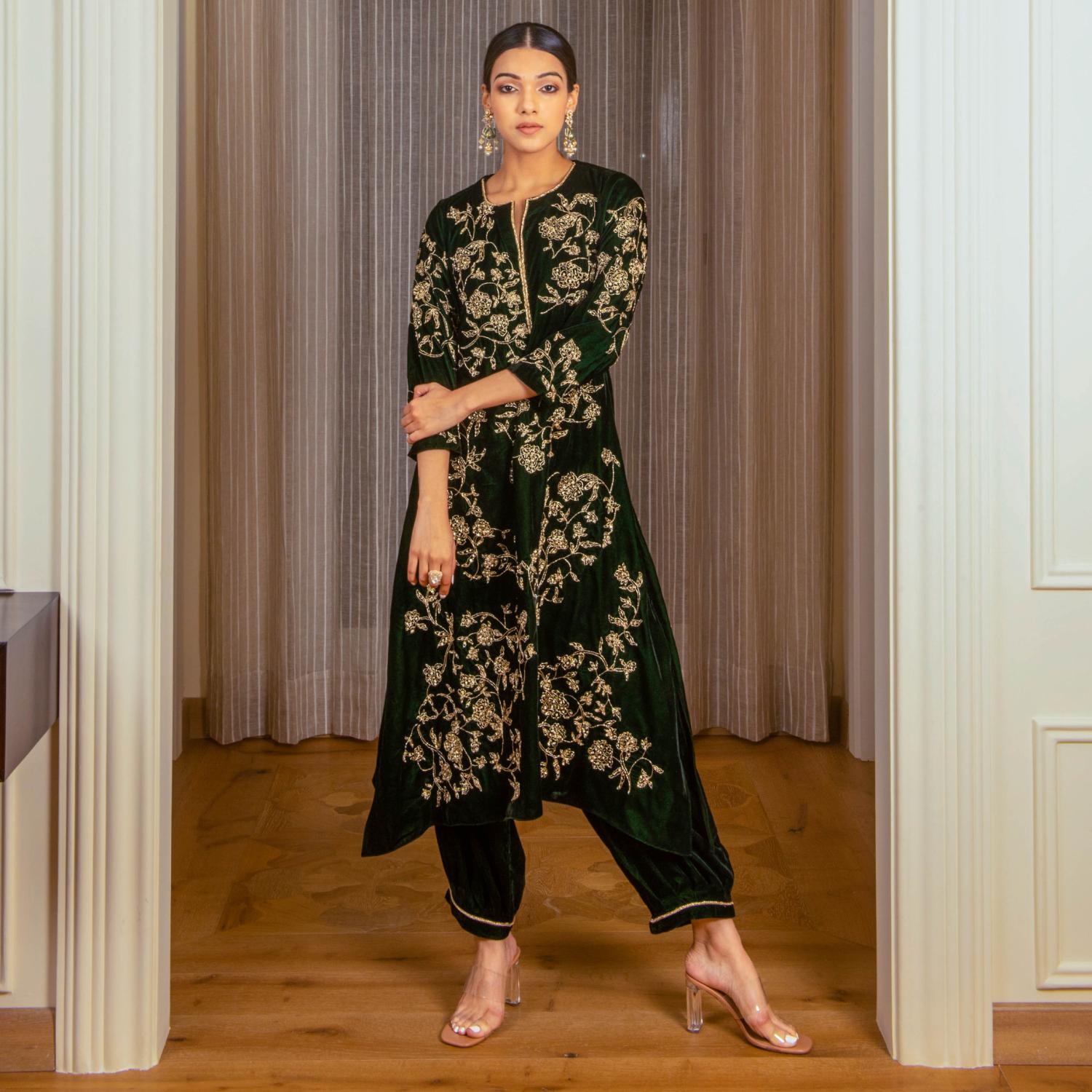 ₹ 22,900 (5% off)The front of the kurta is adorned with intricate dabka, sequin, and pearl work using the aari work technique, with zardozi highlighting for added elegance. The back features subtle hand embroidery, creating a balanced and exquisite design. Paired with elasticated pants, detailed at the hem, this bottle green silk velvet set combines sophistication with comfort. Style it with statement earrings and heels for a dressy event.