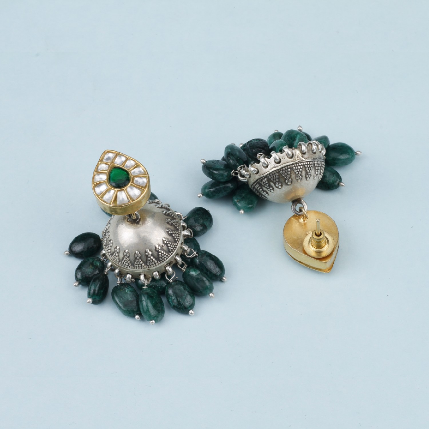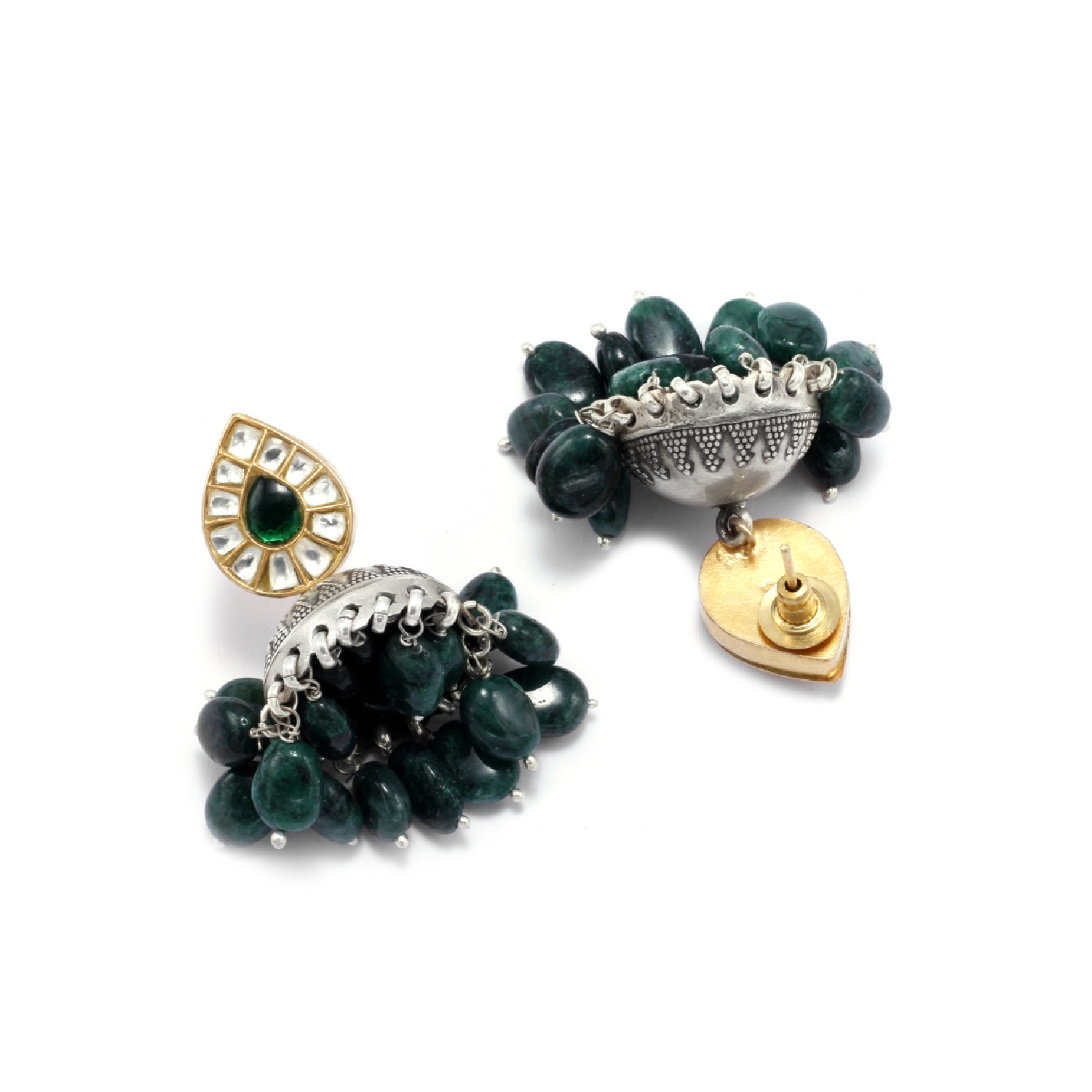 These jhumka earrings effortlessly blend tradition and modernity. These exquisite jhumka earrings are crafted from silver and adorned with faux emerald and kundan embellishments. Pair these gorgeous jhumkas with kurtas or sarees for dressy events.