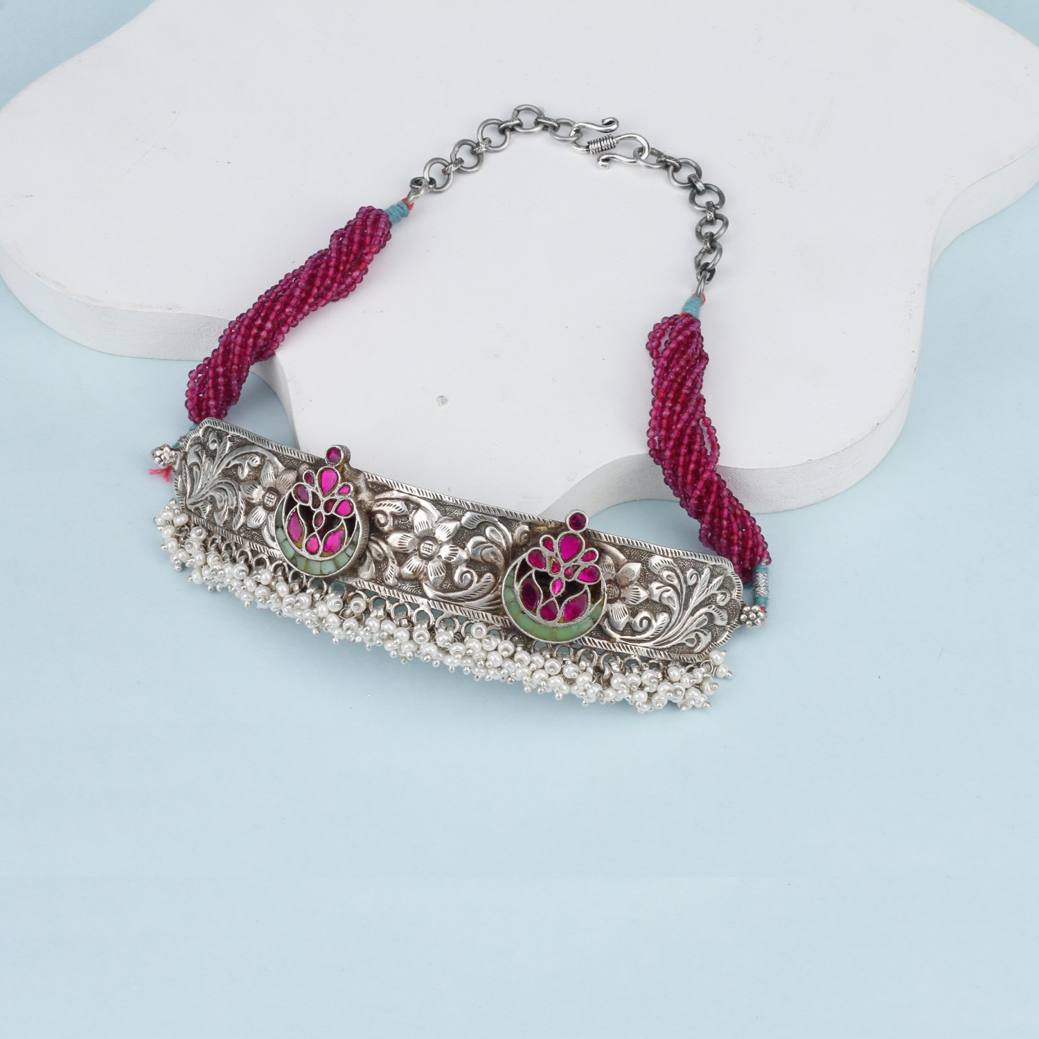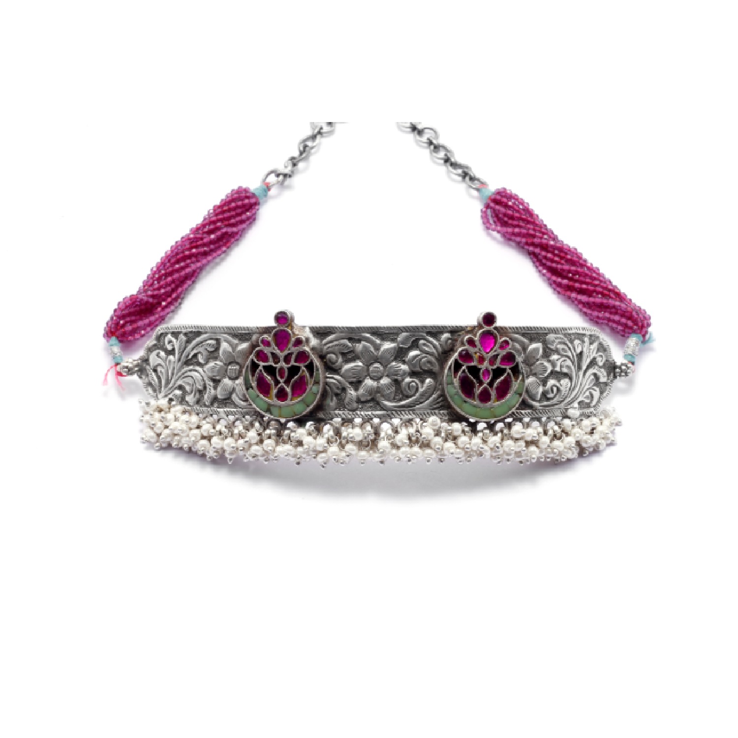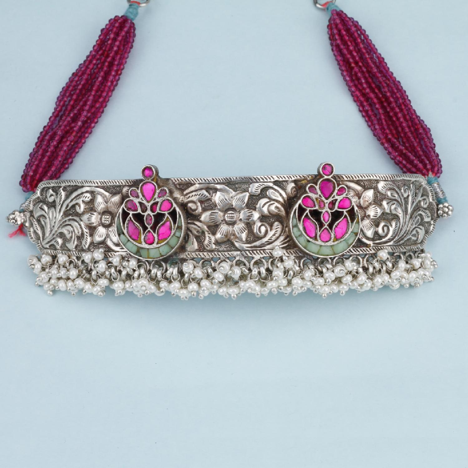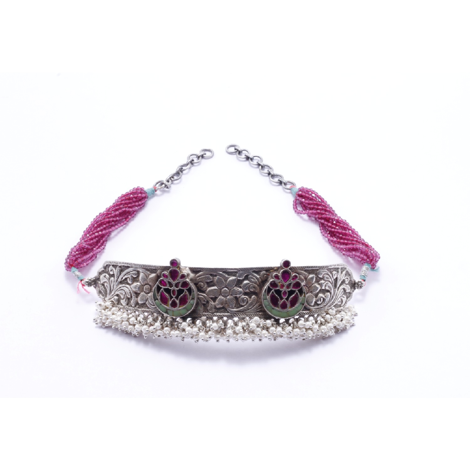This gorgeous silver choker is adorned with a combination of pink and green hues. It features intricate kundan work on a silver base with a pink adjustable thread. Let the choker shine as the centerpiece by wearing it with a simple white dress or a monochromatic outfit.