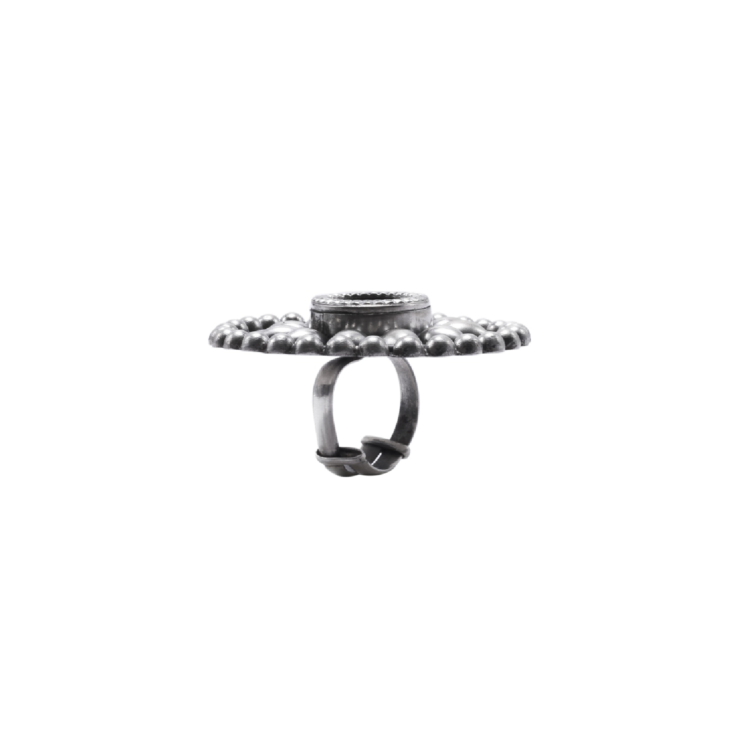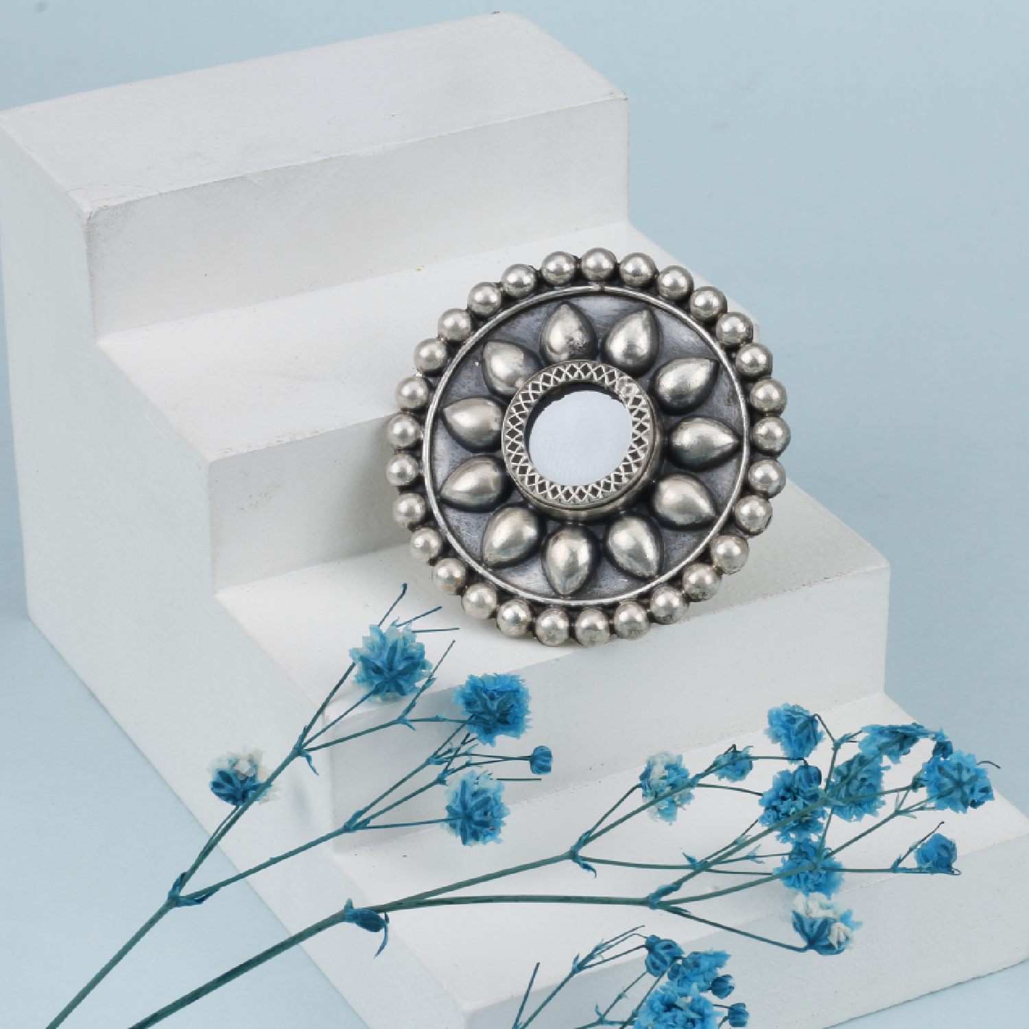 Crafted from high-quality silver, this ring features an intricate mirror design at the center. Its adjustable design ensures a comfortable fit for any finger, making it a versatile accessory to add a dash of glam to any look. Embrace a boho-inspired style by pairing this mirror work ring with flowy maxi dresses.