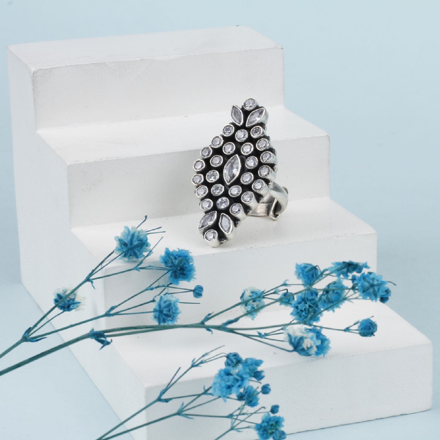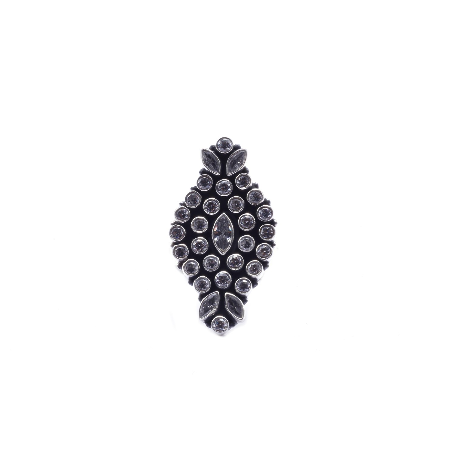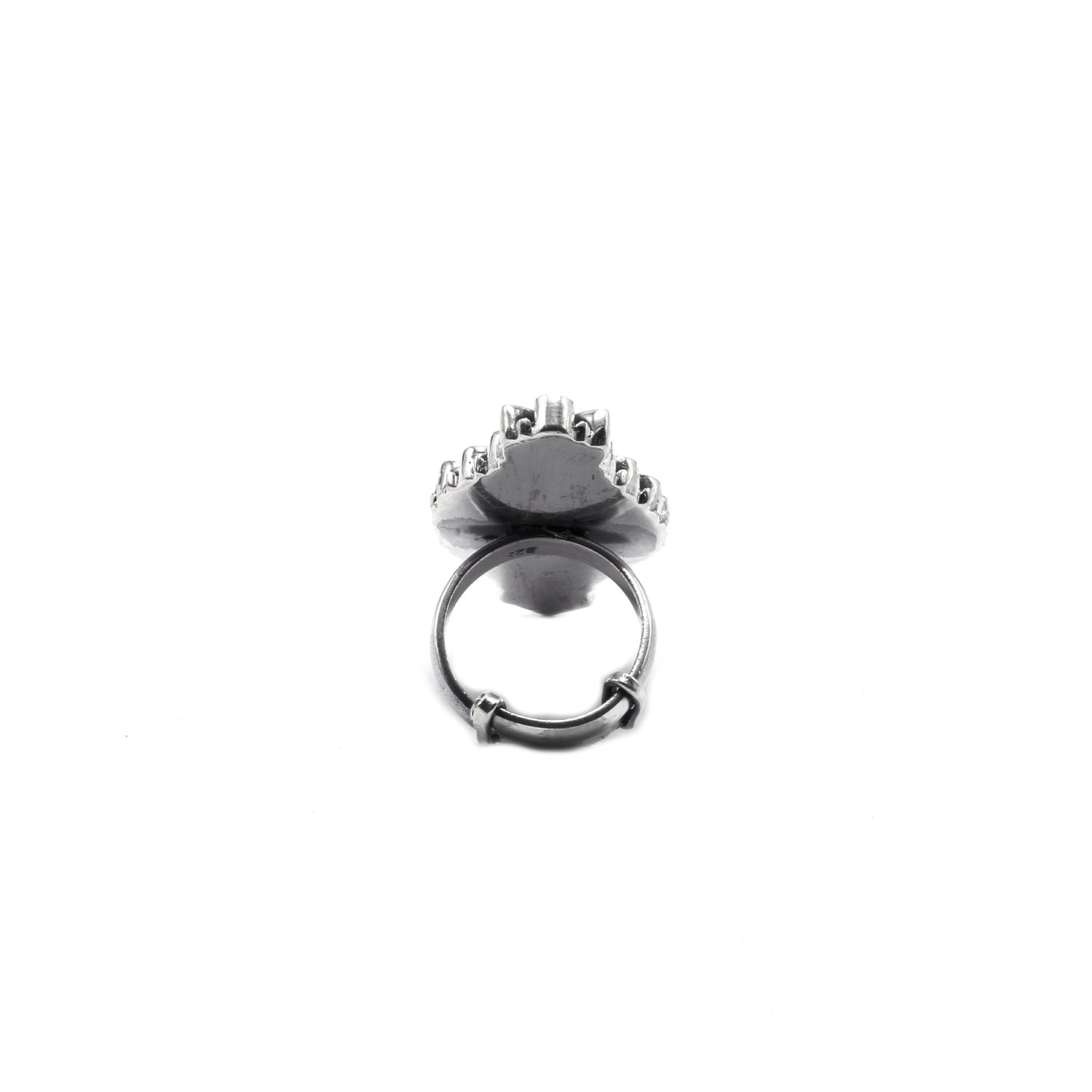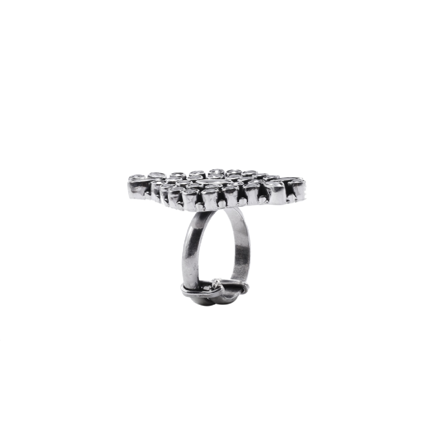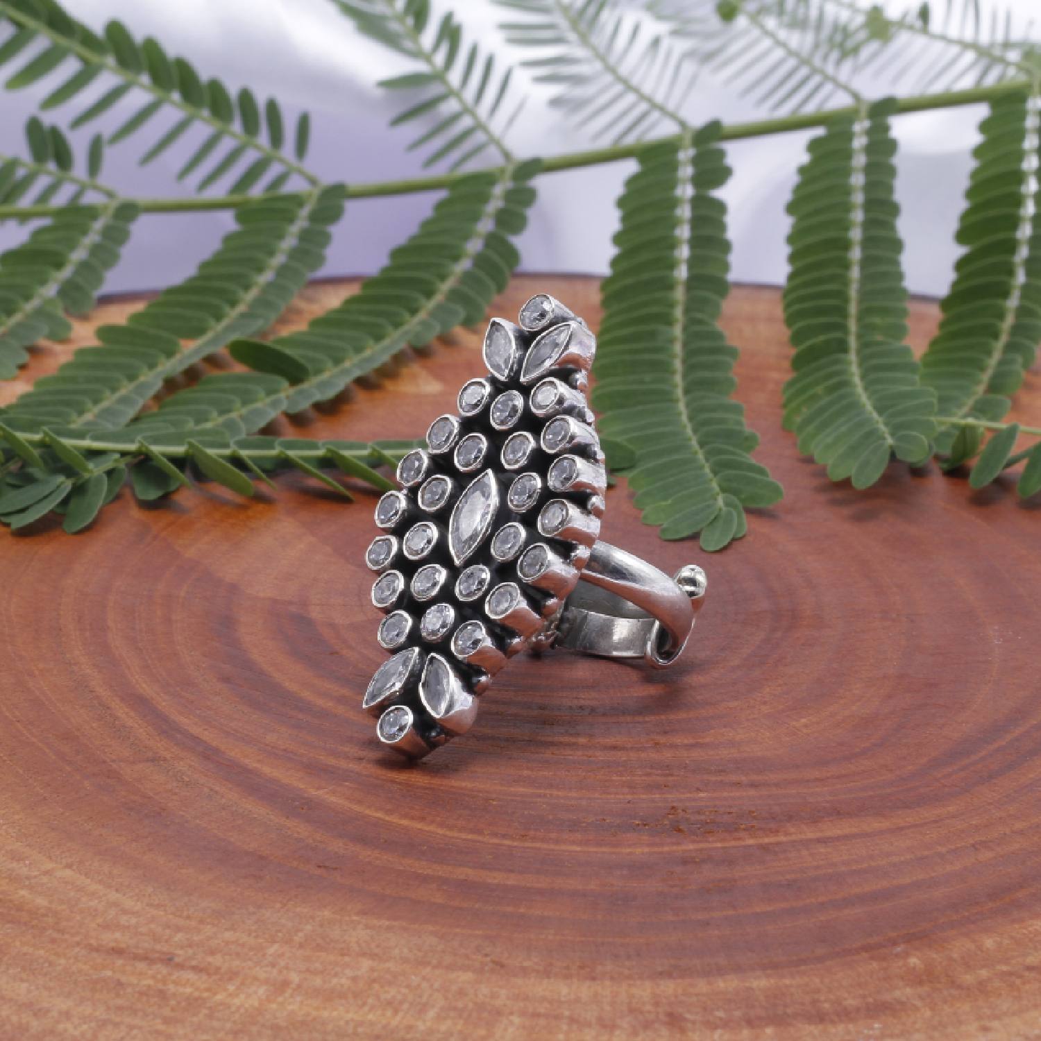 Crafted from silver and adorned with intricate kundan embellishments, this beautiful ring exudes grace. With its intricate detailing and understated allure, this ring symbolises refined taste. This ring is adjustable, which makes it convenient and easy to wear.
