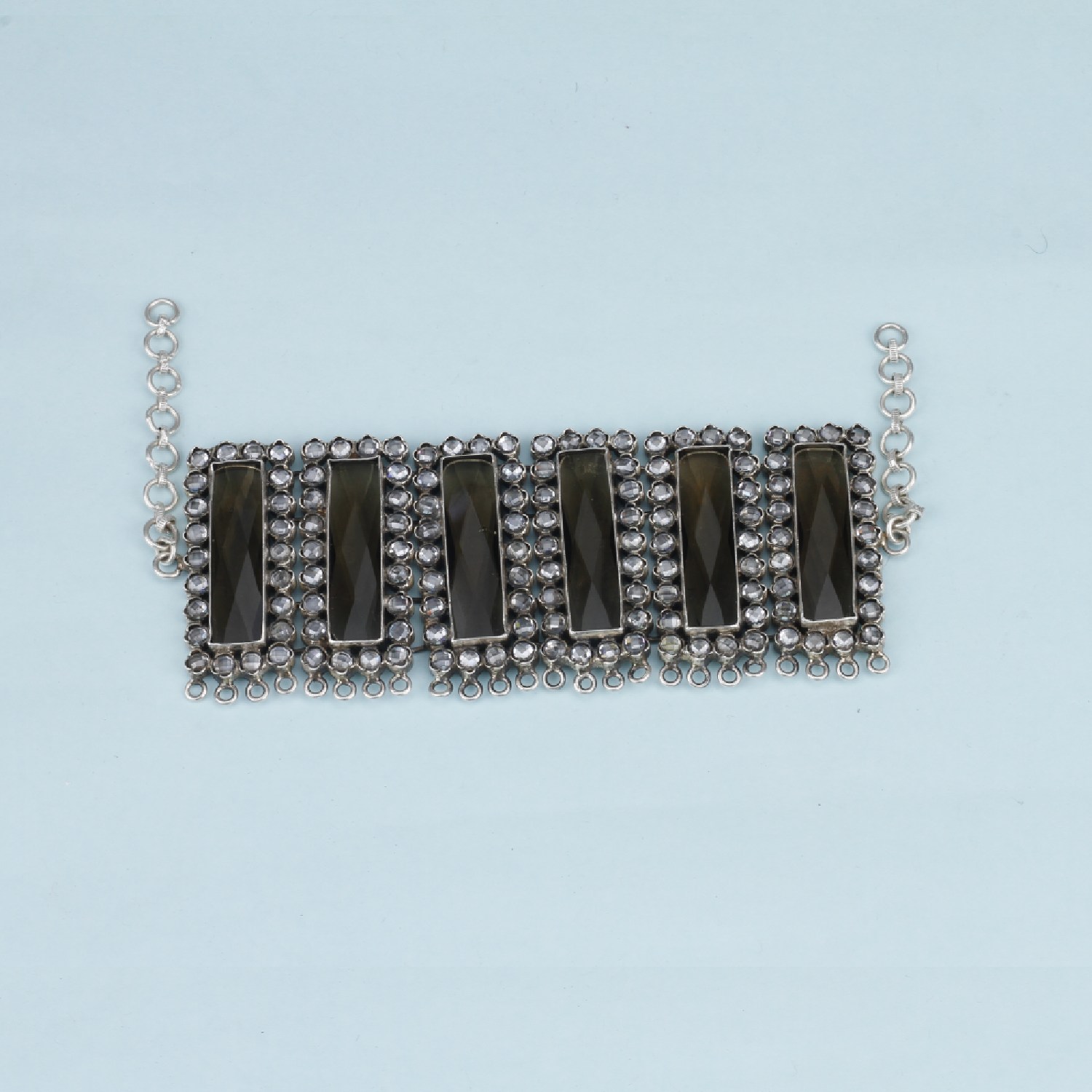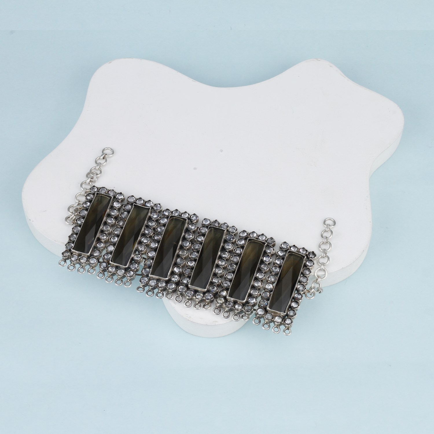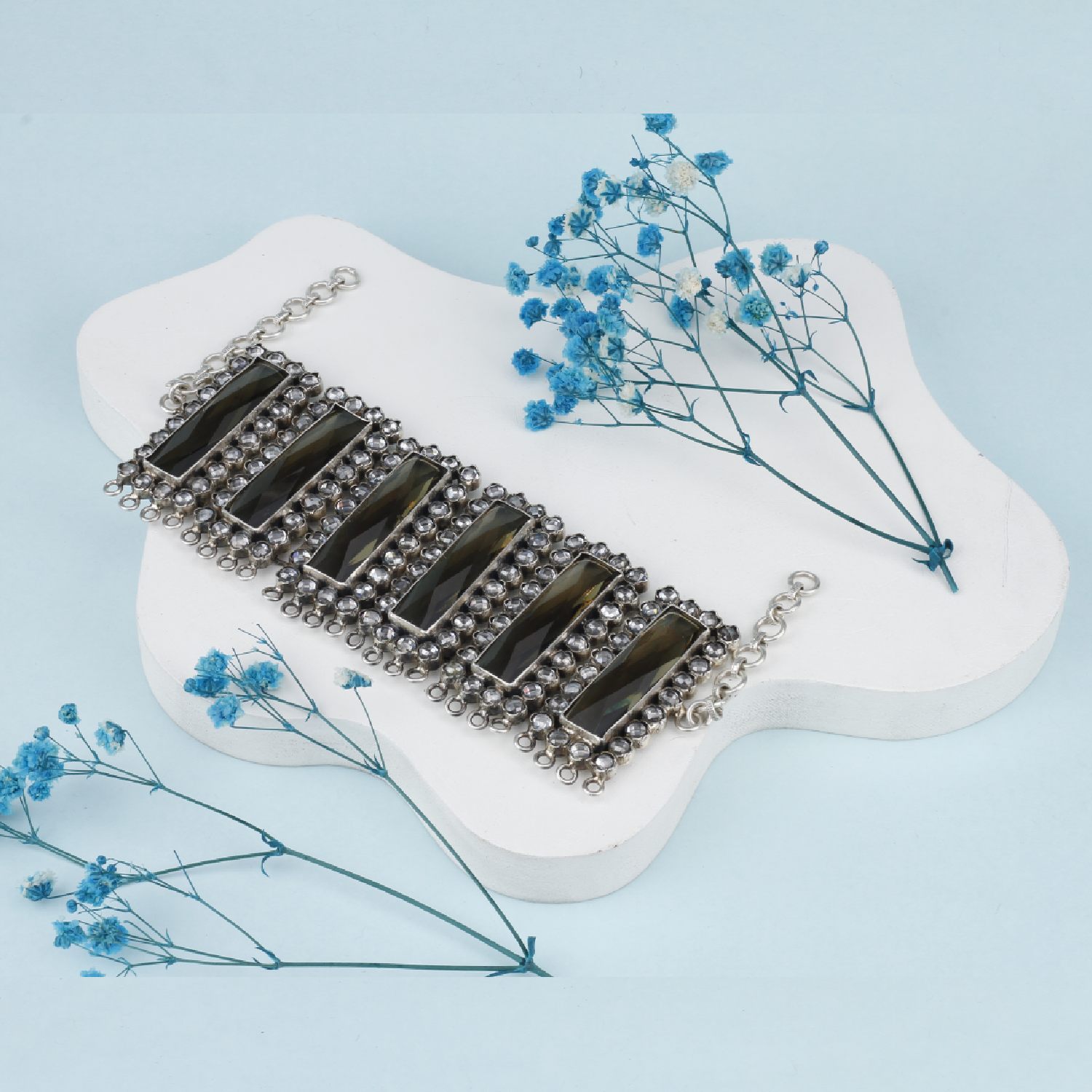This necklace is a celebration of traditional beauty. Crafted from gleaming silver and adorned with mesmerizing labradorite stones, this necklace exudes an allure that's perfect for festive occasions. Style this statement piece with a lehenga or saree for a dressy event.