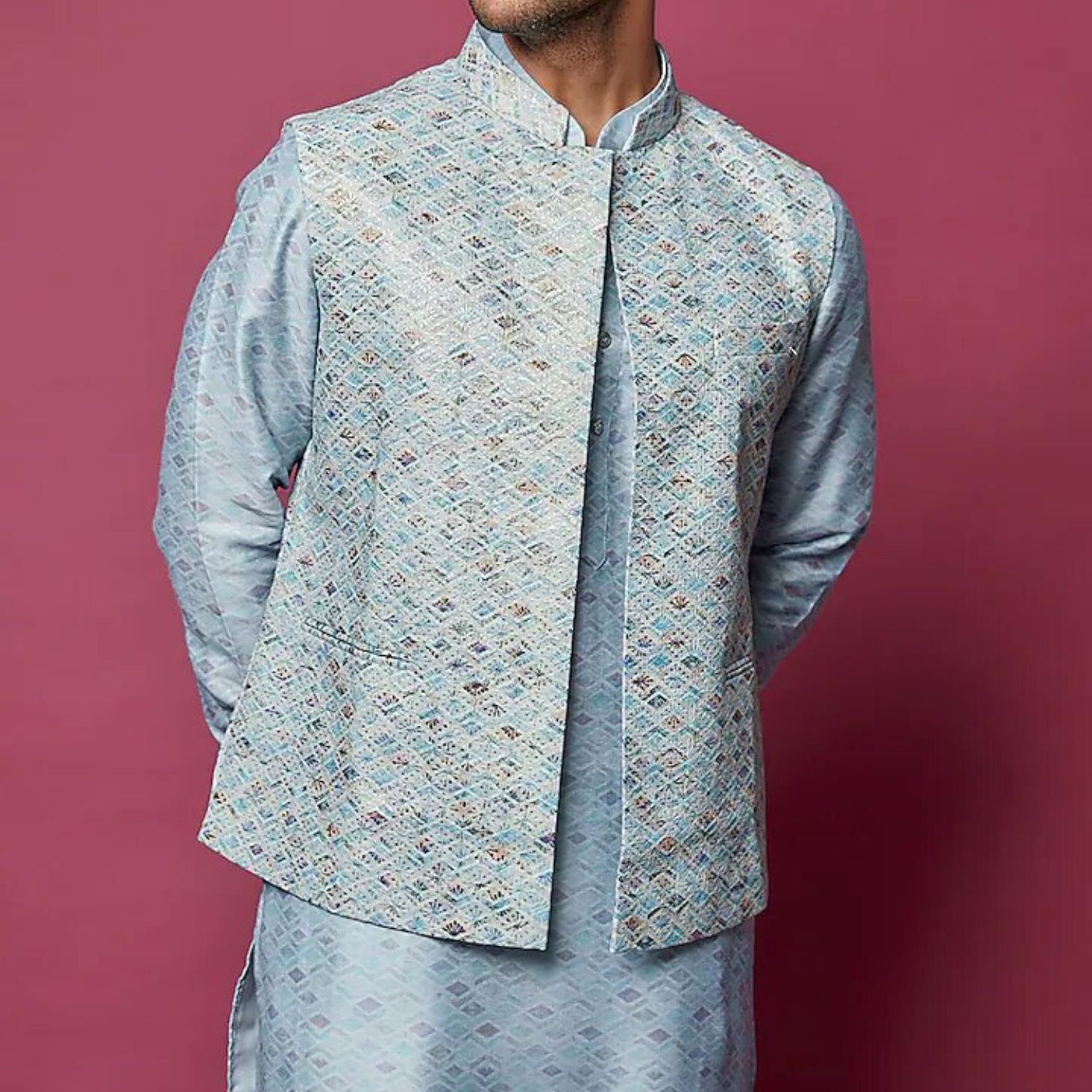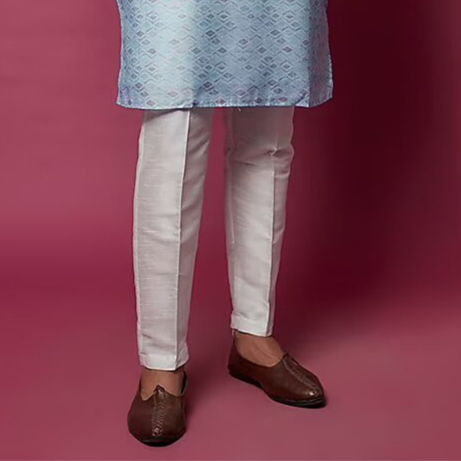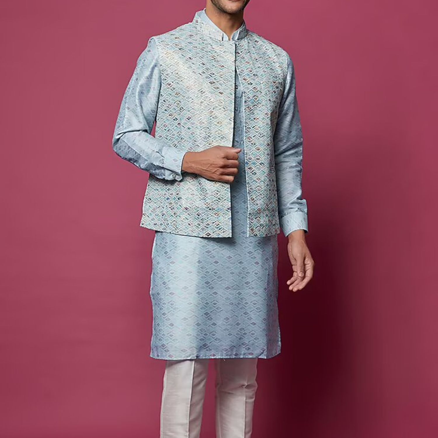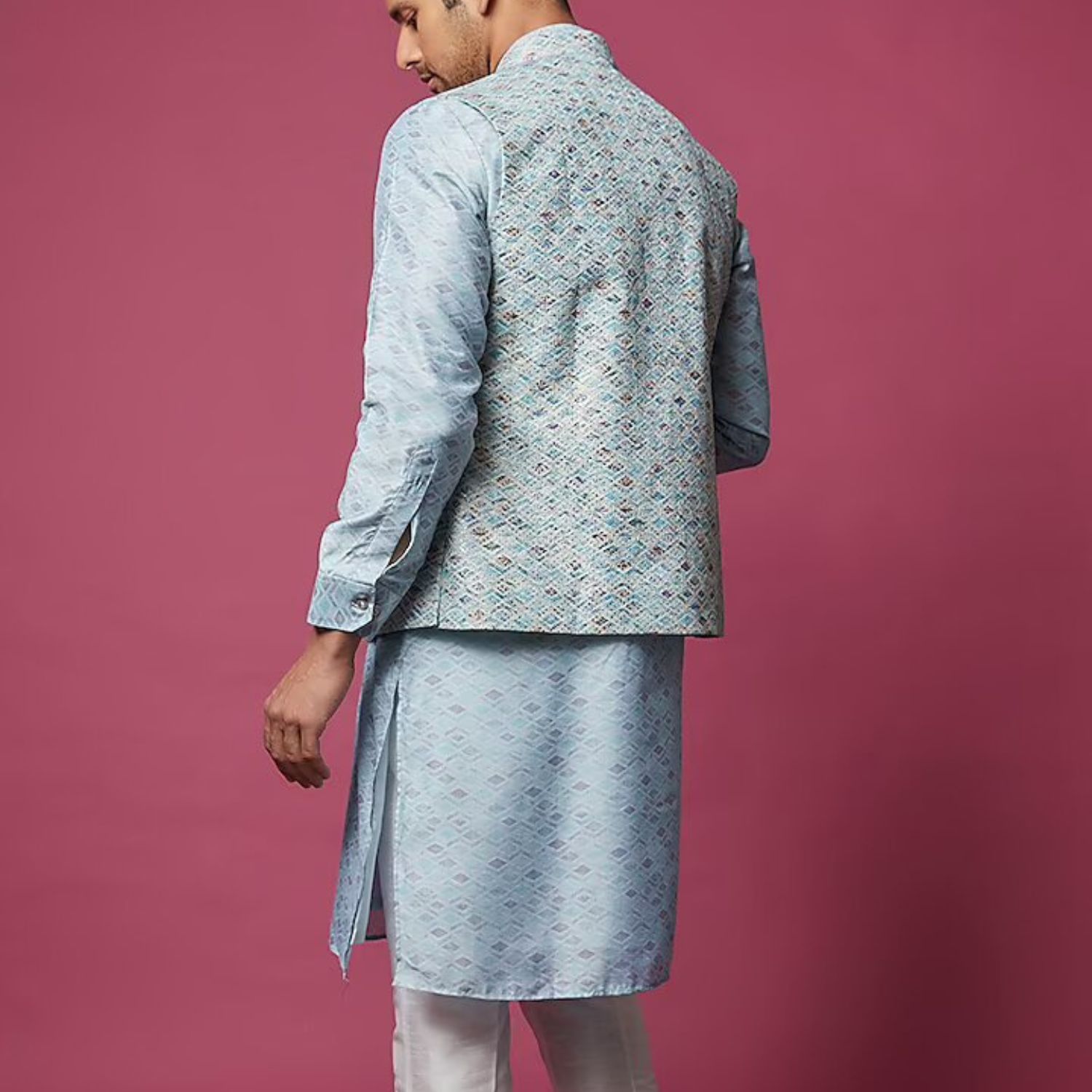 ₹ 17,500 (15% off)This open jacket is crafted from raw silk and features a beautiful print paired with a kurta made from cotton silk, which lends it a light and comfortable feel. It comes with an off-white dupion silk mexican pant for a polished look.