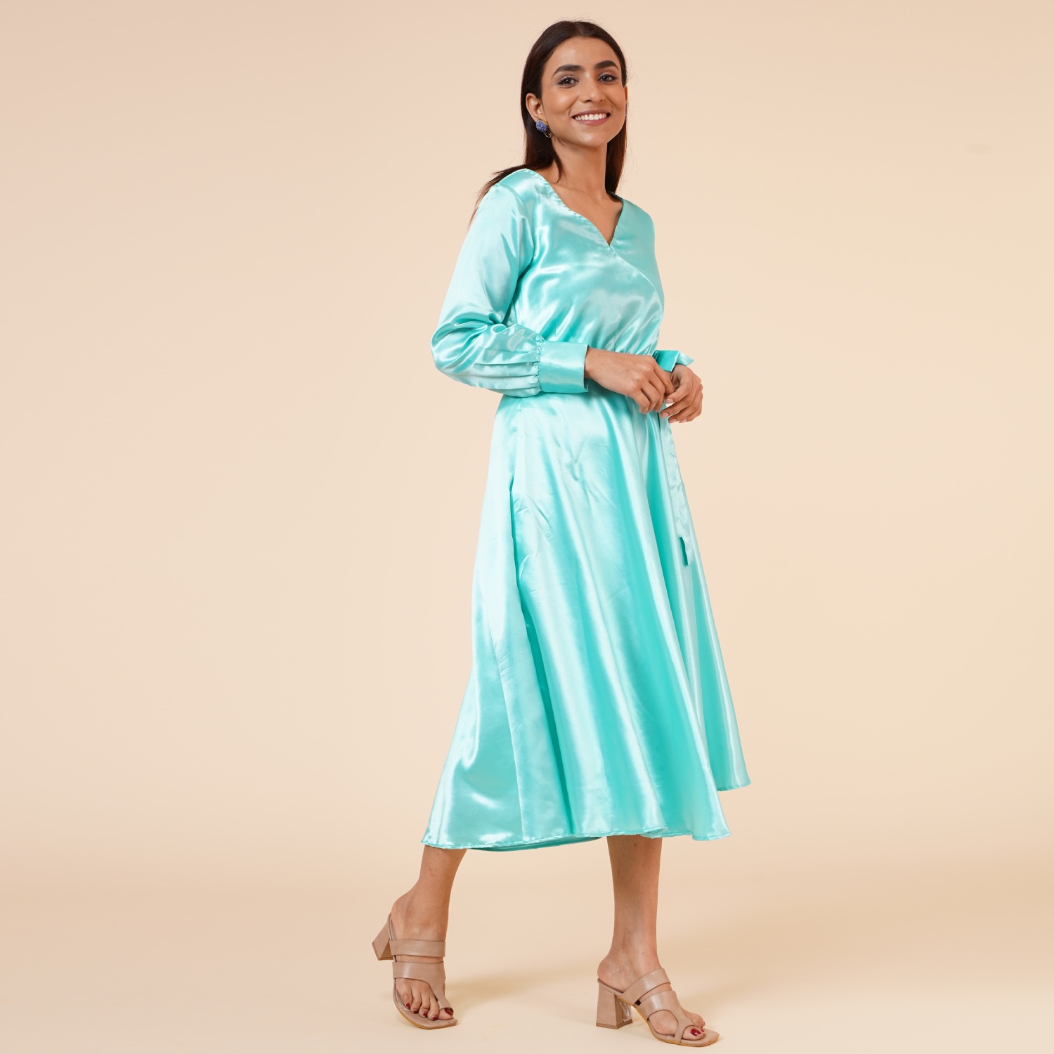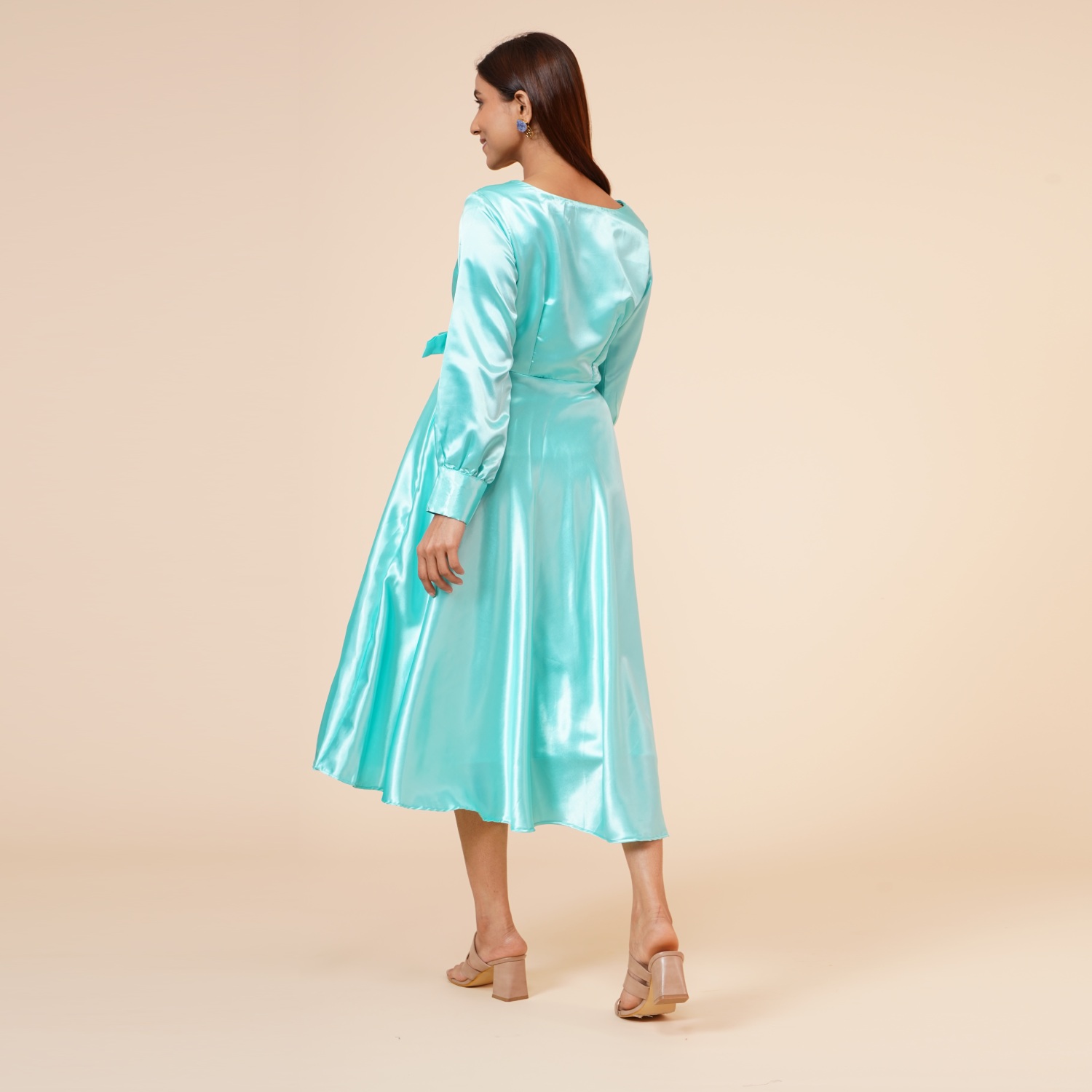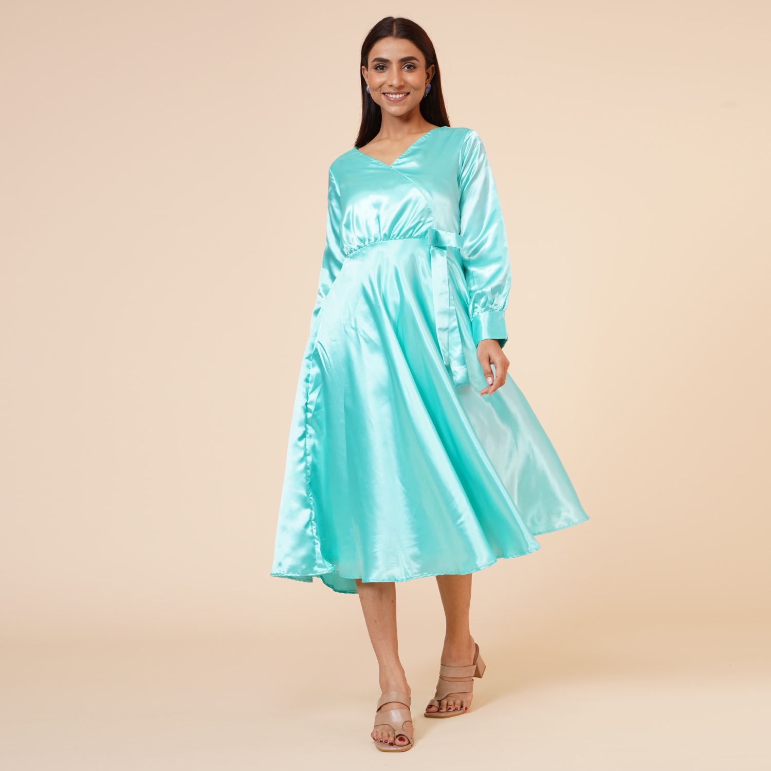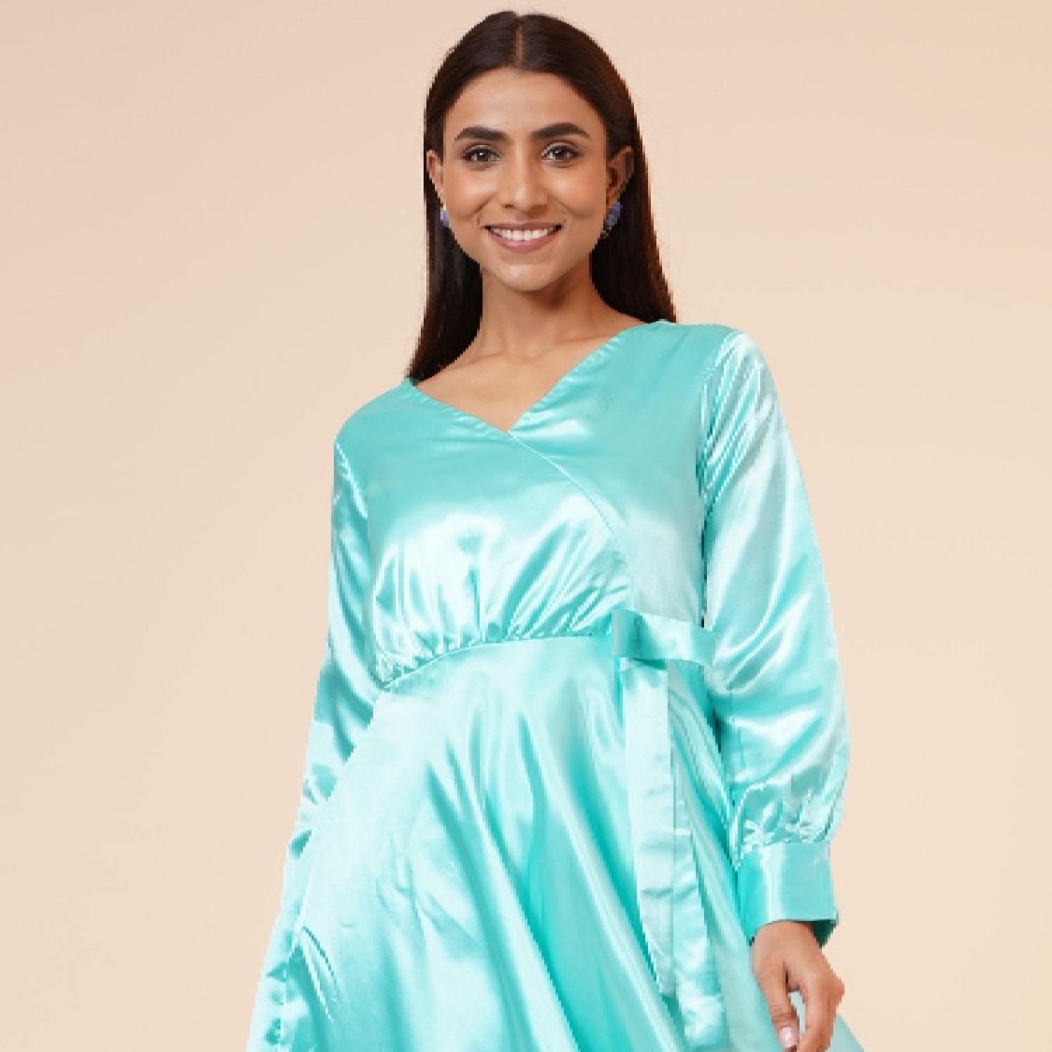 ₹ 1,500 (20% off)This beautiful aqua-blue dress is crafted from luxurious satin fabric. The empire line design creates a flattering high waistline, enhancing your figure and giving you an elegant silhouette. It features a stylish ribbon drape and a knee-length hem, making it a versatile option for various occasions. The dress is lined with hosiery fabric and offers a regular fit, providing all-day comfort.