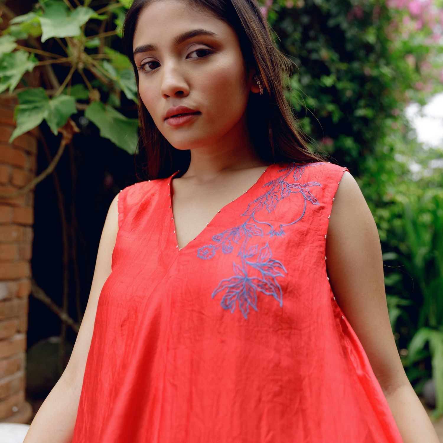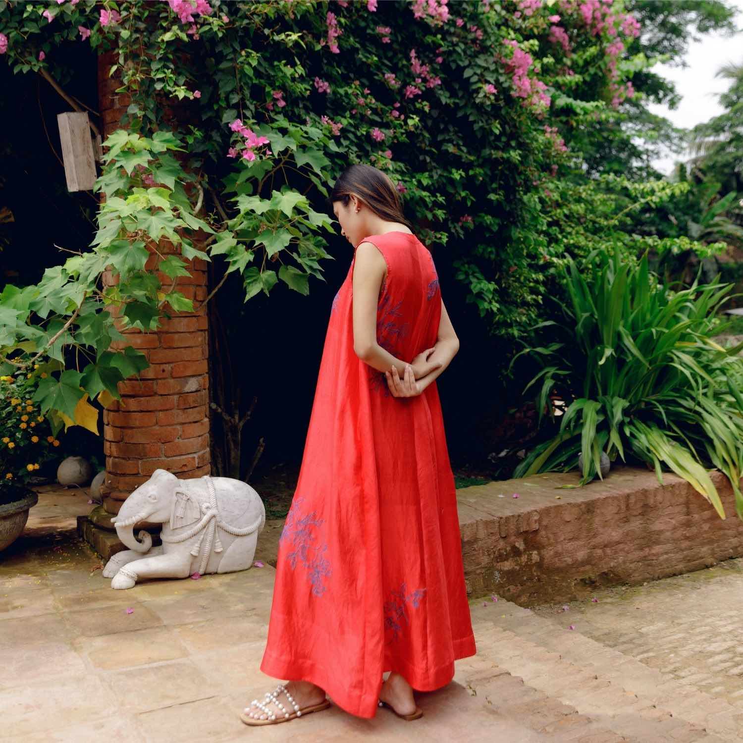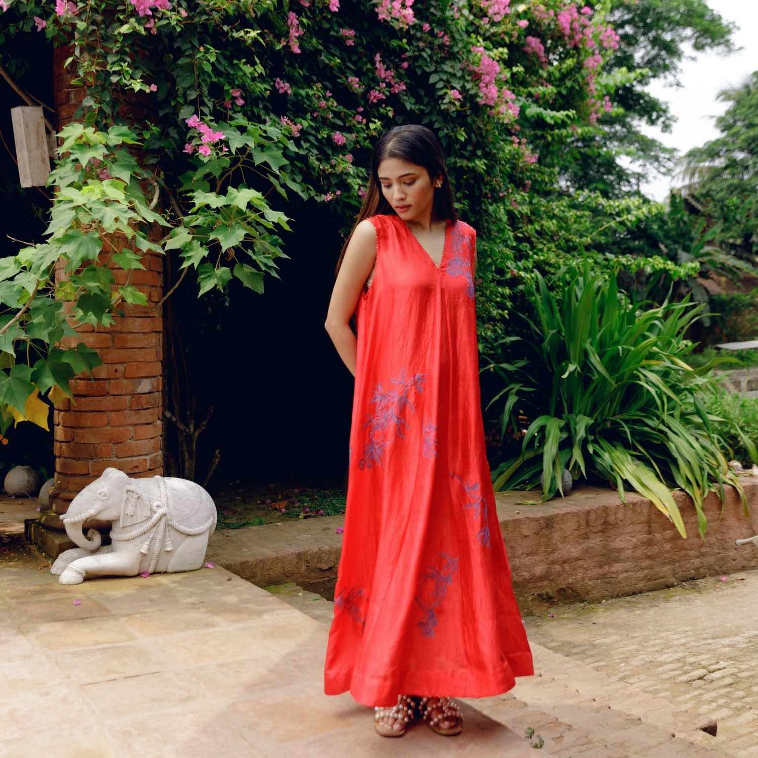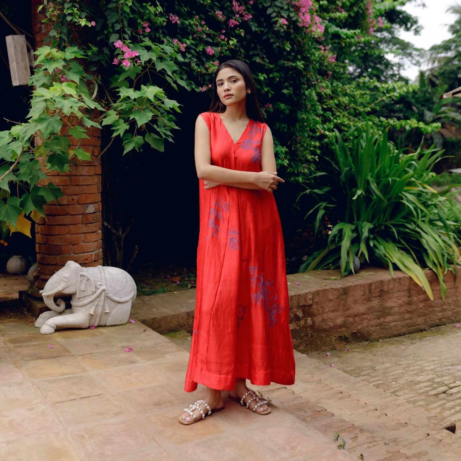 This red-flared handwoven mulberry silk sleeveless midi dress is adorned with delicate metallic beads and contrasting pomegranate blue motif embroidery. It features large, roomy pockets.