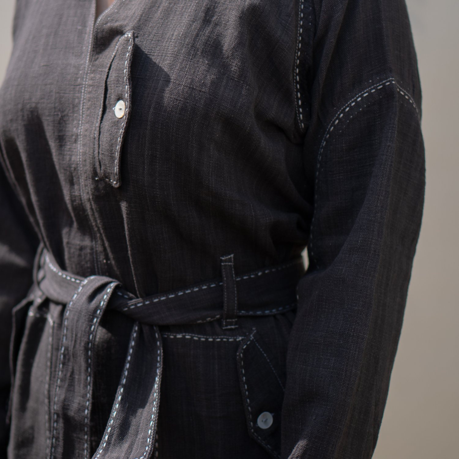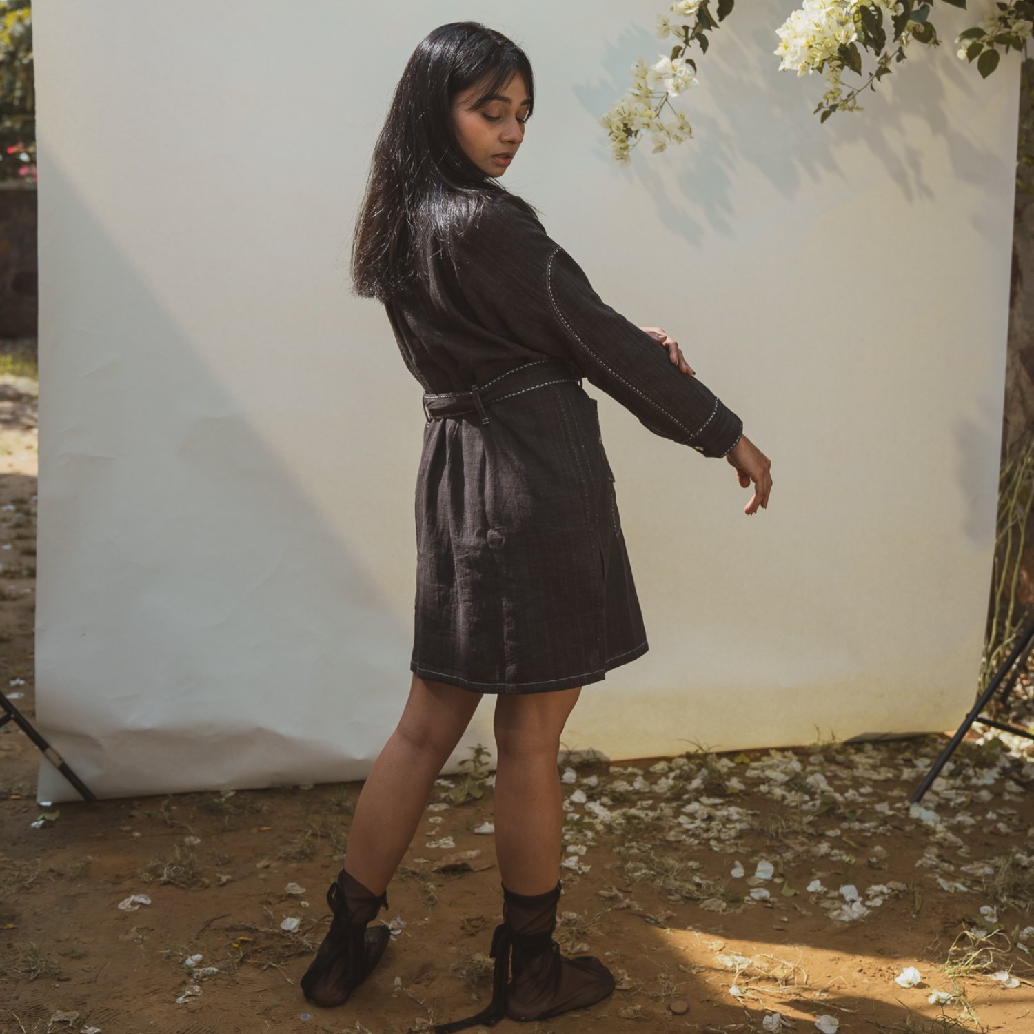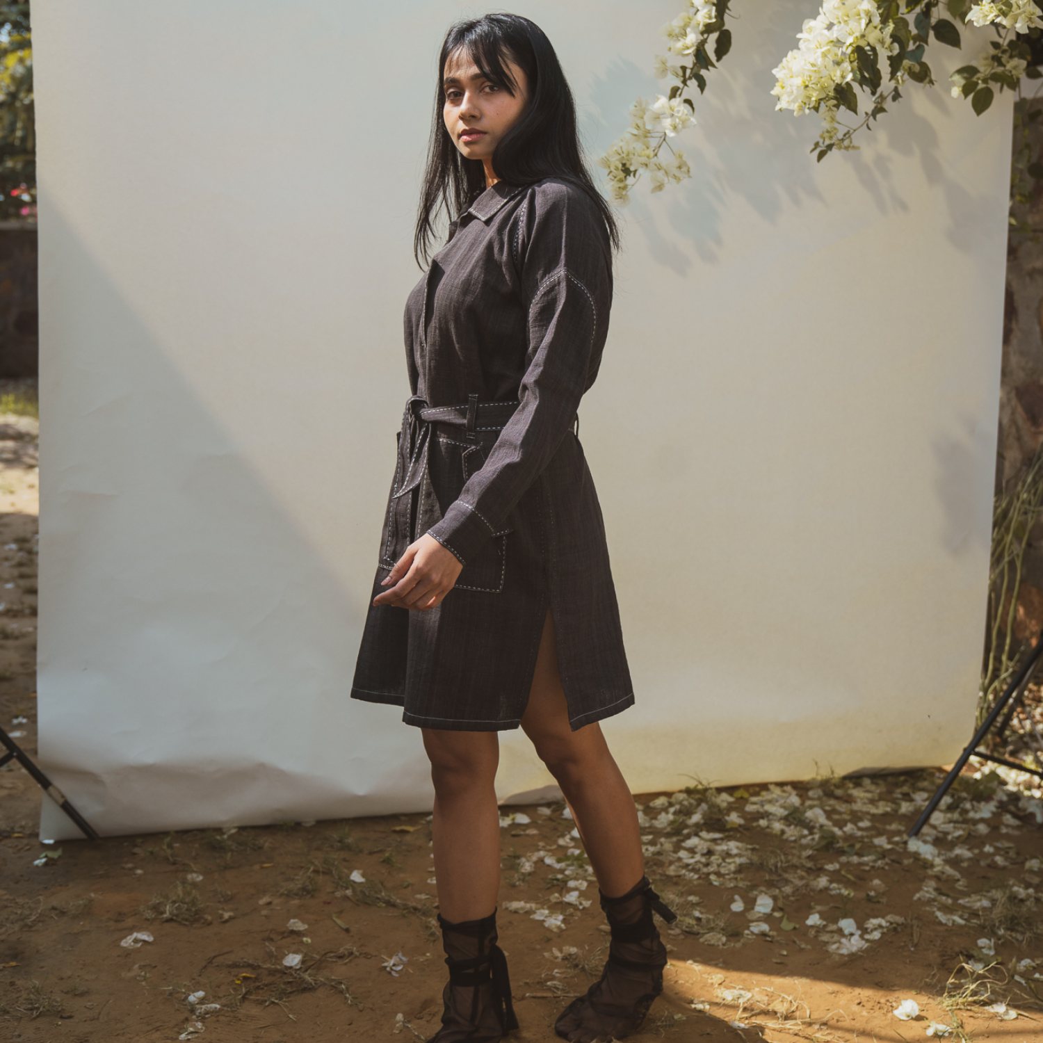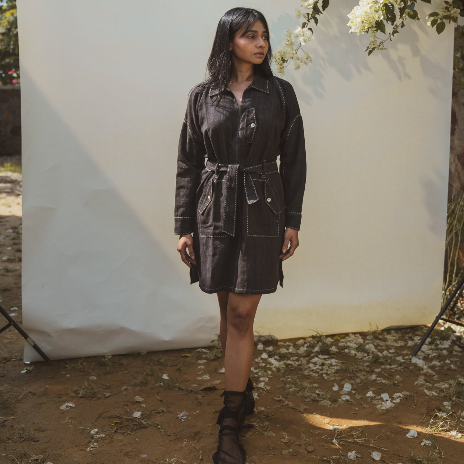 ₹ 15,499 (20% off)Crafted in high-quality cotton, this black dress follows the edgy and versatile bomber style. It features an interesting play of paneling and stitch lines, adding depth and texture to the design. The dress comes with an adjustable belt that allows you to cinch the waist, providing a flattering and customized fit. Pair it with delicate earrings and strappy heels for a dressy evening event.