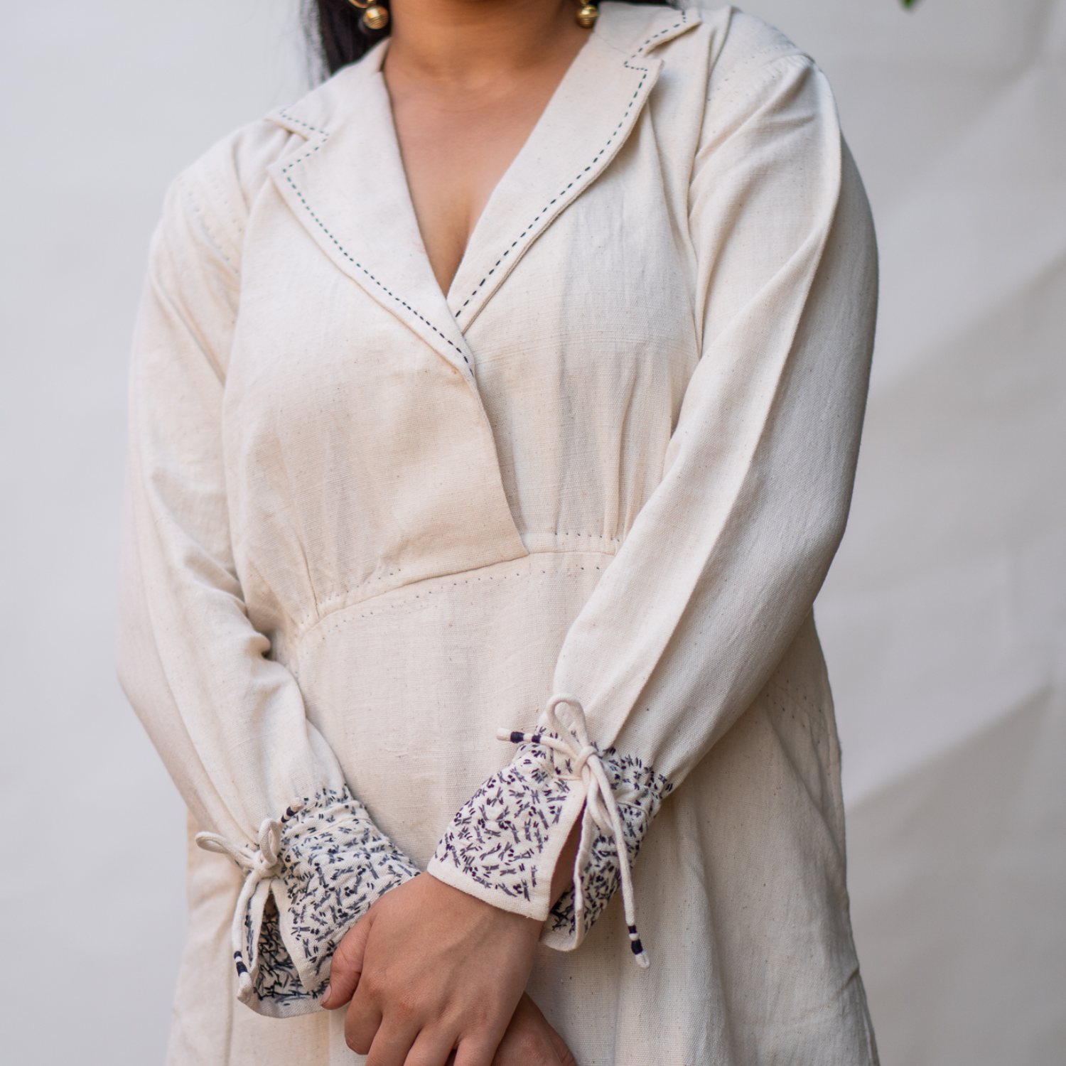 ₹ 14,999 (20% off)This beautiful dress follows a classic and timeless silhouette. Slight gathers at the waist give the dress a graceful flare and the cuffs are intricately embroidered with a modern twist of classic running stitches and French knots. The dress features side pockets and is adorned with mother-of-pearl buttons, exuding elegance. Pair it with delicate jewellery and contrasting boots for a dressy day soiree.