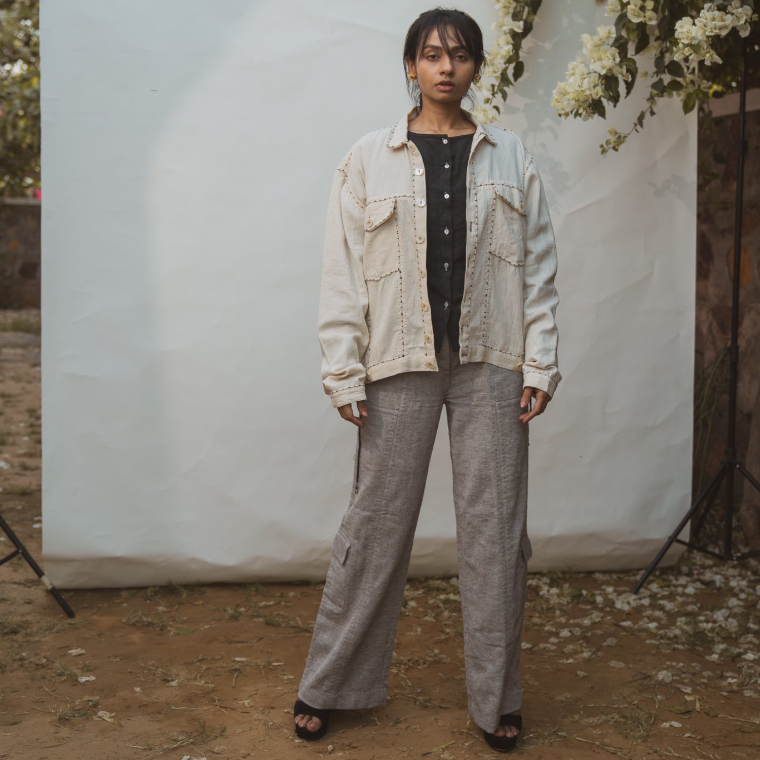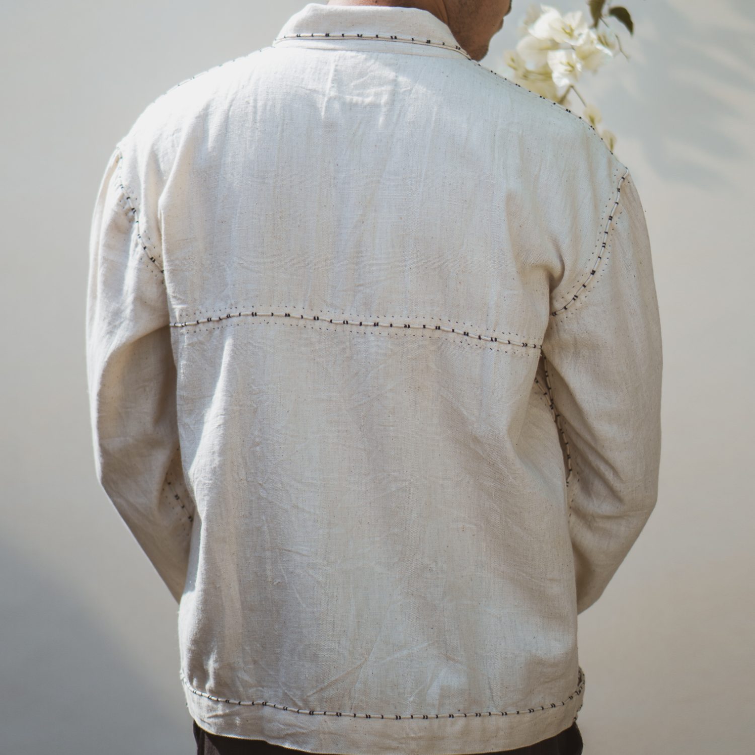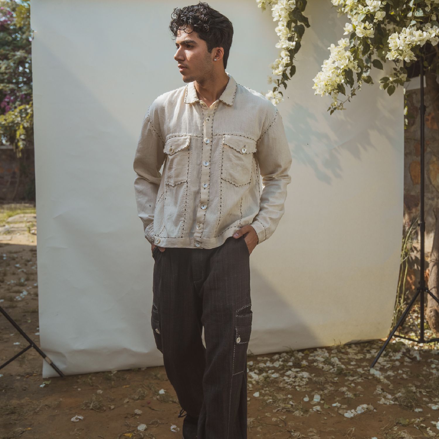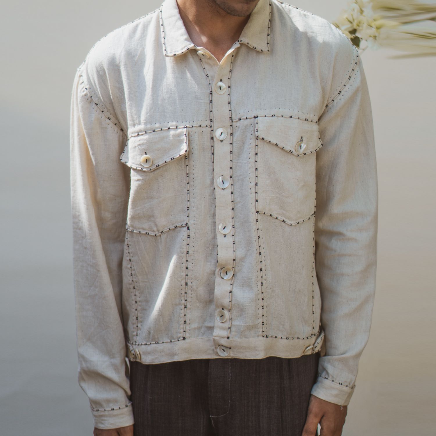 ₹ 13,499 (20% off)Crafted from the finest cotton, this bomber jacket offers a unique and experimental take on fashion. It features a shirt collar, flap pockets, and statement buttons, adding a distinctive character to the look. The panels and pockets are adorned with the couching technique of embroidery, adding intricate detailing to the design.