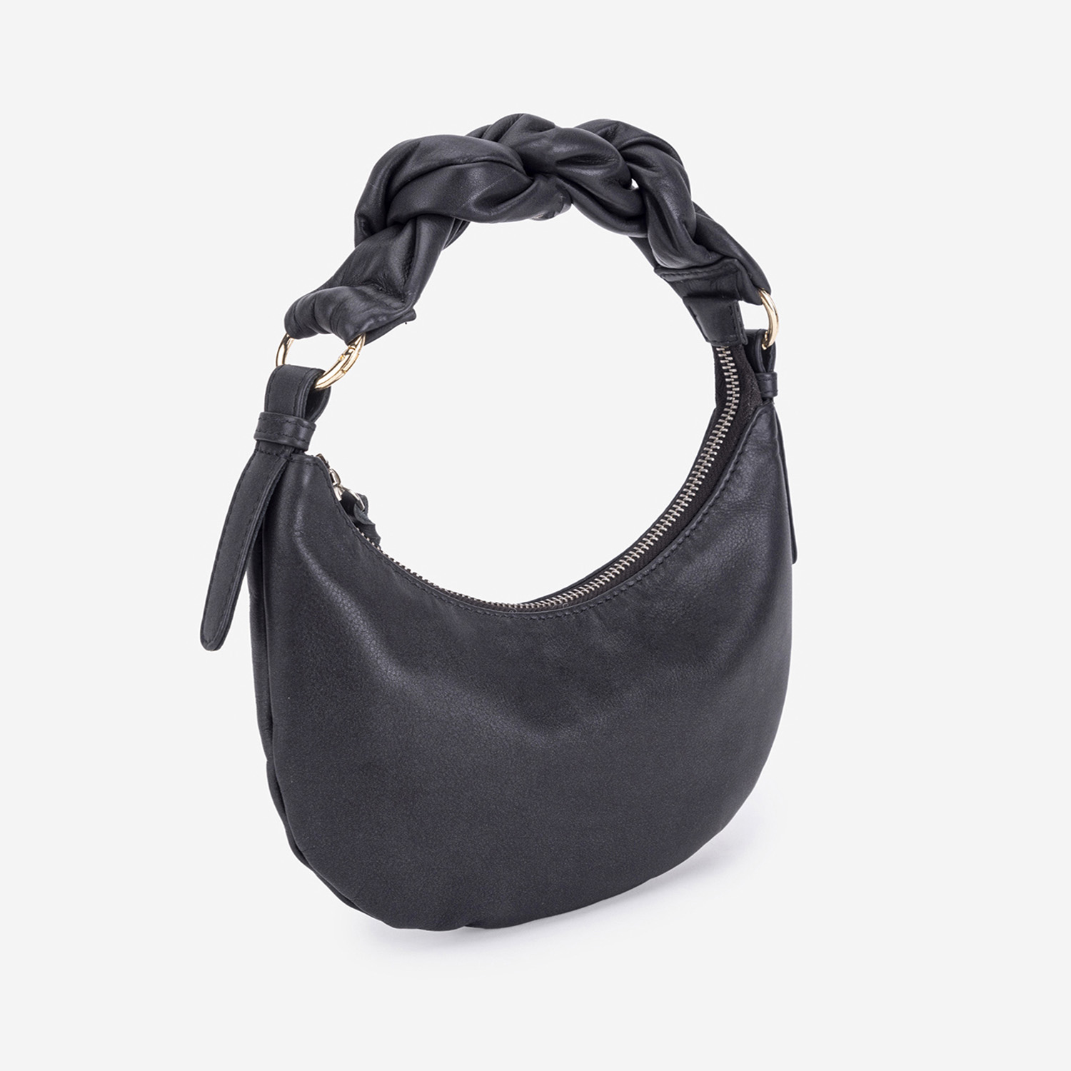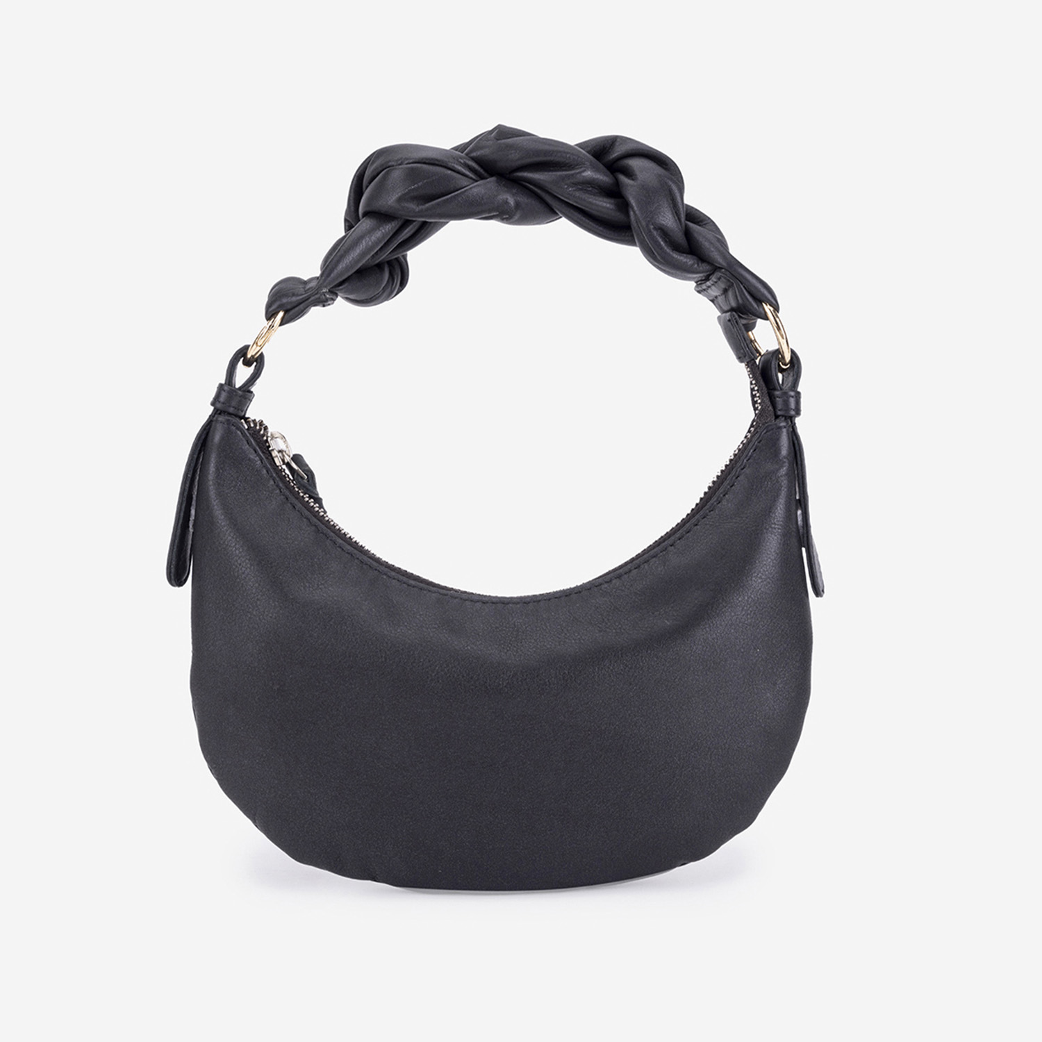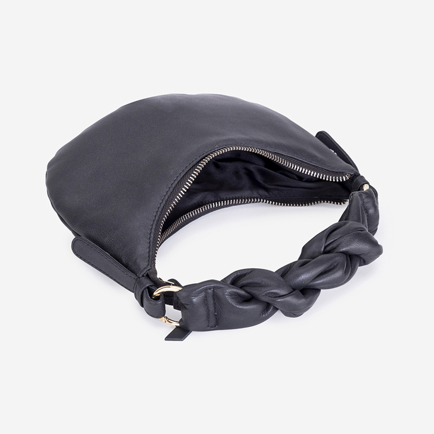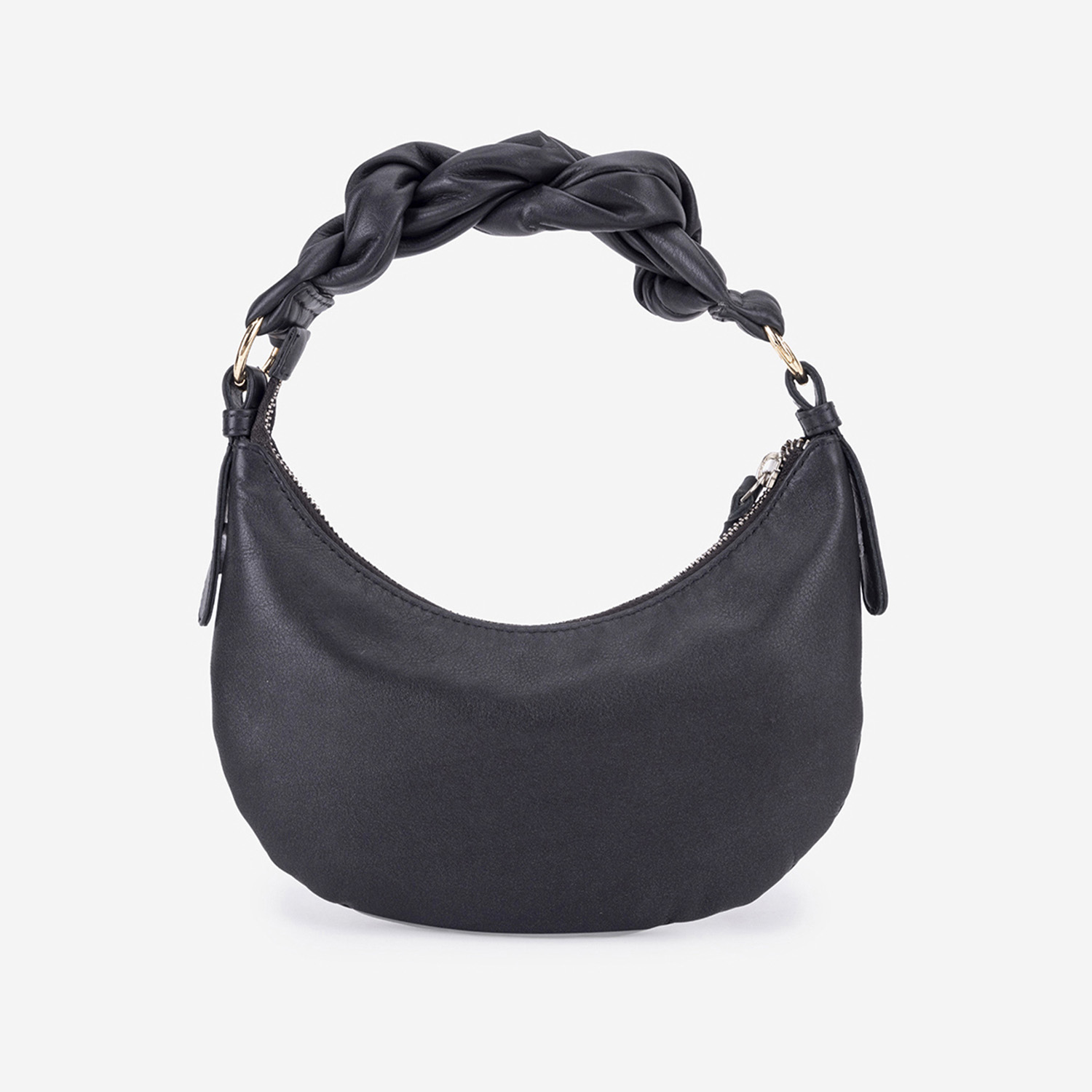 This leather hand bag features a classic color and a braided strap design. The zipper closure ensures the security of your belongings. Style it with a retro-style dress and classic pumps for a dressy day out.