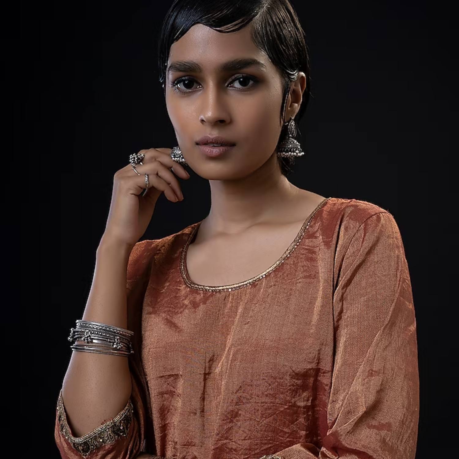 ₹ 24,700 (10% off)This kurti set combines rust kurta and gharara with a moss green handwoven dupatta. The half-sleeves short kurti has fine metal dabka and tikki work, creating a shimmering effect. The handwoven dupatta is adorned with tikki and kasab work and fine metal zari accents, creating an interplay of textures and colors that beautifully complements the set.
