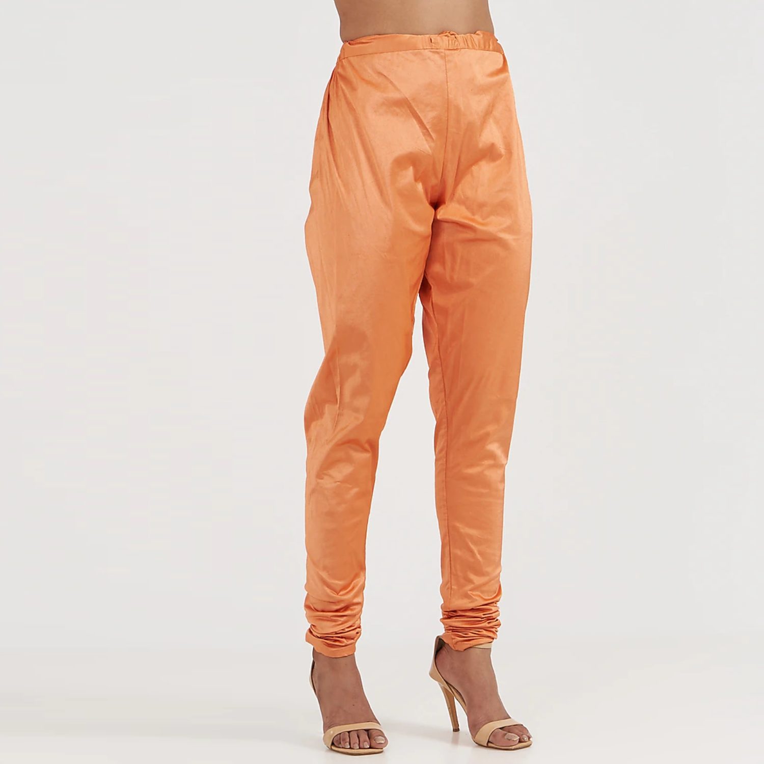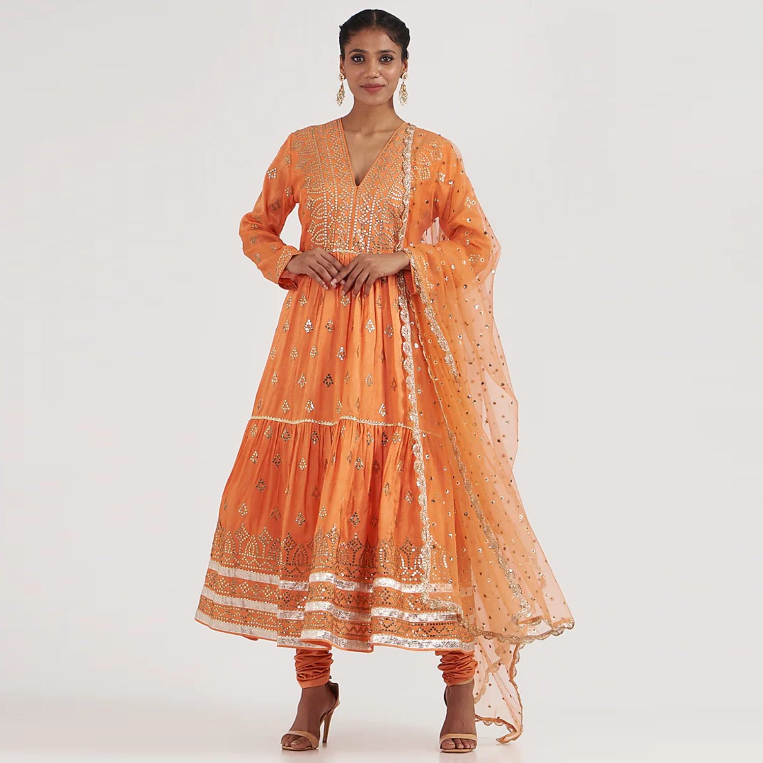 This vibrant orange embellished kurta features a deep V neckline, frilled hemline, and full sleeves. It is paired with a comfortable and stylish lycra churidar and a three-sequin net dupatta that drapes gracefully. Pair it with statement gold jhumkas and metallic heels for weddings or festivities.